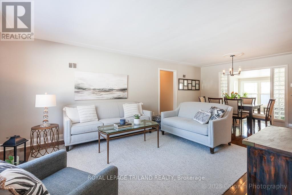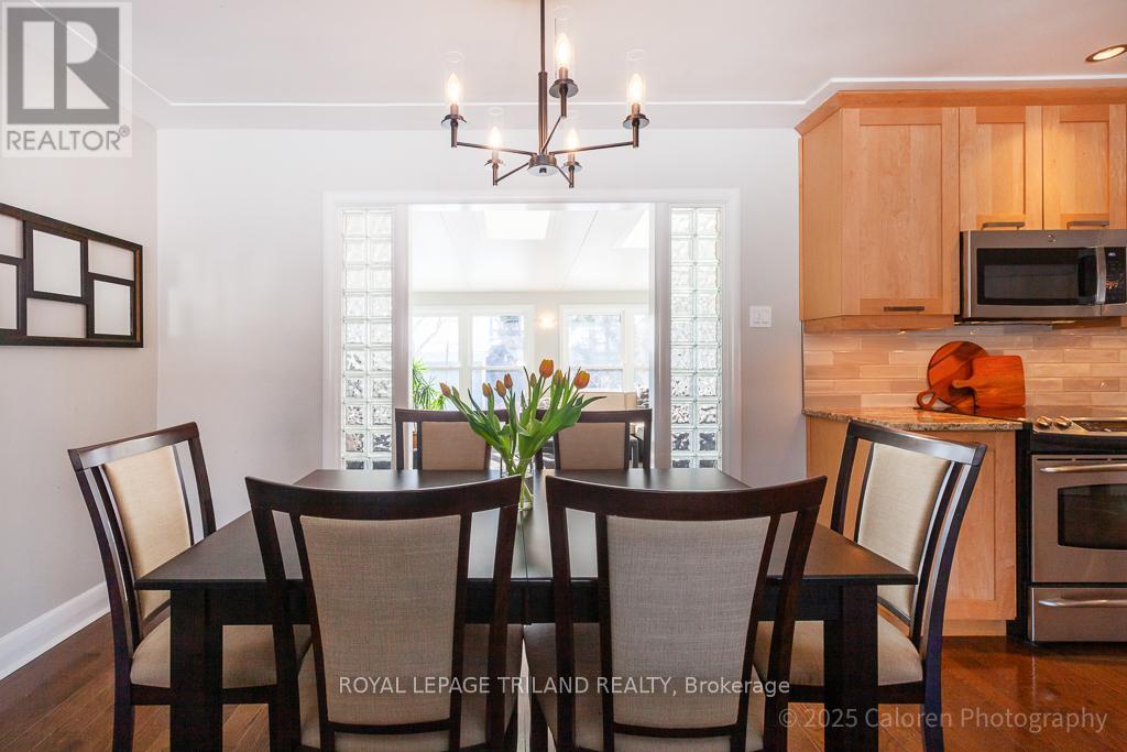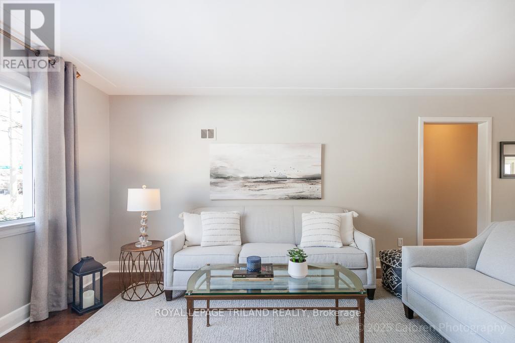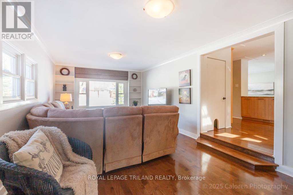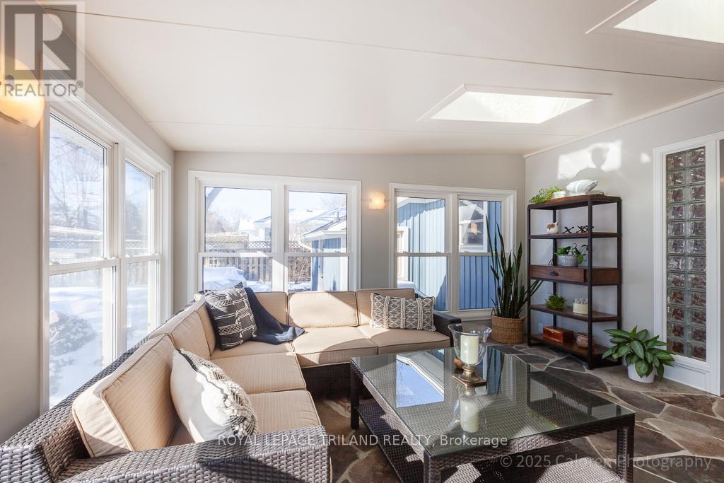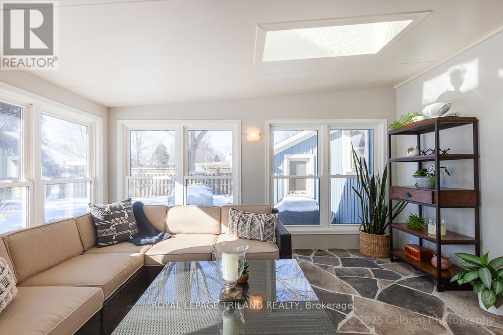 Live in the heart of lovely Lambeth at 75 David Street, a beautifully maintained, one of a kind bungalow set on a quiet, mature, tree lined street. This attractive two bedroom, two bathroom home has been thoughtfully updated & impeccably cared for, offering a distinctive layout that blends comfort, style, and everyday functionality. Ideally located, you are just steps from schools, local cafés, boutique shops, parks & scenic trails, with convenient highway access for an easy commute. Enjoy Lambeth's welcoming community atmosphere in one of its most desirable & established neighbourhoods. Inside, the main floor features an inviting living & dining area highlighted by a large picture window & gleaming hardwood floors throughout, with no carpeting. The bright gourmet kitchen offers solid maple cabinetry, granite countertops, a ceramic backsplash, and a spacious island with additional storage, making it ideal for both daily living & entertaining. The open concept design flows into a stunning south facing sunroom with three walls of windows, two skylights, and a flagstone floor, creating a light filled retreat to enjoy year round. A comfortable main floor family room with built-in shelving & storage provides the perfect space for relaxing or gathering, while the generous laundry room includes extra storage & a convenient folding counter. The renovated main bathroom features granite countertops, ceramic flooring, a glass shower, and double sinks, while updated windows & doors enhance energy efficiency. Outdoors, the property is a gardener's delight designed for low maintenance living, with landscaped perennial gardens supported by an in ground sprinkler system. Two flagstone patios, a stamped concrete front porch, a custom pergola, and two tranquil water features create an exceptional setting surrounded by mature trees, ideal for dining & entertaining. Parking is plentiful with a double car garage, attached shed, concrete double driveway, and a second paving stone drive. (id:64974)