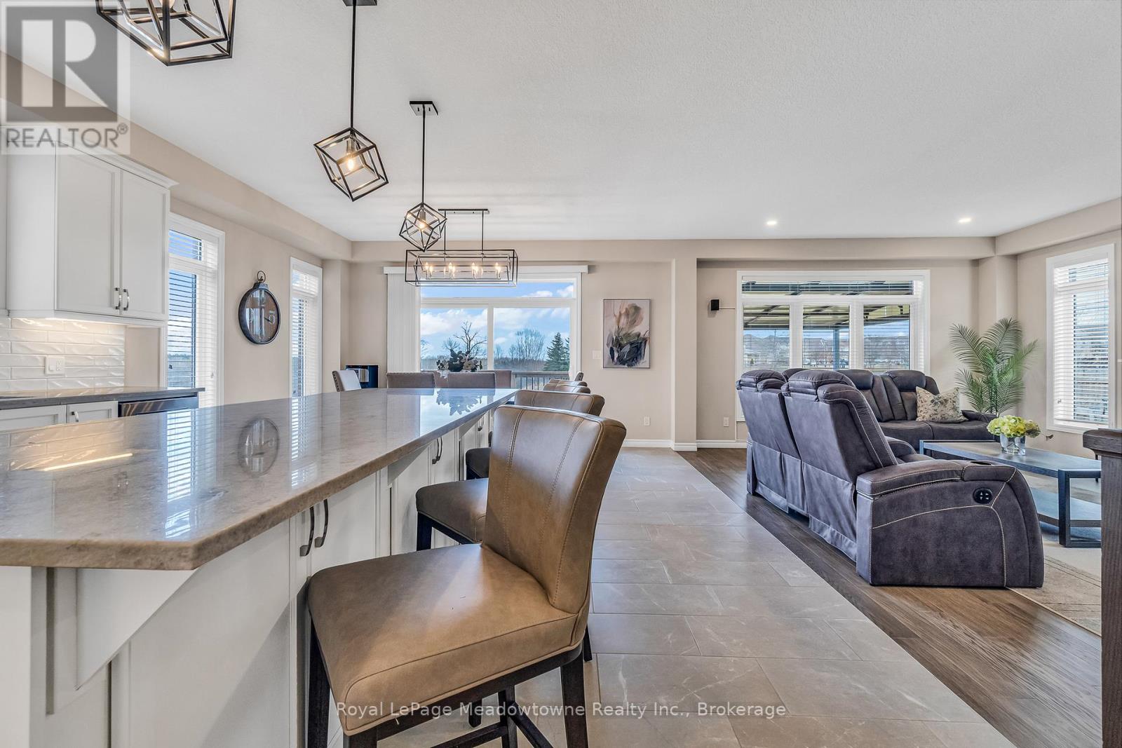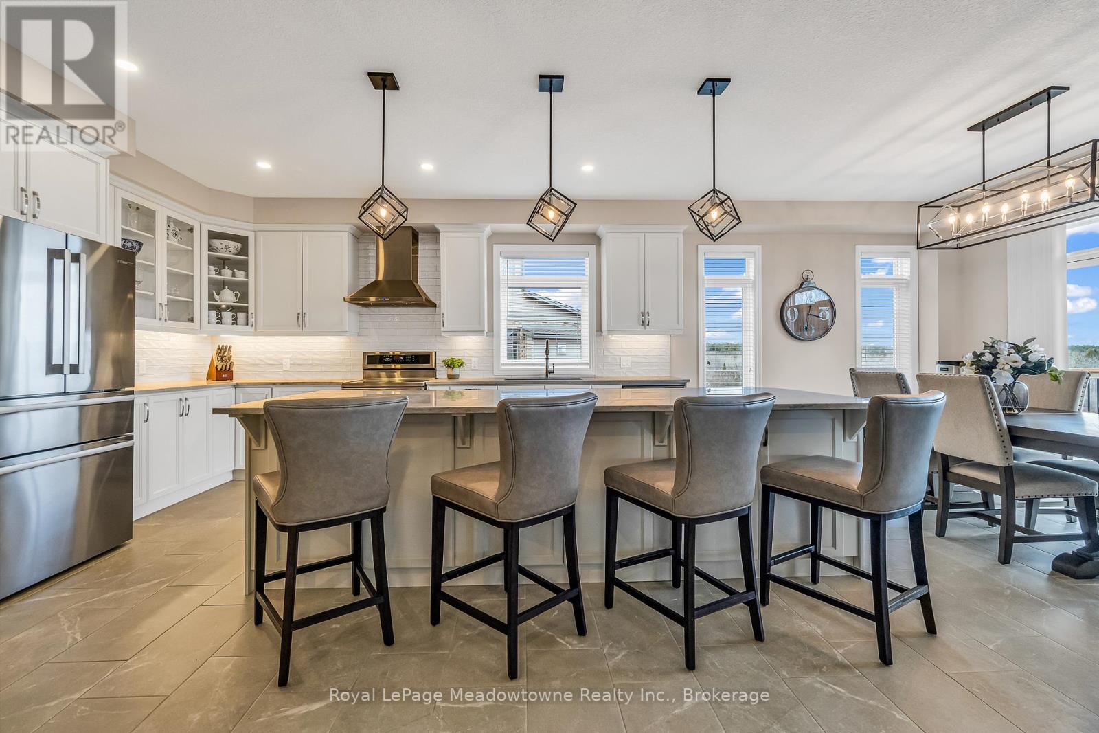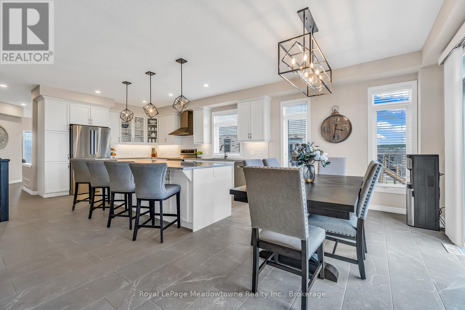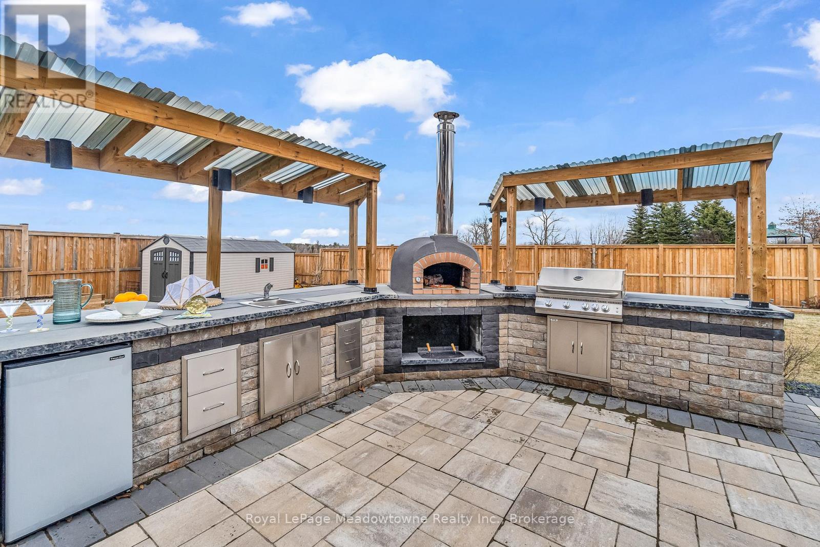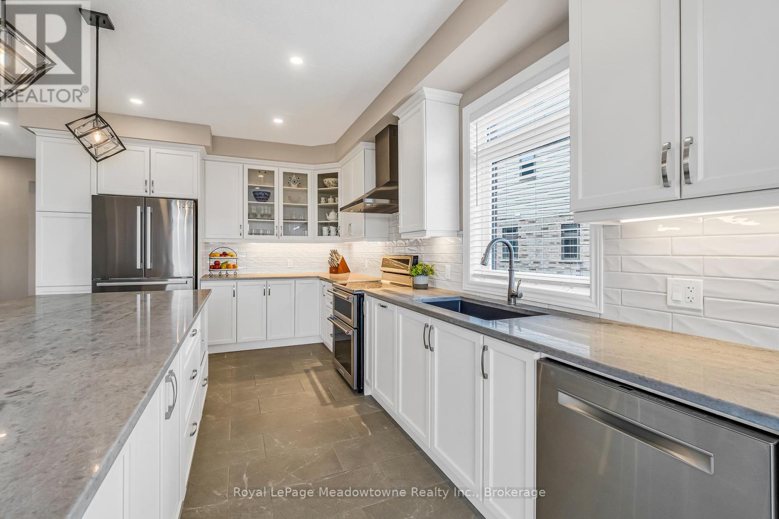 Perched proudly on a premier corner of Norma Crescent, this custom-built Reid's Home is a rare find, blending high-quality construction on an oversized pie-shaped lot that backs onto the lush greenspace & park. The home is designed for those who love to entertain. The main level boasts 9ft ceilings and a spacious 2500+ sq. ft. layout. The gourmet kitchen is a showstopper, featuring: Crisp white cabinetry & subway tile backsplash, premium Bosch S/S appliances & sleek granite counters, massive center island and breakfast bar that seamlessly flows into the family room, anchored by a cozy gas fireplace and views of the forest beyond. Retreat upstairs to a primary suite that feels like a high-end hotel. Enjoy large windows overlooking the trees, a walk-in closet with a laundry chute, and a spa-like ensuite featuring double sinks, a corner jet tub, and a walk-in glass rain shower. Three additional generously sized bedrooms provide plenty of space for family, guests, or a dedicated home office. The finished walk-out basement is the ultimate space. With 9ft ceilings, a full bath, and a separate entrance, it's perfect for a media room, gym, or guest suite. But the real magic happens outdoors. Step out from the dining room onto the 30x10 balcony for panoramic views, or head down to the extensive paver patio. This is no ordinary backyard- it's a culinary oasis featuring: a custom pizza oven and built-in grill station, prep area with sink, beverage fridge & ample storage, a fenced yard with a large powered storage shed. From the heated driveway (no more shoveling), to the quick access to hiking trails and the proximity to Guelph Lake, this home is a haven for nature lovers. Whether you're hosting a summer pizza party or enjoying a quiet morning stroll through the conservation trails, this property offers a level of convenience and sophistication that is hard to match. Don't settle for the ordinary. Come home to quality, nature, and the perfect space to gather. (id:64974)