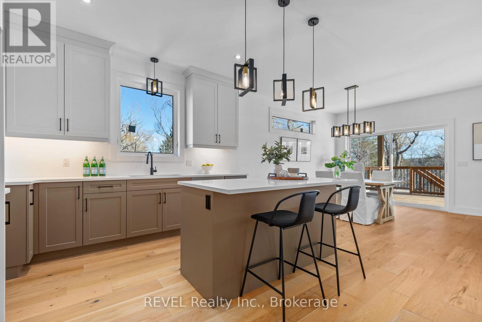 Set on a truly exceptional private lot, gently embraced by a picture-perfect babbling brook, this stunning Oak Homes custom-designed bungalow seamlessly blends modern municipal conveniences with the serenity of a country retreat, backing onto lush and private green space. Spanning 1,500 sq. ft., this thoughtfully crafted home features a host of luxurious upgrades. The spacious primary bedroom boasts a walk-in closet, a spa-like 5-piece ensuite, and patio doors leading directly to a large back deck, perfect for relaxing or entertaining. No detail has been overlooked, with high-end finishes throughout. The home features 9-foot ceilings, upgraded large trim, engineered hardwood flooring, sleek quartz countertops, and a contemporary linear fireplace. The open-concept layout offers a gourmet kitchen with abundant cabinetry, a central island with breakfast bar, and convenient pantry storage. Enjoy the ease of main floor laundry and a mudroom located off the attached two-car garage. The bright dining room is highlighted by an 8-foot patio door that opens onto a spacious covered elevated deck, complete with pot lighting and a ceiling fan ideal for outdoor dining and relaxation. Imagine transforming the large backyard into your own private oasis. The unfinished basement is roughed-in for a potential in-law suite, offering the flexibility for multigenerational living or additional rental income, and includes a direct walk-out to a lower level deck. This home offers the perfect balance of modern living and tranquil surroundings. Welcome to your lifestyle living experience. FULL TARION WARRANTY. Taxes to be assessed. ***NOTE: Some exterior photos have been virtually enhanced. (id:64974)