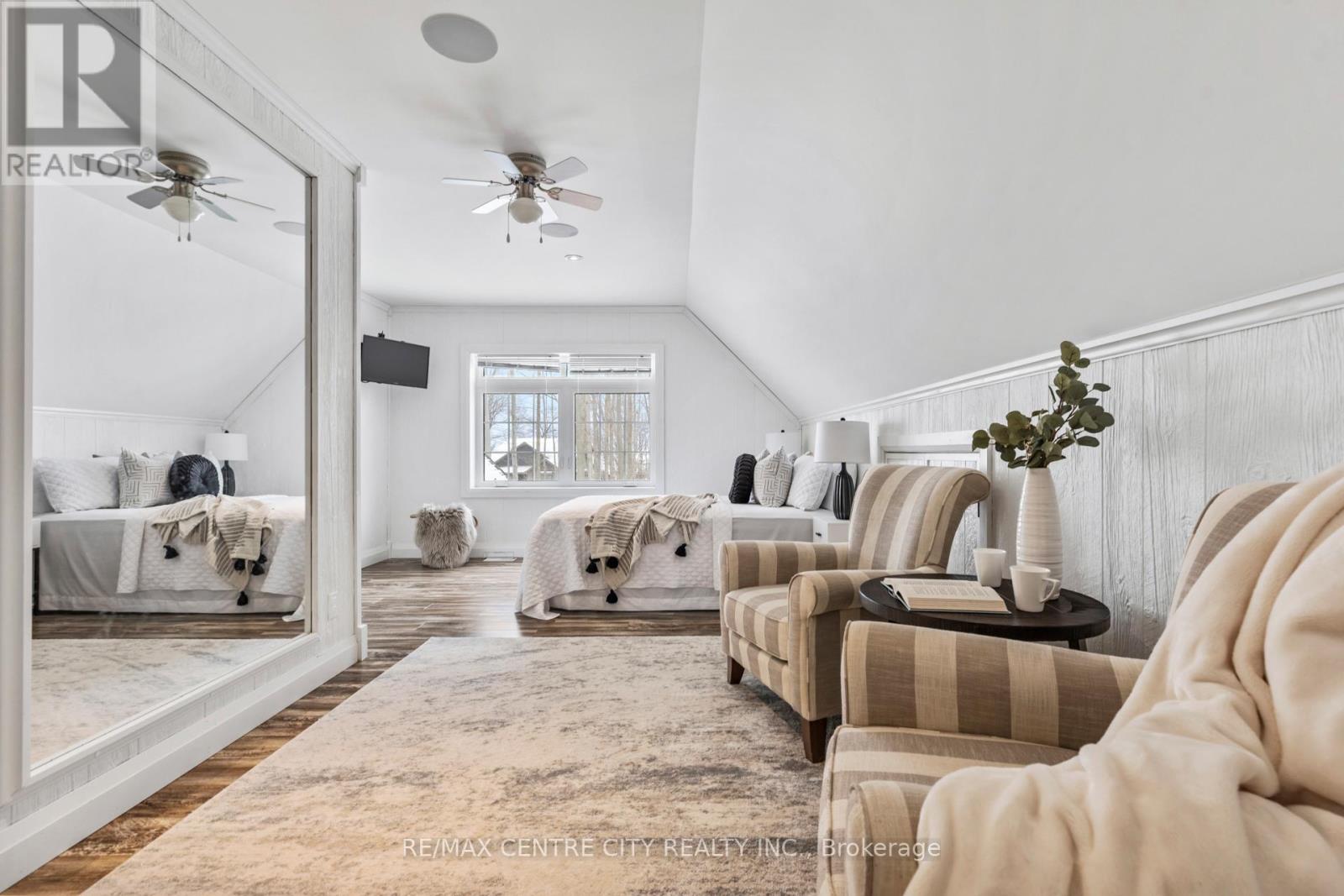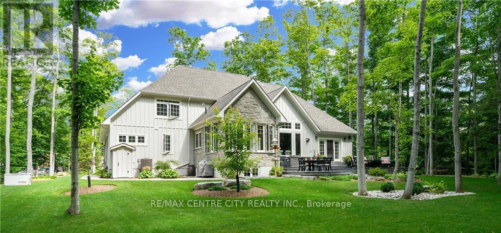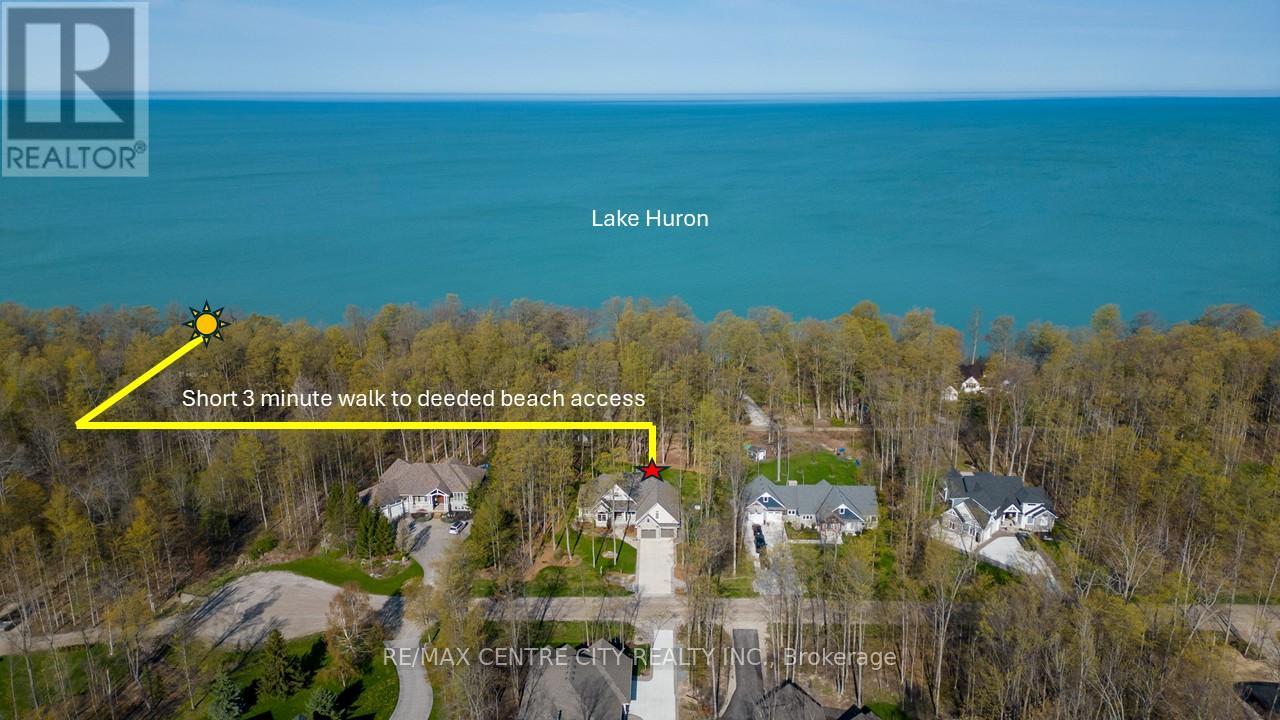 Captivating Beach Home!75335 Maxobel Rd is sure to impress with its striking design, quality construction & detail second to none set amongst a mature .64 acre backdrop of tall trees,lush landscaping while only steps to the sandy shores of Lake Huron! This property is perfect for entertaining guests and family with 6 bedrooms & 2.5 bathrooms & a large concrete driveway for guest vehicles.A spacious entry invites you to an open concept living space with 16 ft ceilings in the light-filled great room featuring a wall of windows & stone fireplace.Bright elegant kitchen with quartz countertops,stainless steel appliances,gas stove & spacious eating area surrounded by large windows.Main floor master bedroom retreat features a luxurious ensuite washroom with heated floors,large soaker tub & a double-headed glass shower.Also on the main floor,a guest bedroom,2 pc bathroom & laundry.Two access points from inside the home to the double car garage with upgrade hydro for electric vehicles/heavy equipment,handy separate storage room with garage door side yard for tools/lawnmower.Upstairs offers two over-sized bedrooms with plenty of natural light & space to utilize.Open concept fully finished lower level has 9ft ceilings,heated floors,large living room,wet bar with bar fridge,two spacious bedrooms & a luxurious 4pc washroom with double vanity & glass shower.Plenty of storage in this home.This home is equipped with a generator fueled by natural gas,a security system,is on municipal services for water and sewers..It also has 8 zones wired for sound system inside & outside.Relax on the expansive composite rear deck while taking in the tranquil setting surrounded by the tall majestic trees.The rear yard also features an outdoor shower for washing off from the sandy beach visits (deeded access mere steps away),a custom tree house with zip line. Located minutes south of the beautiful town & marina of Bayfield, ON.Don't miss your opportunity to own this stunning piece of real estate! (id:64974)