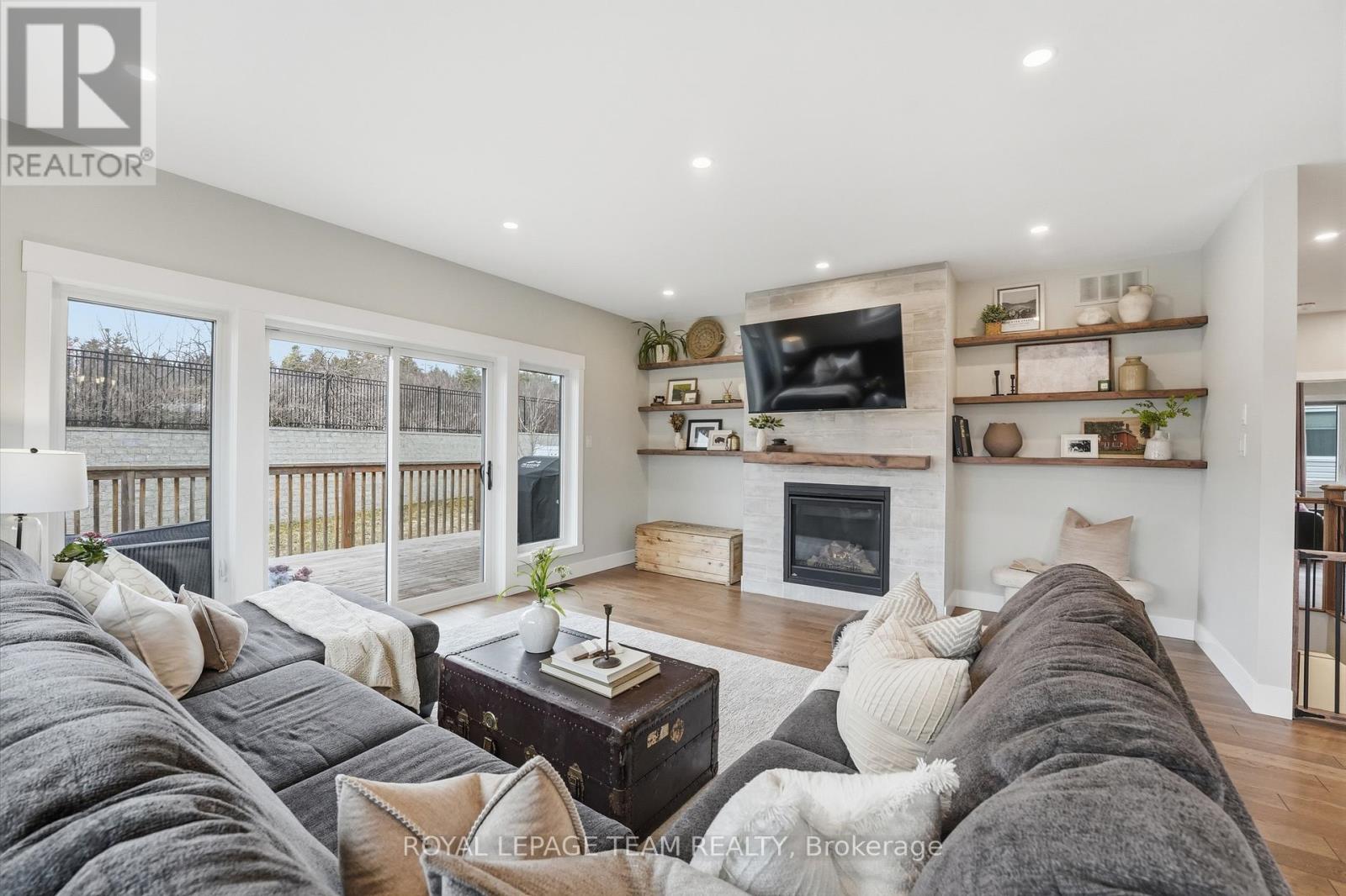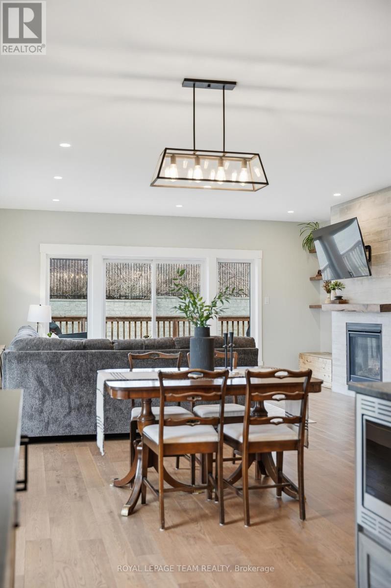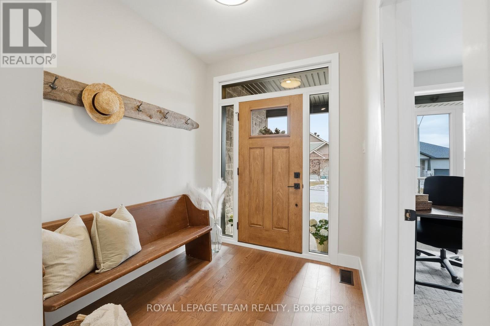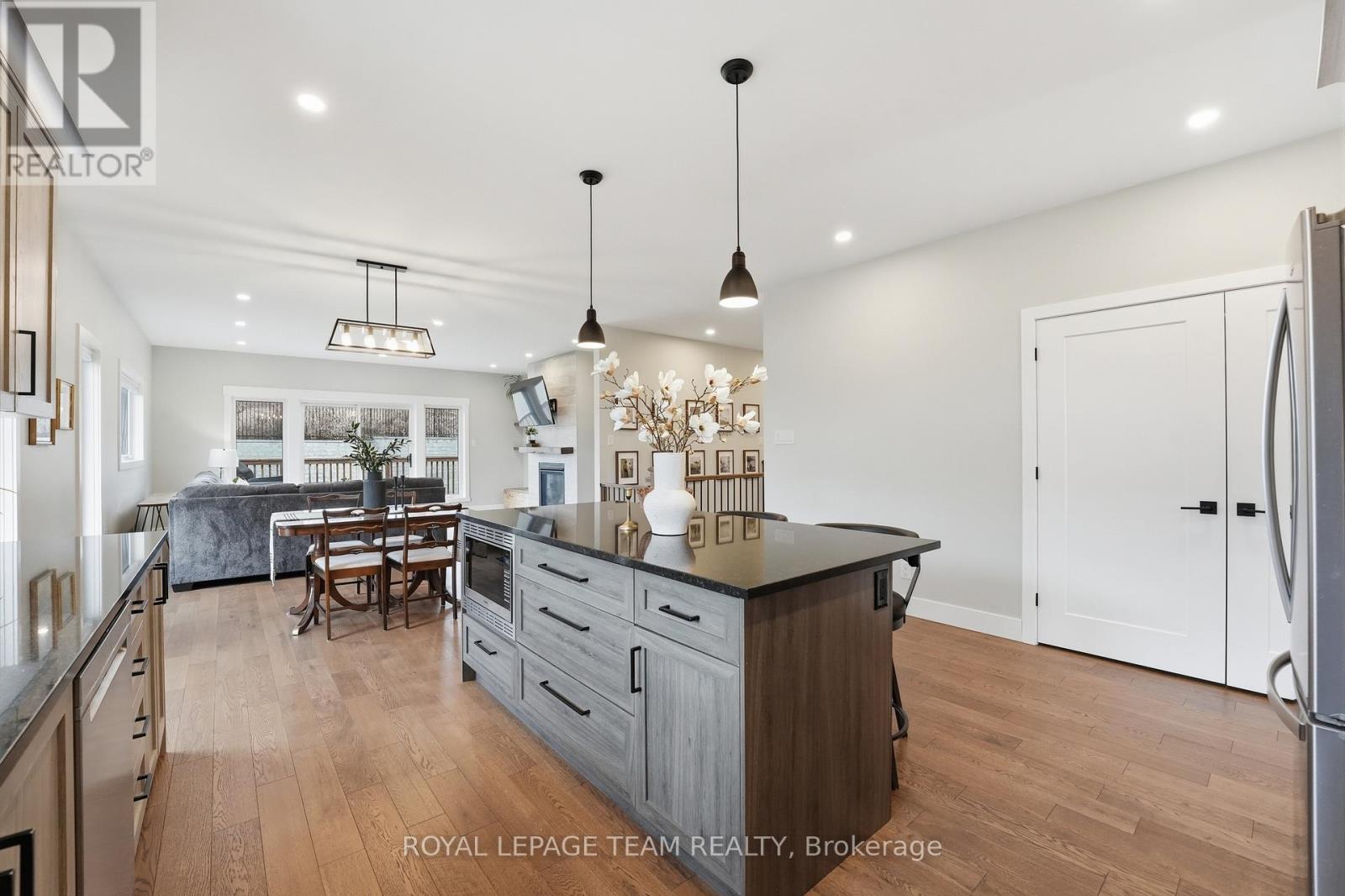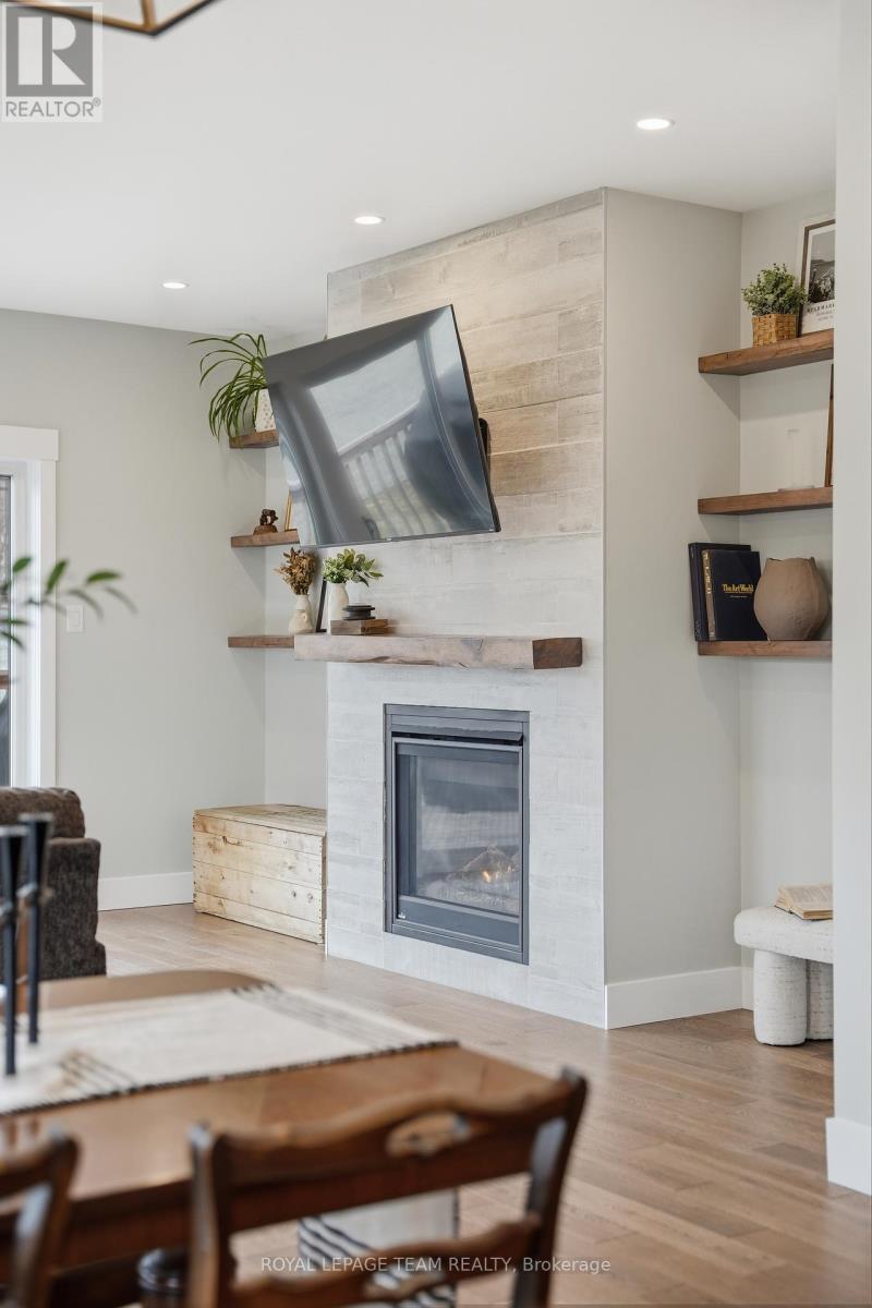 Welcome to this thoughtfully designed detached 4 bed, 3 full bathroom bungalow on a family-friendly street in the village of Carp. Built in 2019, this home offers modern finishes & exceptional comfort for today's lifestyle. Step inside to discover 9ft ceilings throughout, including the fully finished basement. The main floor has an effortless flow & showcases elegant engineered hardwood flooring throughout. The bright, open-concept living space is anchored by a gas fireplace w/ custom shelving & mantle. Just off the living room is the dining room & stylish kitchen w/ granite countertops, soft-close cabinetry, backsplash, & pantry. This level has 3 bedrooms, 1 being a primary retreat w/ walk-in closet & 3-piece ensuite w/ a glass shower, granite countertop & in-floor heating. This level is complete w/ 2 more bedrooms, a 3 piece family bathroom w/ granite countertops & tub then down the hallway is a convenient main floor laundry room w/ sink & access to the 2 car heated garage which adds everyday practicality. Down the hardwood stairs w/ upgraded banister & spindles, the finished basement (2024) extends your living space w/ another large bedroom, 3 piece bathroom, 3 storage closets (1 w/ barn door) & a large rec room w/ laminate flooring & pot lights throughout. The basement is also roughed-in for radiant floor heating. Enjoy outdoor living on the back deck through the patio doors just off the living room, complete w/ a roughed- in natural gas BBQ hookup. Additional features include window covers on majority of windows, double car garage w/ natural gas heater & side entrance, smart thermostat & a well-equipped utility room w/ work bench, large cold storage, HRV, owned hot water on demand & 200 amp service. Located just a 2 minute walk from a park & all of Carp's favourites like Ridge Rock, Carp Creamery, Alice's Cafe, Twin Muses & the Carp Fairgrounds, this is a wonderful opportunity to enjoy modern bungalow living in a welcoming community. (id:64974)
