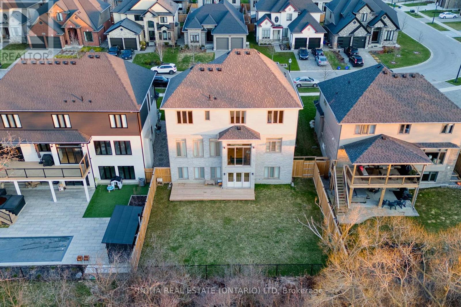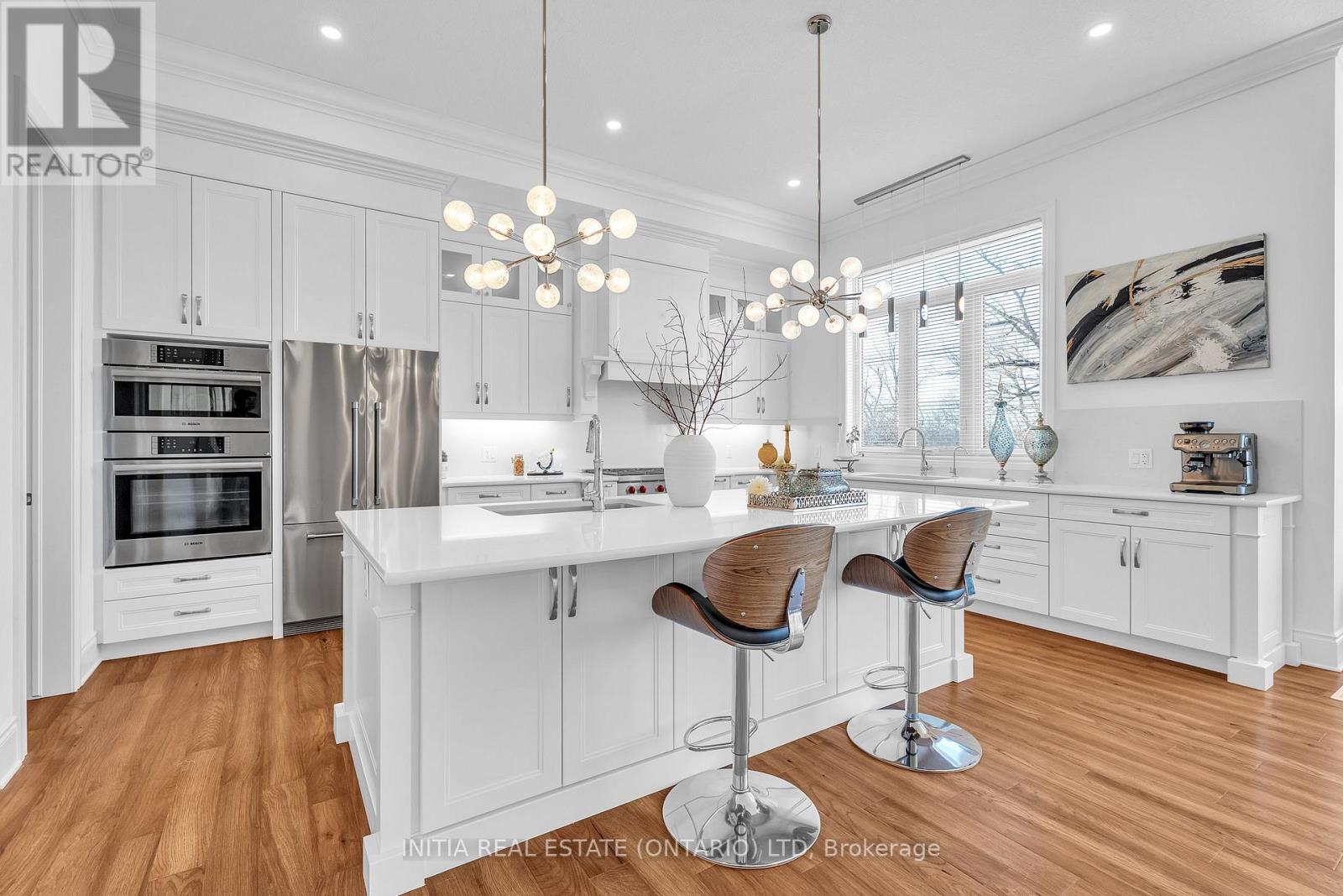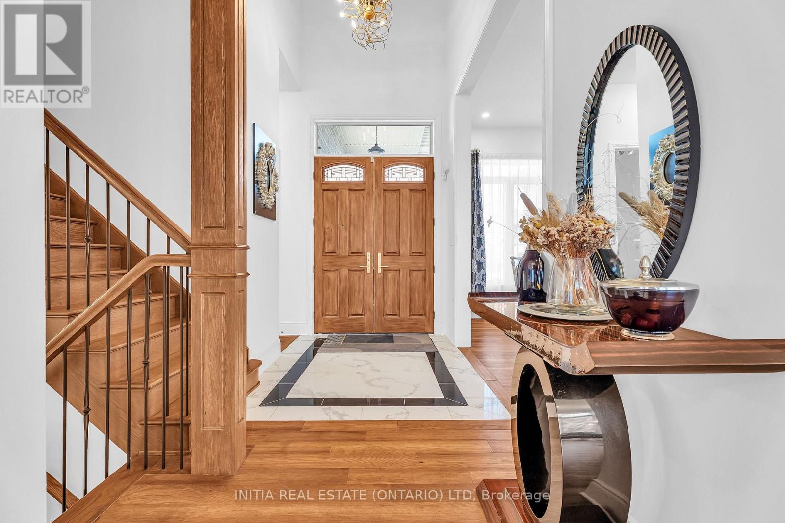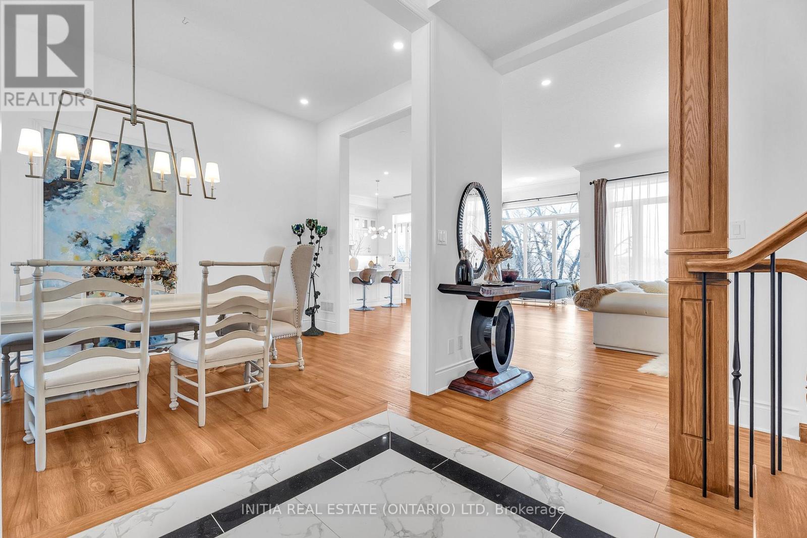 Experience refined living in this extensively upgraded home, where exceptional design, functionality, and space come together seamlessly. The striking exterior is matched by an equally impressive interior. Soaring ceilings-11 ft on the main floor, 9 ft on the second level, and 8.5 ft in the walk-out basement-create an airy, grand atmosphere throughout, while oversized windows and doors maximize natural light and openness.The main floor features a dramatic two-storey foyer with designer-patterned tile flooring. The chef-inspired kitchen is a true centerpiece, offering custom cabinetry, premium Bosch appliances, a six-burner gas stove with a designer-wrapped hood, and a large island perfect for entertaining. The adjacent family room includes a cozy fireplace, serene tree views, and abundant natural light. Wide crown moldings and tall baseboards add sophistication. Upstairs, four spacious bedrooms provide comfort and privacy. Two include private ensuites, while the others share a Jack-and-Jill bathroom. The primary suite boasts a luxurious 5-piece ensuite with heated floors and a large walk-in closet. A bright staircase with oversized windows and elegant curtains enhances the home's refined feel.The walk-out basement offers excellent versatility with a bright window wall, finished bedroom, rec room, and a private custom theatre. Rough-ins for a second kitchen and laundry make it ideal for multi-generational living or income potential. Set in a prestigious, quiet neighbourhood surrounded by mature trees and upscale homes, this property offers a perfect blend of luxury, comfort, and lifestyle flexibility. (id:64974)