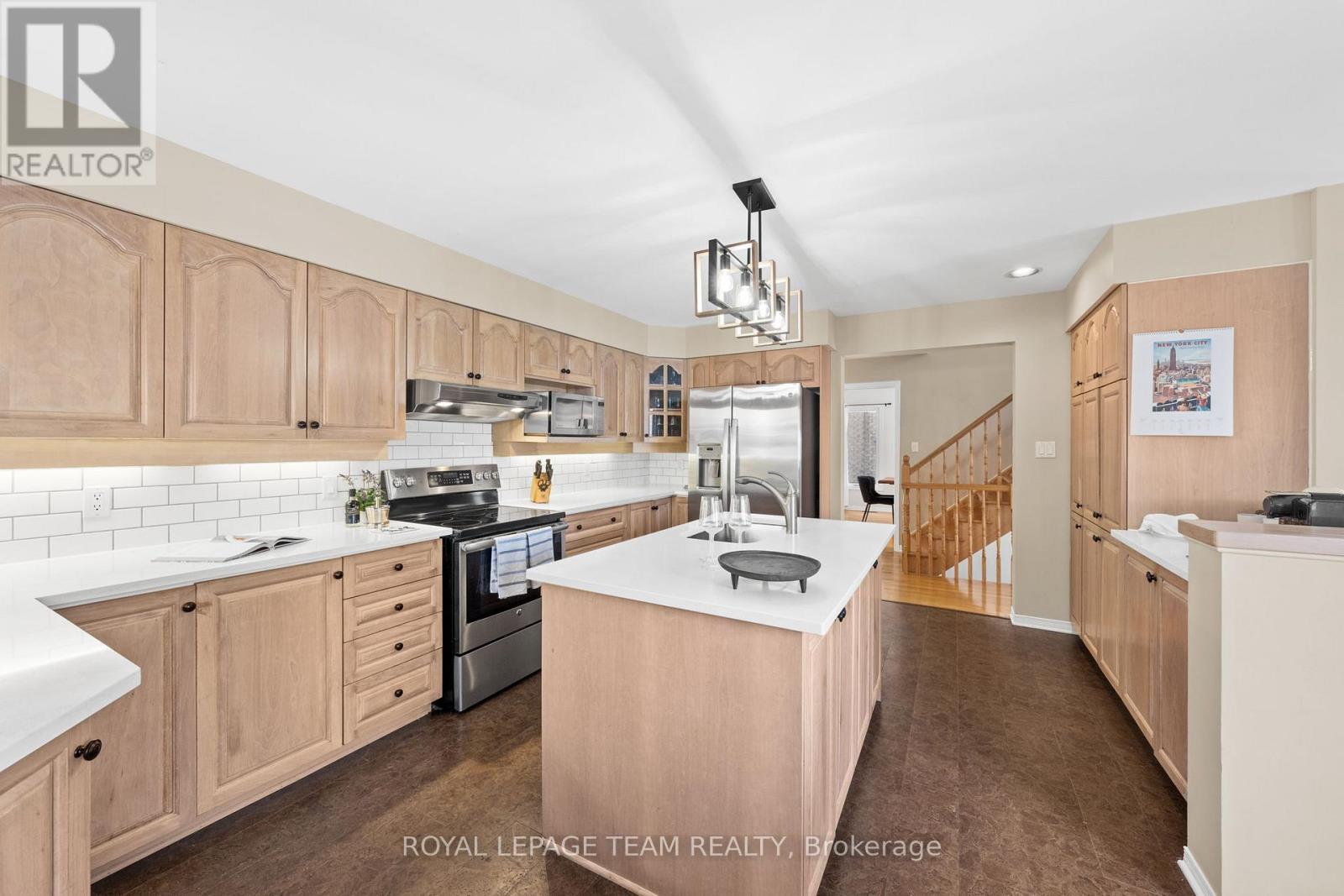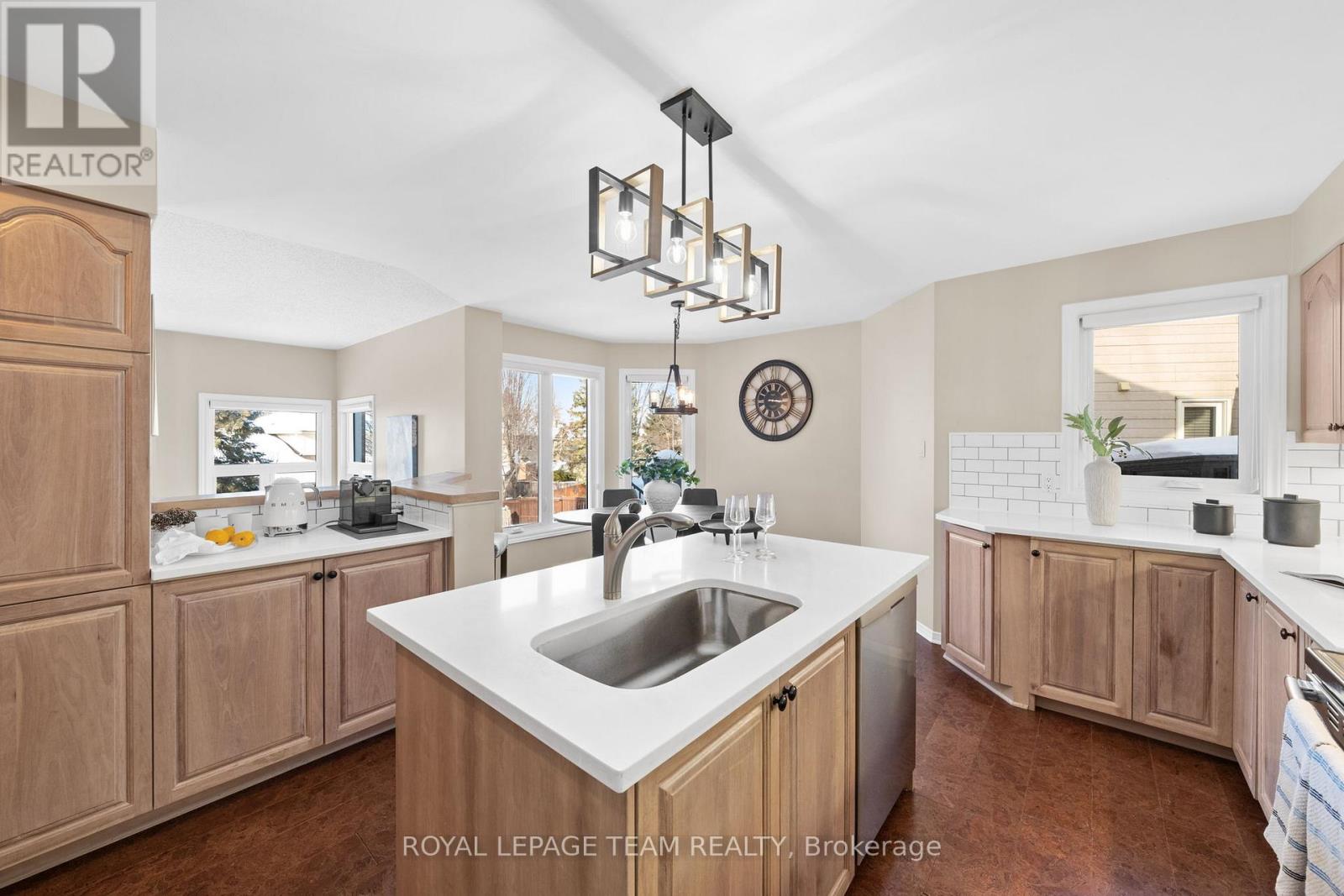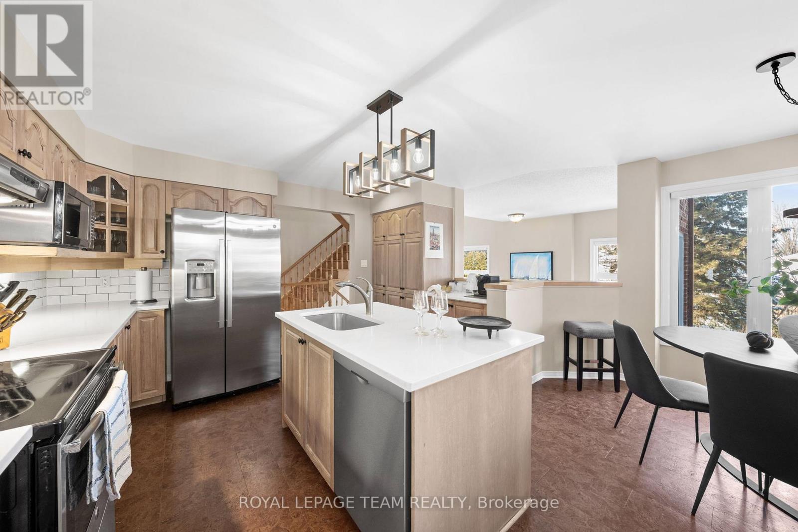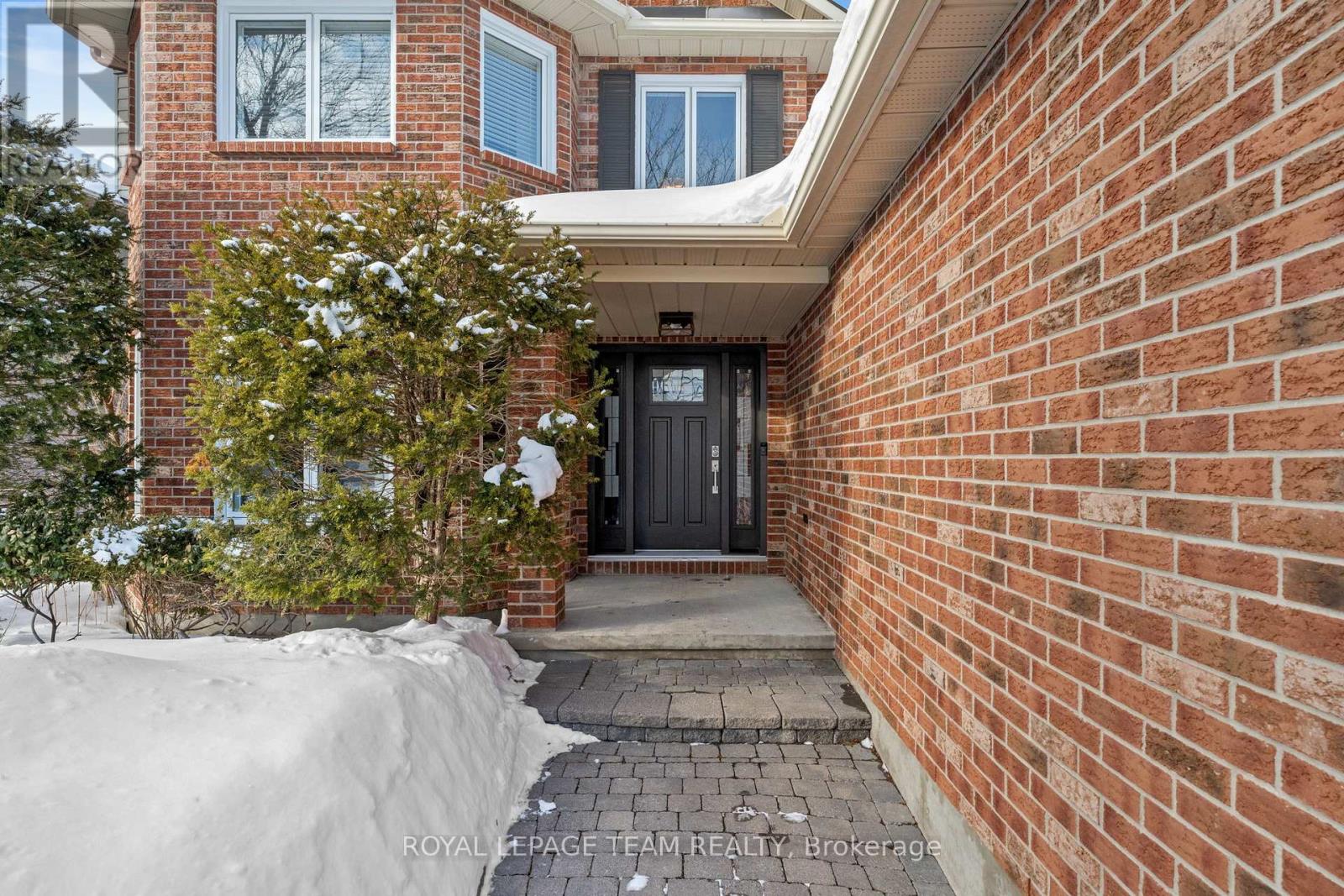 Located in the heart of Kanata Lakes, this all-brick Holitzner built walkout home offers approx. 3,790 sq. ft. of finished living space in a quiet, family-friendly neighbourhood close to top schools, amenities, Kanata Tech Park, and National Defence HQ. An interlock walkway leads to a beautiful front entry, opening into a bright 2-storey foyer. The living room with wood-burning FP provides a welcoming space to entertain, while double doors lead to a spacious formal dining room overlooking the backyard. The updated kitchen (2021) features cork floors, quartz counters and island, SS appliances including a GE fridge (2025), Bosch dishwasher (2025), subway tile backsplash, abundant cabinetry and pantry storage, plus a bright breakfast area and coffee nook overlooking the family room. Also on the main level is an updated powder room with quartz counters and black fixtures, a stately office with built-ins, crown moulding and a gas fireplace, and a laundry room with cabinetry and LG washer and dryer (2021). The impressive 2-storey family room features soaring ceilings, wood-burning FP and sliding doors that lead to the deck. Upstairs, the expansive primary suite includes a WIC and spa-inspired ensuite w/ double sinks, quartz counters, jetted tub and separate shower. A full bath with double vanity and tub/shower combo serves this level, along with 3 additional bdrms, one featuring wainscoting and new carpet (2022). Finished walkout LL offers a rec room with built-ins and heated floors, theatre room, storage areas, 5th bdrm, and full bath w/heated floors, perfect for an in-law or guest suite. Backyard oasis is an entertainer's dream featuring beautiful landscaping, heated inground saltwater pool, deck with underneath storage, 2nd deck ideal for a hot tub or patio furniture, and a fully fenced yard. Windows and doors updated 2018/2019. Solar panels installed 2025. A must-see home in Kanata Lakes! 24 Hours Irrevocable on all offers preferred. (id:64974)
