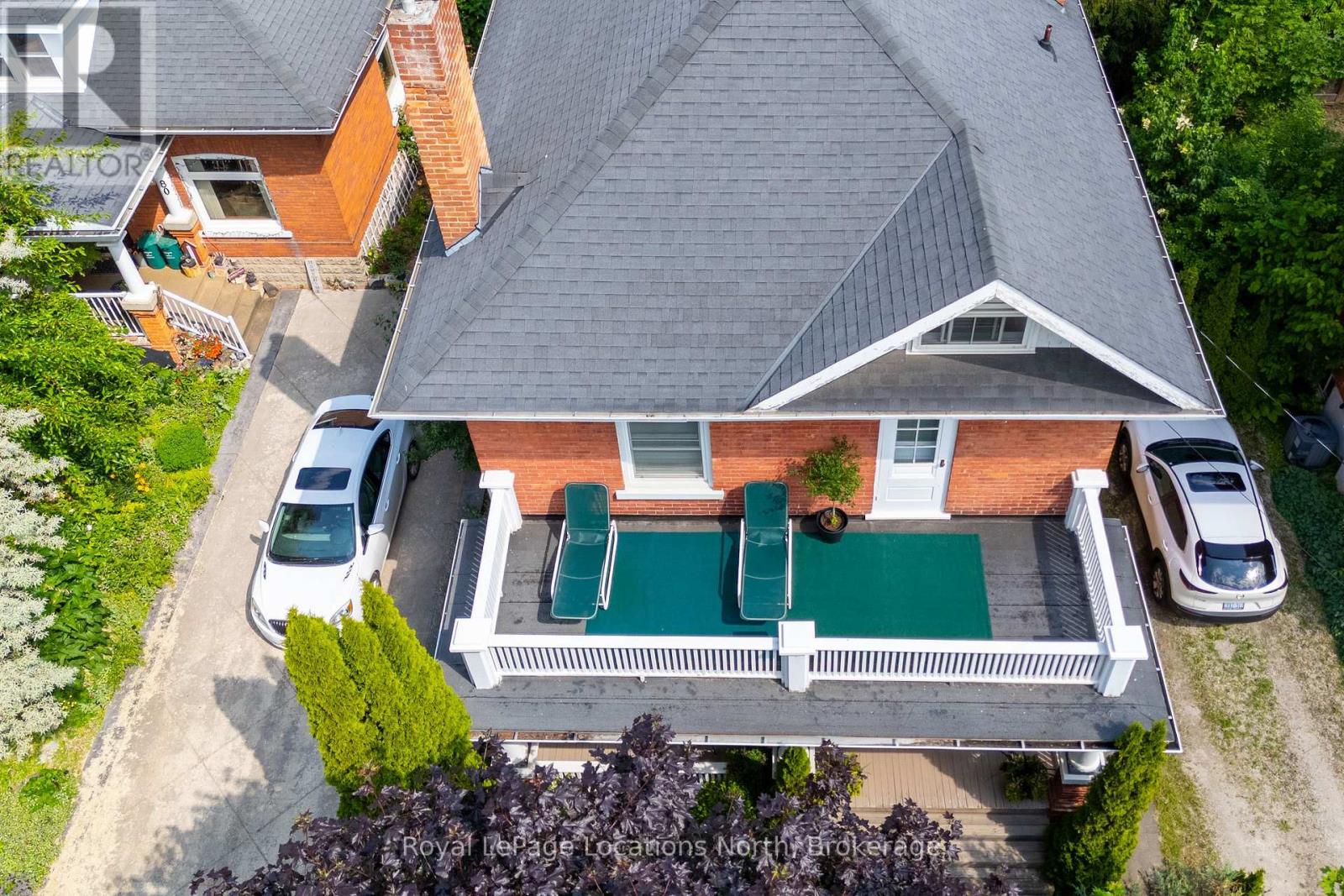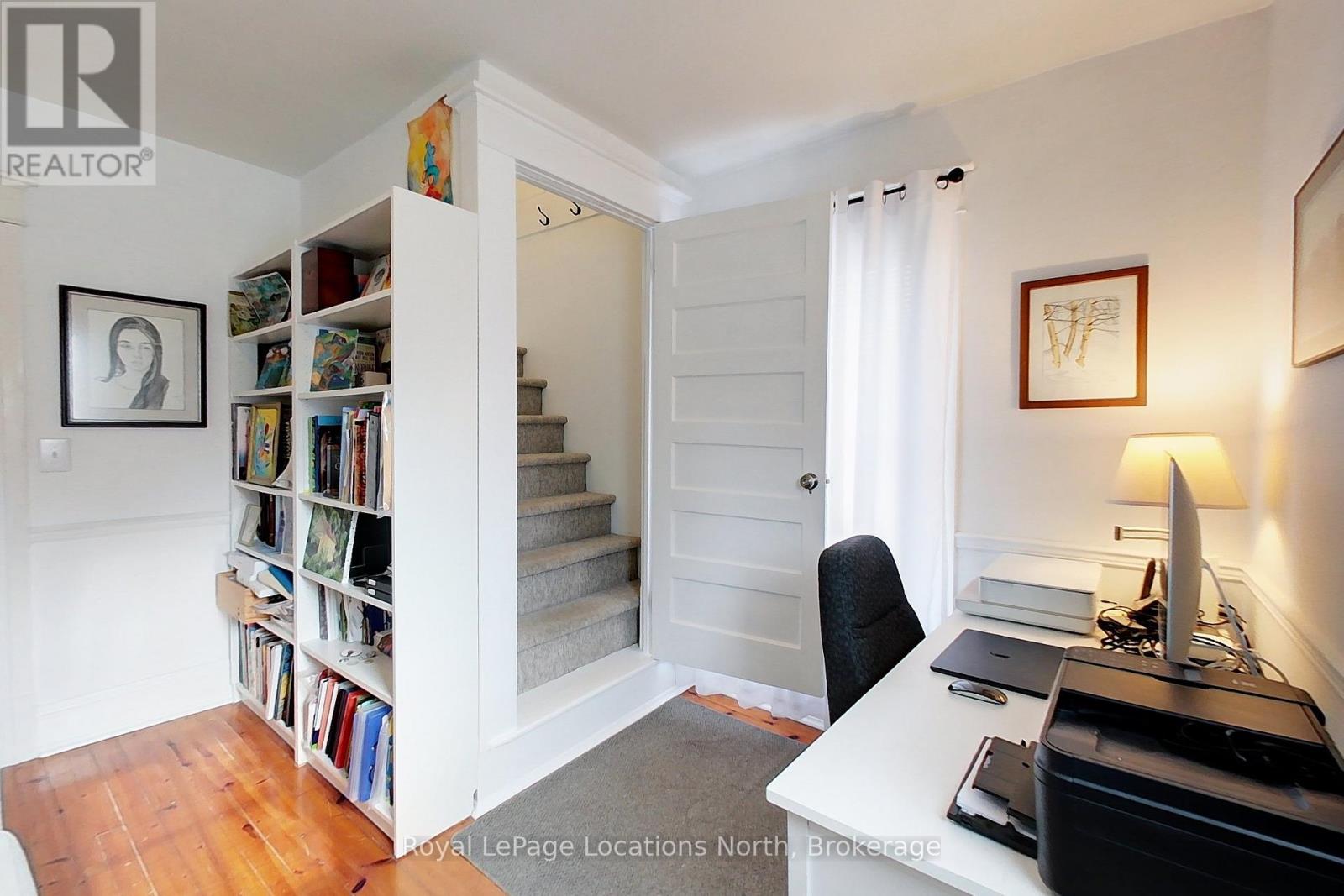 Just 1 block from downtown on a tree lined street in Meaford, this home has been preserved yet improved to be efficient, comfortable and long lasting. The large covered front porch is great for quiet relaxation or al fresco dining. The home is bright inside with 9 foot ceilings and large windows. New wide plank flooring in the living/dining area complements the original woodwork and trim. In the living room a gas fireplace with wood mantle keeps the house cozy on cool days. The kitchen has been beautifully renovated with crisp white cabinetry and wood counters. It is spacious enough for a small a island yet still roomy for couples cooking. Extra windows and the door to the private deck allow lots of light. The bedrooms upstairs are comfortable and each have closets plus a smaller bedroom is used as a dressing room. The bathroom has been divided with shower and vanity on one side and the W/C and sink separate. It works! There is an office space with access to the front balcony and to the finished attic. In the attic is a 3rd bedroom and extra sitting area for reading or relaxing. (id:64974)