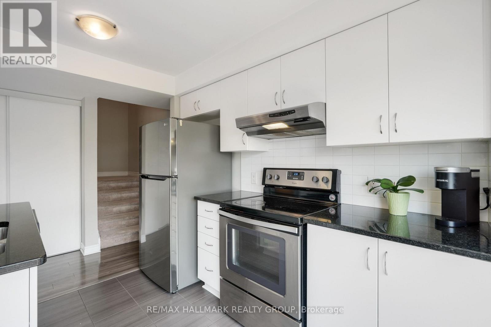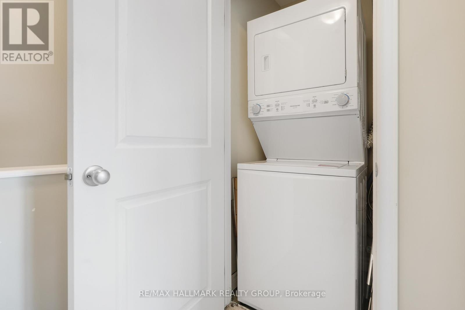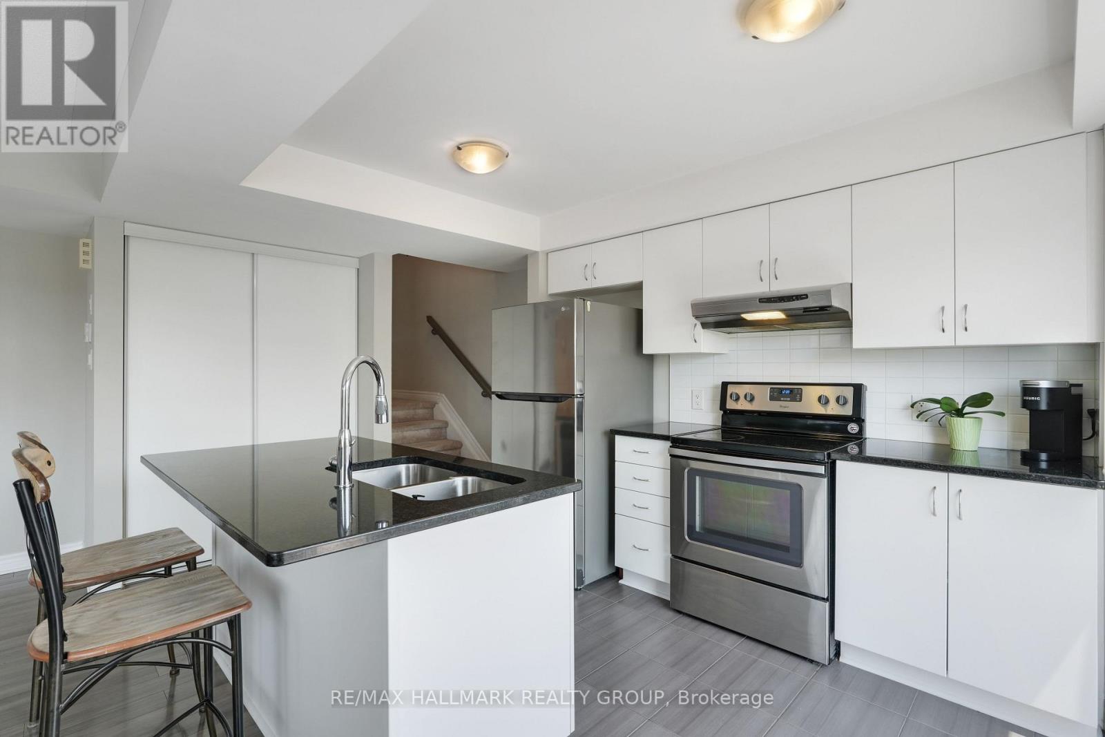 Stylish Upper End-Unit Condo in the Heart of Barrhaven. Welcome to this bright and beautifully maintained 2-bedroom, 1.5-bathroom upper end-unit condo, ideally located just steps from the vibrant amenities of Chapman Mills Marketplace. Enjoy the convenience of having restaurants, shops, Loblaws, a movie theatre, parks, and transit all within easy walking distance. Designed with comfort and style in mind, this home features an open-concept layout enhanced by abundant natural light from its desirable eastern exposure. The modern white kitchen is both elegant and functional, showcasing quartz countertops, ceramic tile flooring, stainless-steel appliances, and a large island with breakfast bar-perfect for casual dining or entertaining. The spacious living and dining areas feature wide plank grey laminate flooring, large windows with custom window coverings, and direct access to a generous private balcony-an ideal space to enjoy your morning coffee or evening BBQ. Upstairs, you'll find two generously sized bedrooms with wall-to-wall closets and neutral broadloom, along with a well-appointed 4-piece bathroom featuring ceramic tile flooring and a tiled tub/shower. A convenient second-floor laundry closet adds everyday practicality. Additional highlights include a dedicated parking space and ample visitor parking nearby. Perfectly suited for first-time buyers, professionals, downsizers, or investors, this move-in ready home offers exceptional value in one of Barrhaven's most walkable and connected neighbourhoods. With transit at your doorstep-including a direct 25-minute bus ride to downtown Ottawa-and monthly ownership costs comparable to renting, this is an outstanding opportunity to own in a sought-after community (id:64974)