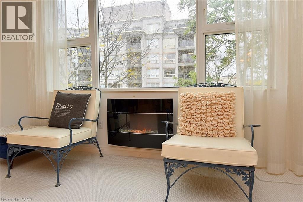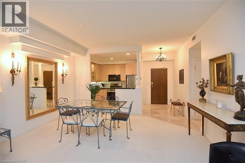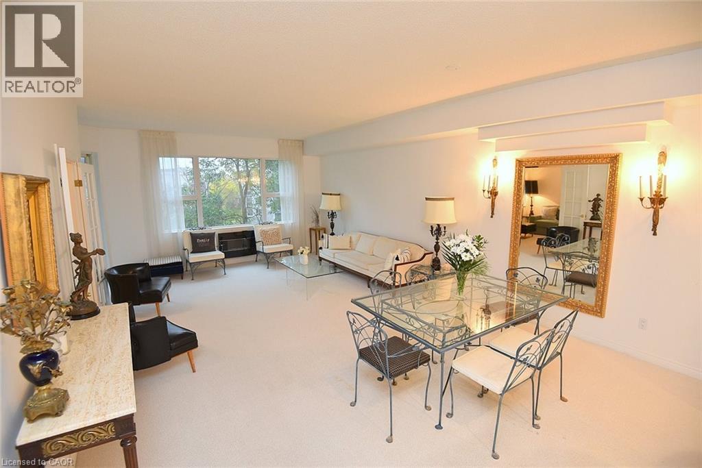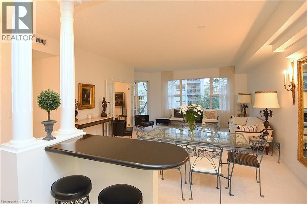 Welcome to this beautifully maintained 1,200 sq. ft., two bedroom, condo in one of Dundas’ most sought-after buildings! Boasting 9’ ceilings and an open-concept design, this bright and inviting home offers the perfect blend of comfort and convenience. The generous living and dining areas flow seamlessly into the well-appointed kitchen, creating an ideal space for both everyday living and entertaining. Step out onto the private balcony and enjoy peaceful views of the treed area and Spencer Creek — a serene backdrop right at home.The spacious primary bedroom features a walk-in closet and a 4-piece ensuite bath, providing a private retreat within this lovely unit. The second bedroom can be used as a family room or home office. Immaculately cared for, this condo is clean, bright, and move-in ready. The condo’s amenities include a guest suite, fitness room, sauna and a party room that boasts a full kitchen and a terrace with a BBQ, perfect for entertaining. Located close to all amenities, public transit, and scenic walking trails, this is condo living at its best in beautiful Dundas. Don’t miss your chance to call this exceptional property home! (id:64974)