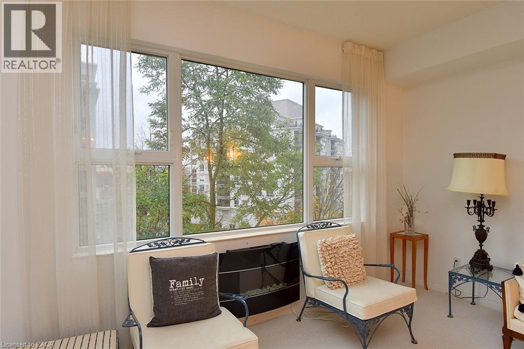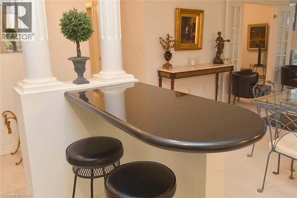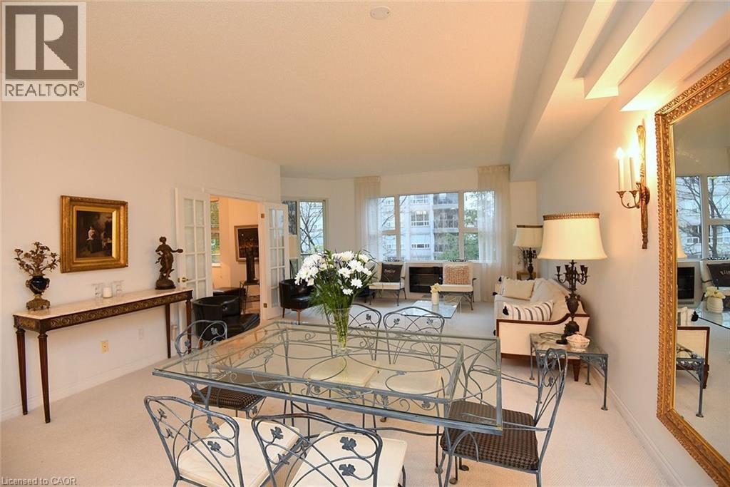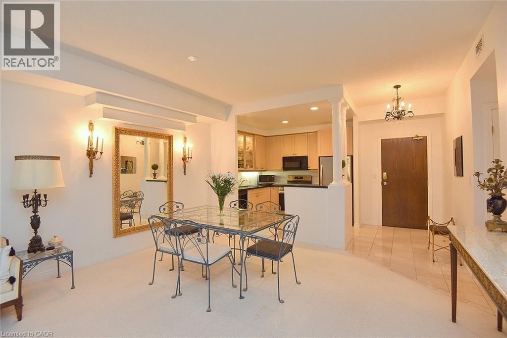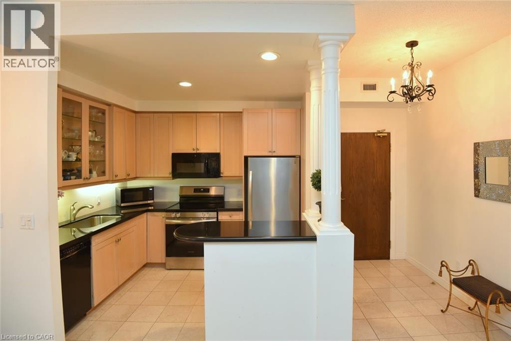 Welcome to this beautifully maintained 1,200 sq. ft., two bedroom, condo in one of Dundas’ most sought-after buildings! Boasting 9’ ceilings and an open-concept design, this bright and inviting home offers the perfect blend of comfort and convenience. The generous living and dining areas flow seamlessly into the well-appointed kitchen, creating an ideal space for both everyday living and entertaining. Step out onto the private balcony and enjoy peaceful views of the treed area and Spencer Creek — a serene backdrop right at home.The spacious primary bedroom features a walk-in closet and a 4-piece ensuite bath, providing a private retreat within this lovely unit. The second bedroom can be used as a family room or home office. Immaculately cared for, this condo is clean, bright, and move-in ready. The condo’s amenities include a guest suite, fitness room, sauna and a party room that boasts a full kitchen and a terrace with a BBQ, perfect for entertaining. Located close to all amenities, public transit, and scenic walking trails, this is condo living at its best in beautiful Dundas. Don’t miss your chance to call this exceptional property home! (id:64974)