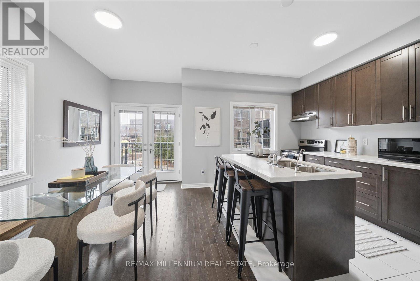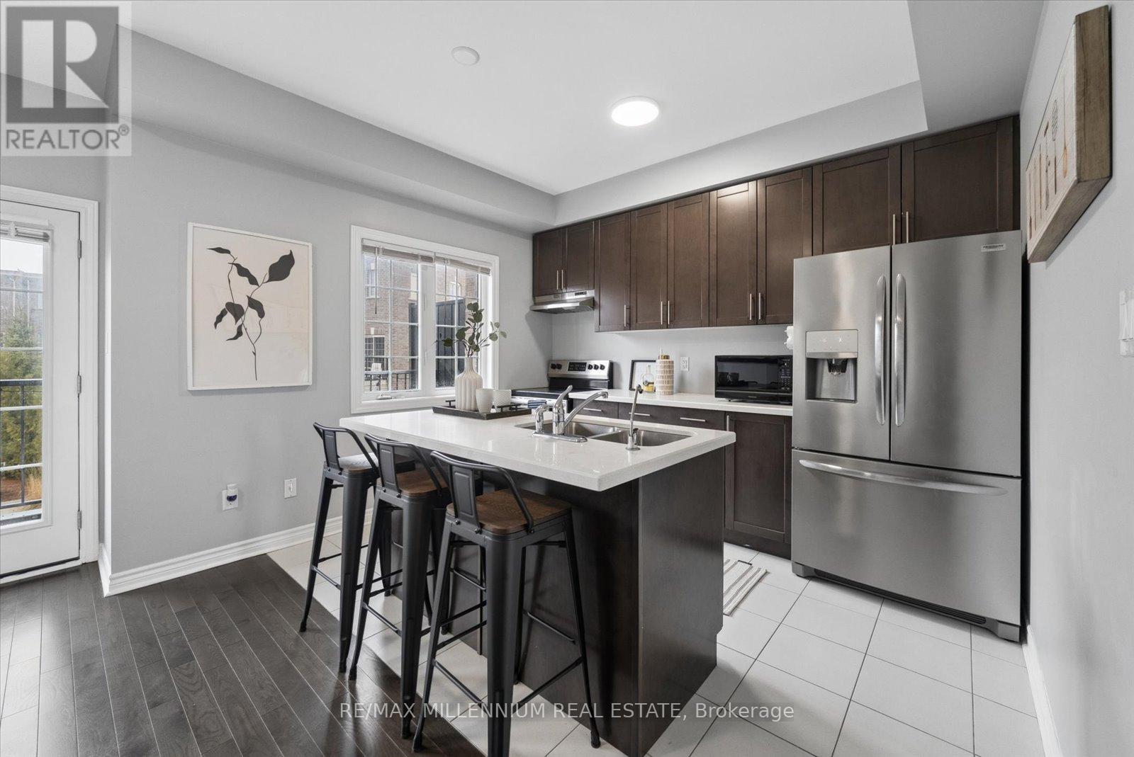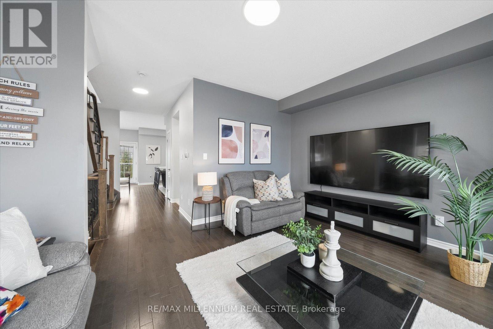 Step into your next home, a desirable end unit where the ground level features a versatile den-perfect as a home office, gym, or rec room-complete with a 2-piece bath and a walkout to green backyard oasis. A hardwood staircase leads you to the bright and spacious main living area, filled with natural light, a convenient laundry area, and a 2-piece powder room. The well-designed kitchen offers quartz countertops, a centre island with breakfast bar, and stainless steel appliances, seamlessly flowing into the dining area with a walkout to the balcony through patio doors.The top floor features three generously sized bedrooms with cozy broadloom, including a primary suite with a private 3-piece ensuite and a spacious closet. An additional 4-piece bathroom completes this level-perfect for a growing family or first-time buyers. Don't miss this opportunity! (id:64974)