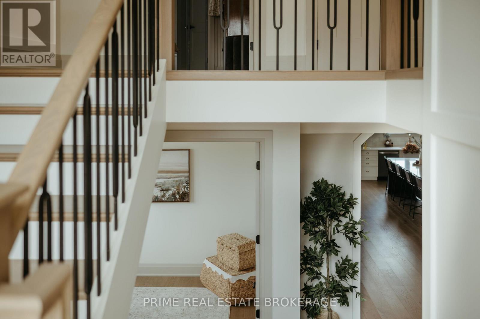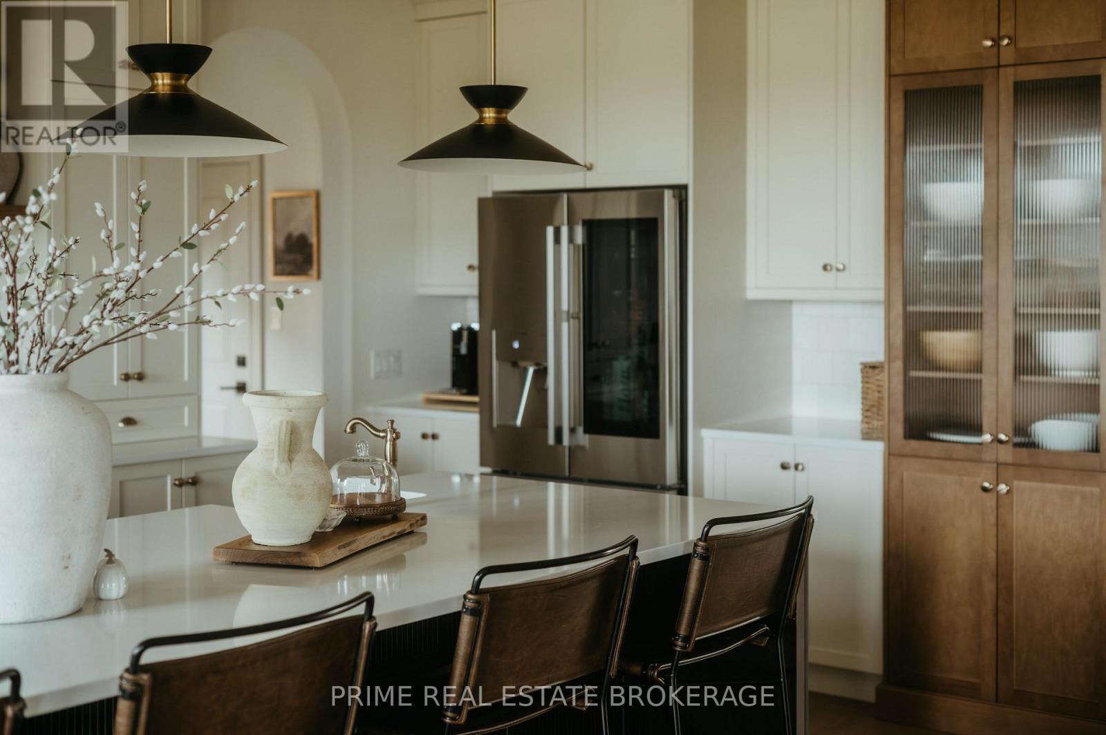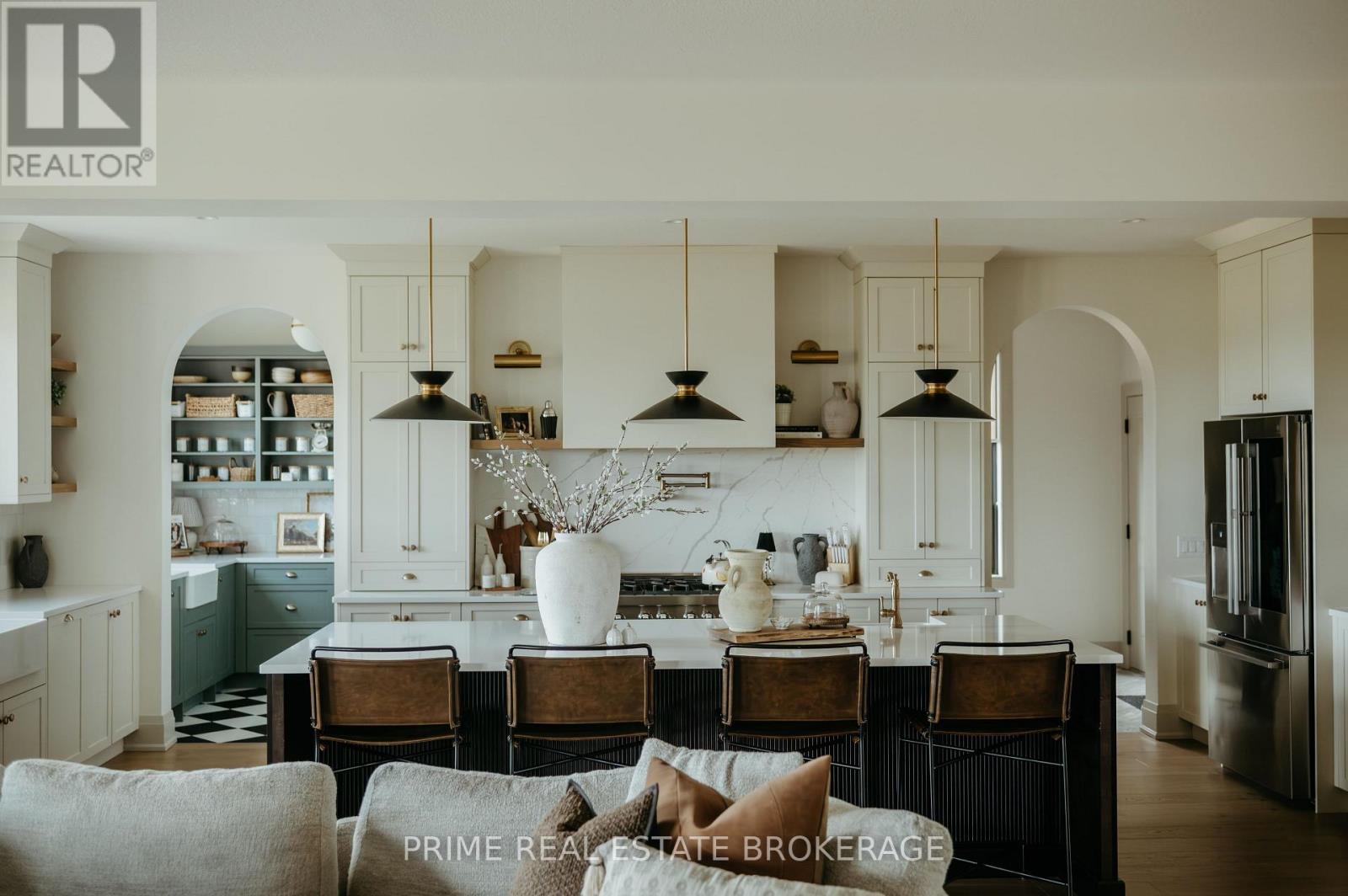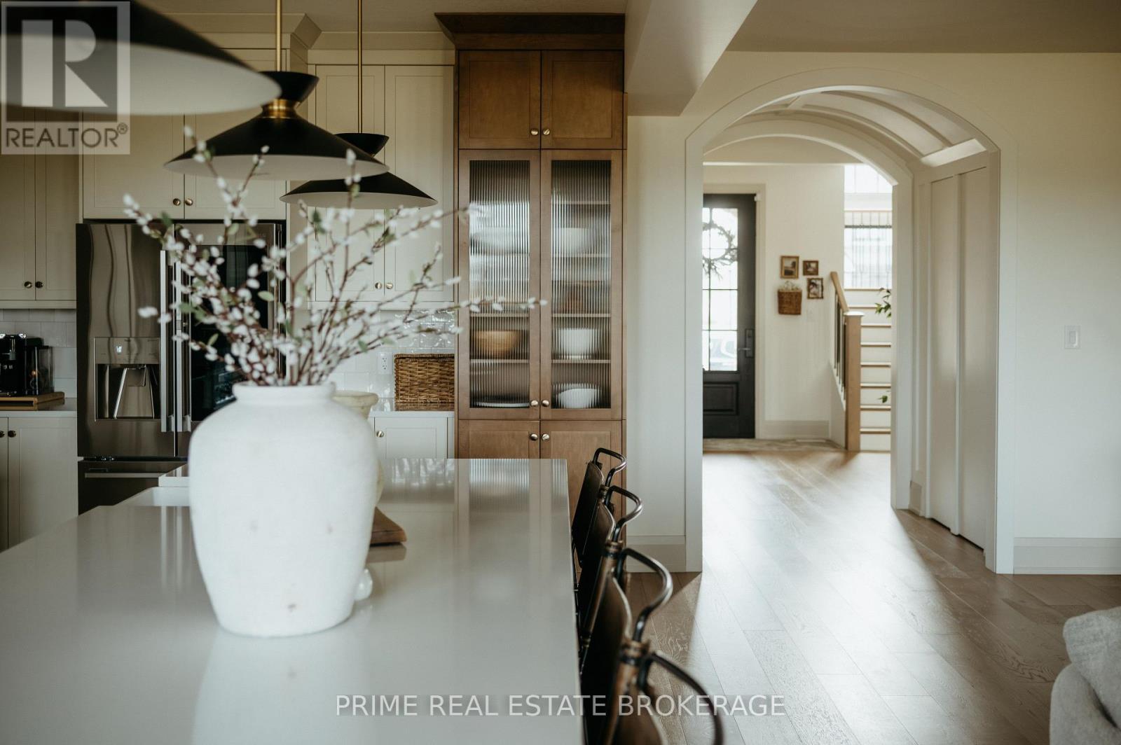 Experience a masterclass in custom design at 78 Optimist Drive, a designer-built residence by Halcyon Homes where French vintage charm meets sleek transitional modernism. Spanning 2635 square feet of curated luxury, this home is defined by its architectural precision, featuring elegant arches, bespoke millwork, and warm wood tones bathed in abundant natural light. The heart of the home is a chef's sanctuary, anchored by a stunning 10-foot ribbed island, premium cream-and-wood cabinetry, and brushed gold accents. Flowing seamlessly, a discreet entrance lies a hidden butler's pantry, complete with classic checkered tile, open shelving, and a dedicated coffee bar, the perfect blend of high-end utility and sophisticated surprise. The main living area, characterized by soaring wood-beam ceilings and a minimalist fireplace, flows through double French doors to an expansive covered patio, creating indoor-outdoor living for year-round entertaining. The upper level features a vaulted primary suite, a spa-like haven with a barrier-free glass shower and a freestanding soaking tub. The thoughtful layout is engineered for modern family life, offering three additional bedrooms, a Jack & Jill bath, and the rare convenience of dual laundry rooms on both levels, alongside a high-capacity mudroom. Built with Halcyon's signature dedication to curated quality, including site-finished hardwoods, fine details, and flawless finishes. This property is situated in the peaceful Southwold community of Talbotville. 78 Optimist Drive is more than just a residence; it is a home beyond that transcends the floor plans, built for those who demand both everyday functionality and extraordinary elegance. (id:64974)