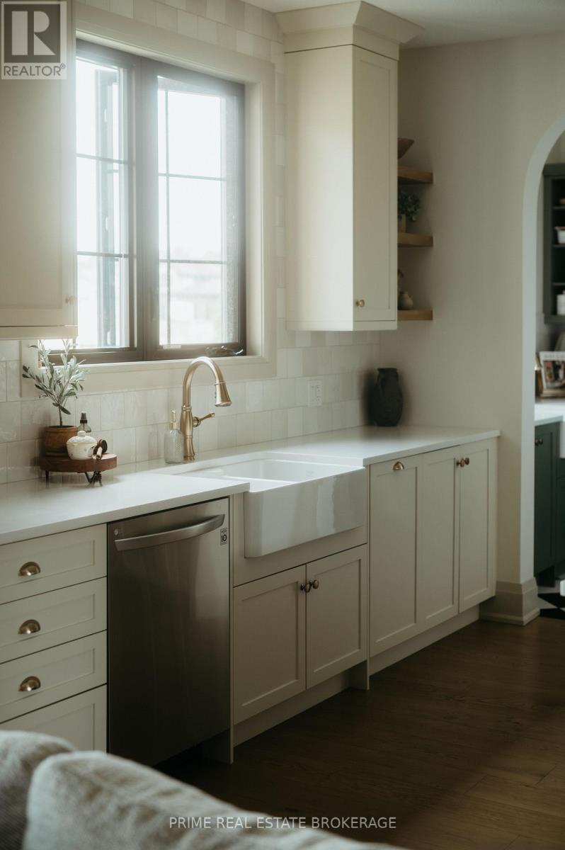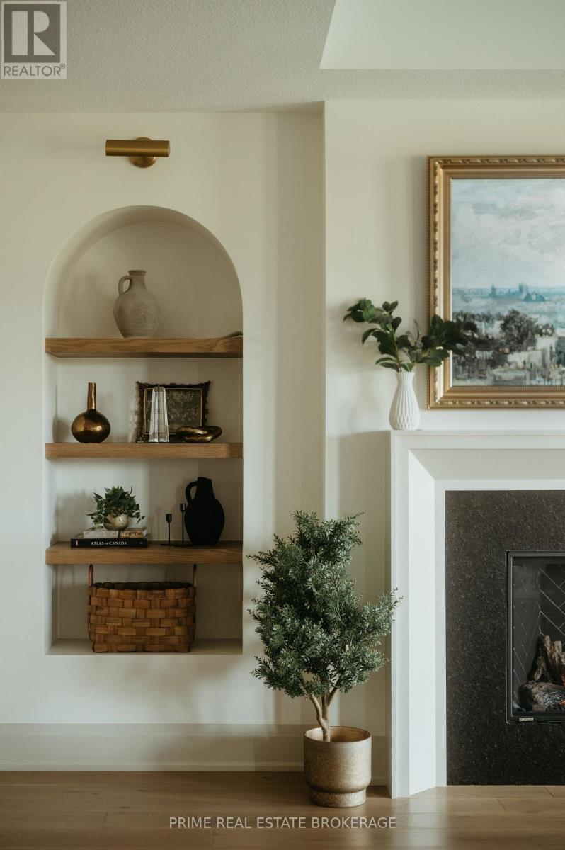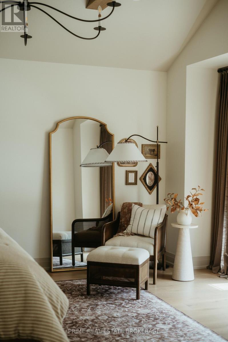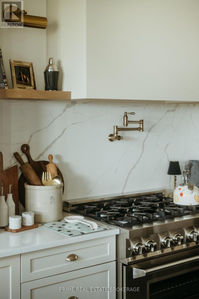 Experience a masterclass in custom design at 78 Optimist Drive, a designer-built residence by Halcyon Homes where French vintage charm meets sleek transitional modernism. Spanning 2635 square feet of curated luxury, this home is defined by its architectural precision, featuring elegant arches, bespoke millwork, and warm wood tones bathed in abundant natural light. The heart of the home is a chef's sanctuary, anchored by a stunning 10-foot ribbed island, premium cream-and-wood cabinetry, and brushed gold accents. Flowing seamlessly, a discreet entrance lies a hidden butler's pantry, complete with classic checkered tile, open shelving, and a dedicated coffee bar, the perfect blend of high-end utility and sophisticated surprise. The main living area, characterized by soaring wood-beam ceilings and a minimalist fireplace, flows through double French doors to an expansive covered patio, creating indoor-outdoor living for year-round entertaining. The upper level features a vaulted primary suite, a spa-like haven with a barrier-free glass shower and a freestanding soaking tub. The thoughtful layout is engineered for modern family life, offering three additional bedrooms, a Jack & Jill bath, and the rare convenience of dual laundry rooms on both levels, alongside a high-capacity mudroom. Built with Halcyon's signature dedication to curated quality, including site-finished hardwoods, fine details, and flawless finishes. This property is situated in the peaceful Southwold community of Talbotville. 78 Optimist Drive is more than just a residence; it is a home beyond that transcends the floor plans, built for those who demand both everyday functionality and extraordinary elegance. (id:64974)