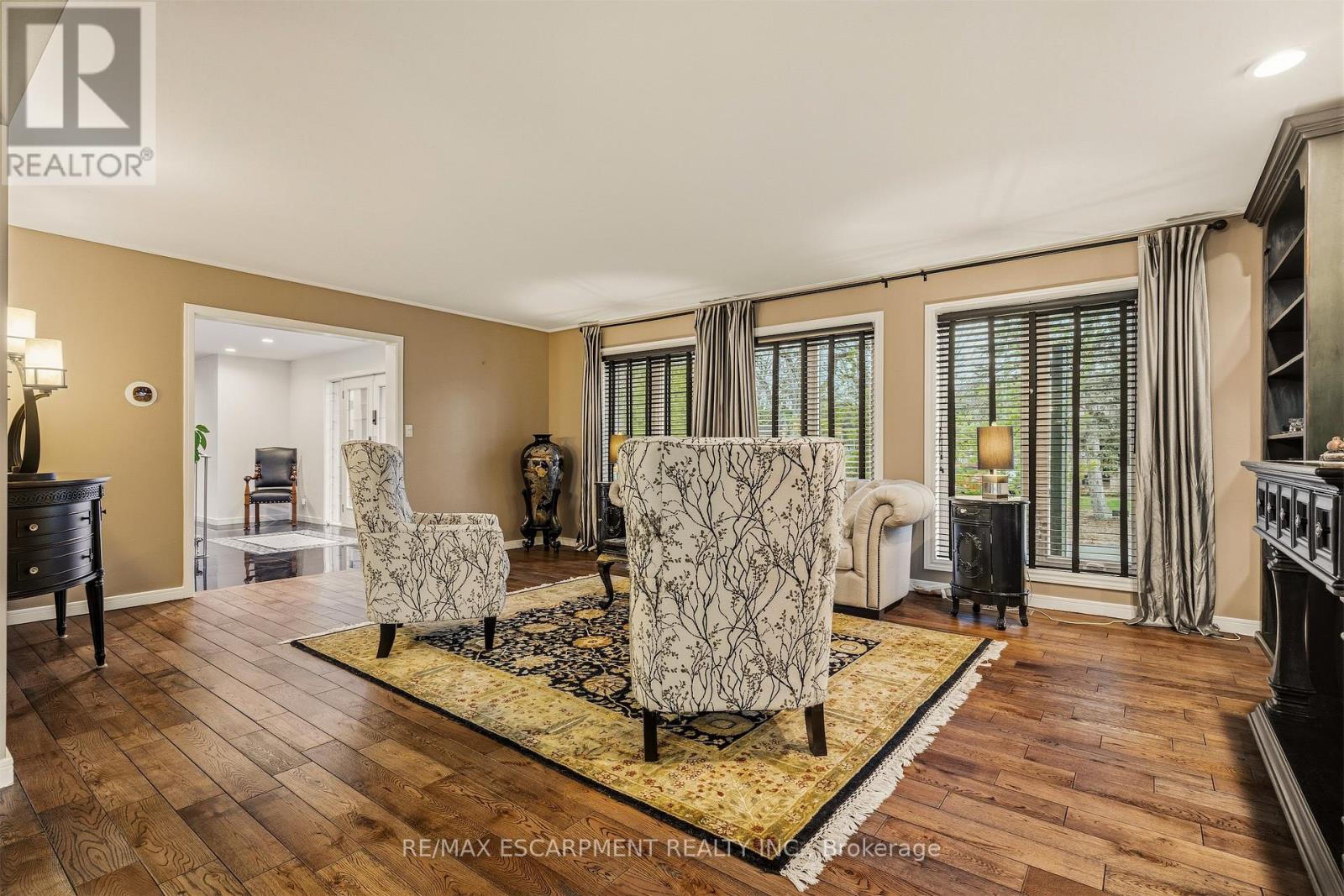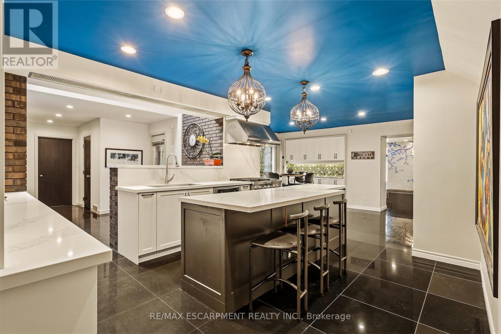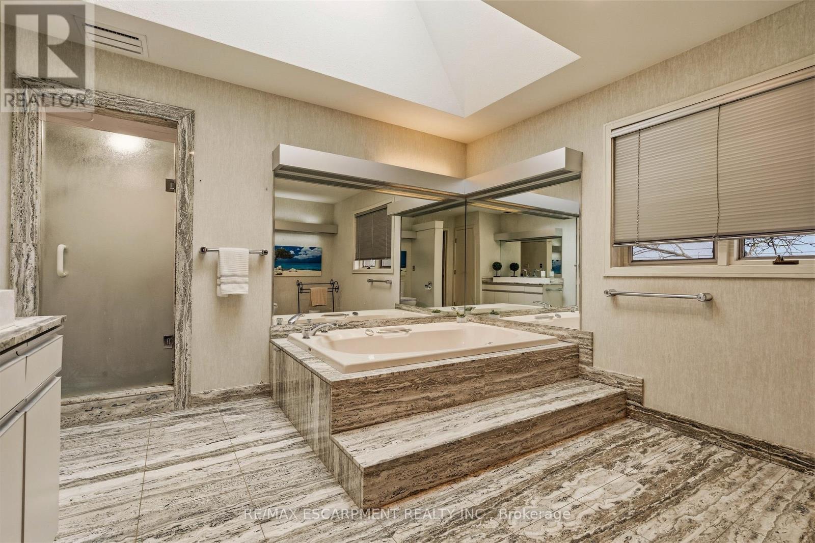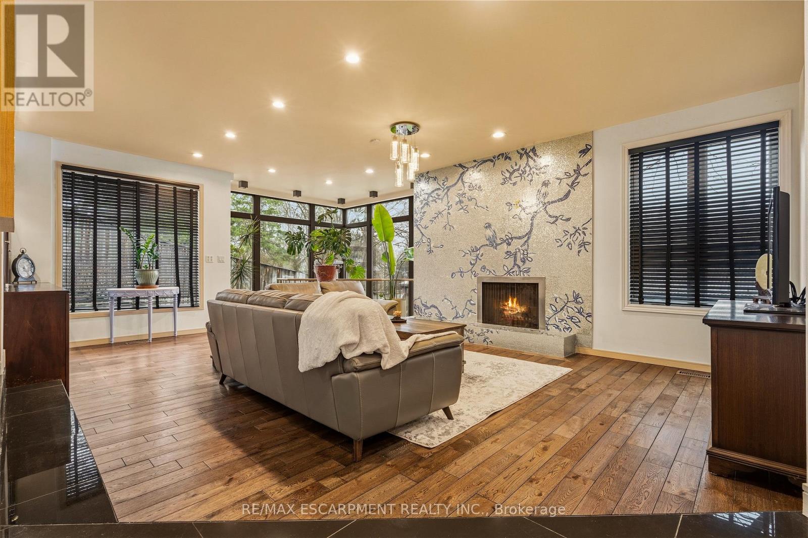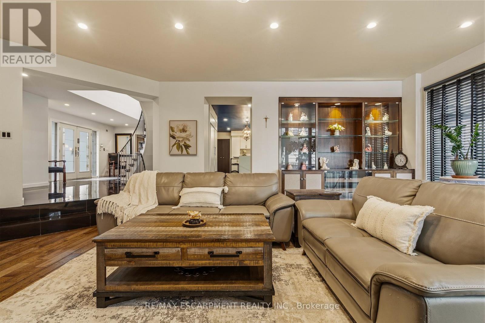 In the picturesque Dundas community of Pleasant Valley sits this extraordinary custom residence offering an elevated standard of living defined by impeccable craftsmanship and timeless design. Built by McConnell Homes, this distinguished all-brick two-storey spans over 4,500+ sqft above grade, plus 2,200+ sqft of exquisitely finished living space below. A grand double-door entry introduces an opulent Bisazza Italian stone foyer, setting the tone for the elegance that unfolds throughout. A sweeping staircase, adorned with luxurious Stark wool carpeting, anchors the home with architectural grace. The principal living spaces are thoughtfully designed for both grand entertaining and intimate gatherings, featuring wire-brushed hardwood floors and an effortless flow from formal living and dining areas into the heart of the home. The chef-inspired kitchen is a culinary showpiece, appointed with premium KitchenAid appliances, bespoke cabinetry, and generous prep space. The adjoining great room is equally captivating, highlighted by a striking imported Bisazza fireplace and seamless access to a private, resort-style backyard. Upstairs, natural light pours through a dramatic skylight, illuminating a spa-inspired ensuite featuring a jacuzzi tub, separate shower, dual walk-in closets, a private office, and a secluded terrace overlooking the gardens. Three additional bedrooms and two beautifully appointed bathrooms complete the upper level. The lower level is an entertainer's dream, with a richly finished family room, fireplace, granite flooring, wet bar, private theatre, kitchenette, and guest suite with ensuite bath. Walk-out to the multi-tiered interlock patio, covered in-ground concrete pool, and dedicated pool lounge - an outdoor retreat surrounded by mature landscaping, set on an oversized double lot. The property offers dual driveways from both Turnbull and Terrace, and a double garage with interior access-an exceptional offering of sophistication, comfort, and prestige. (id:64974)