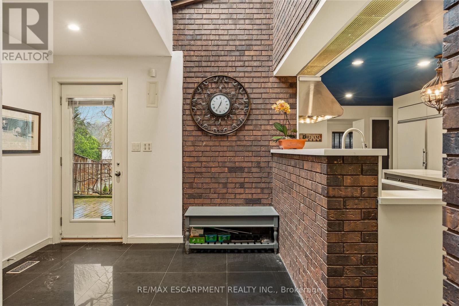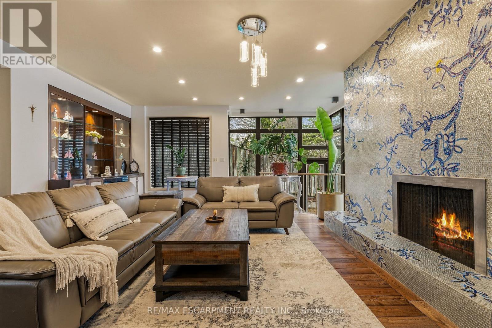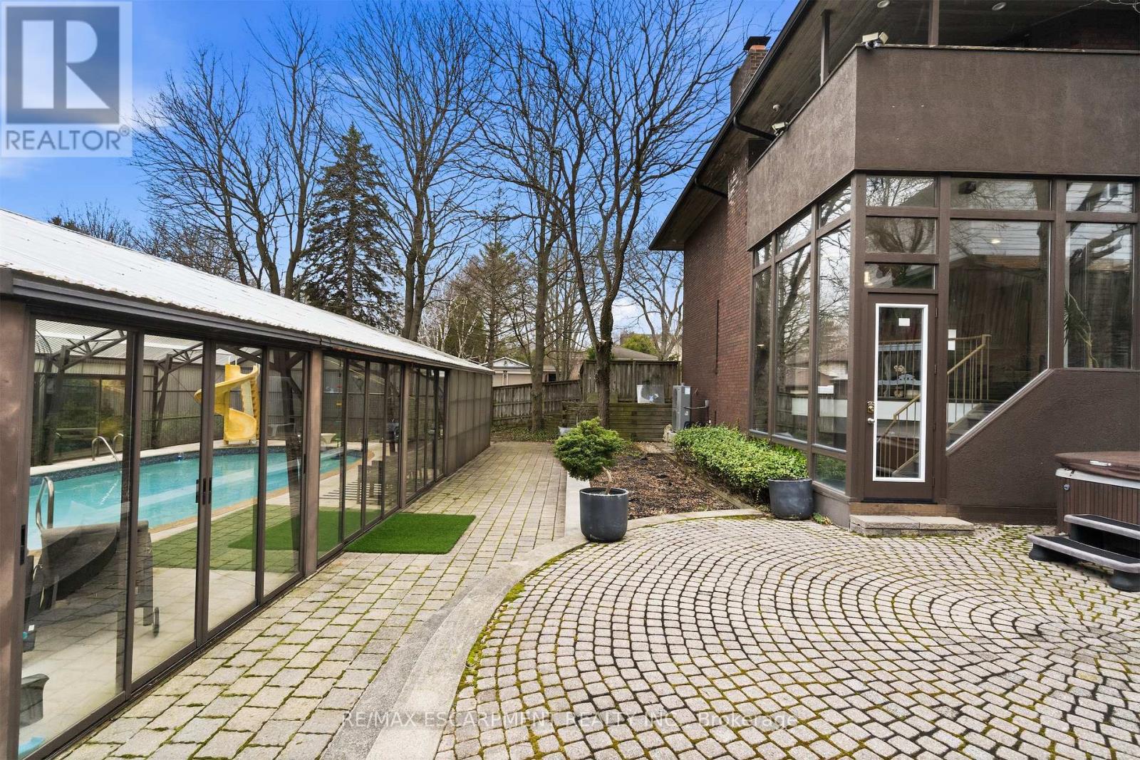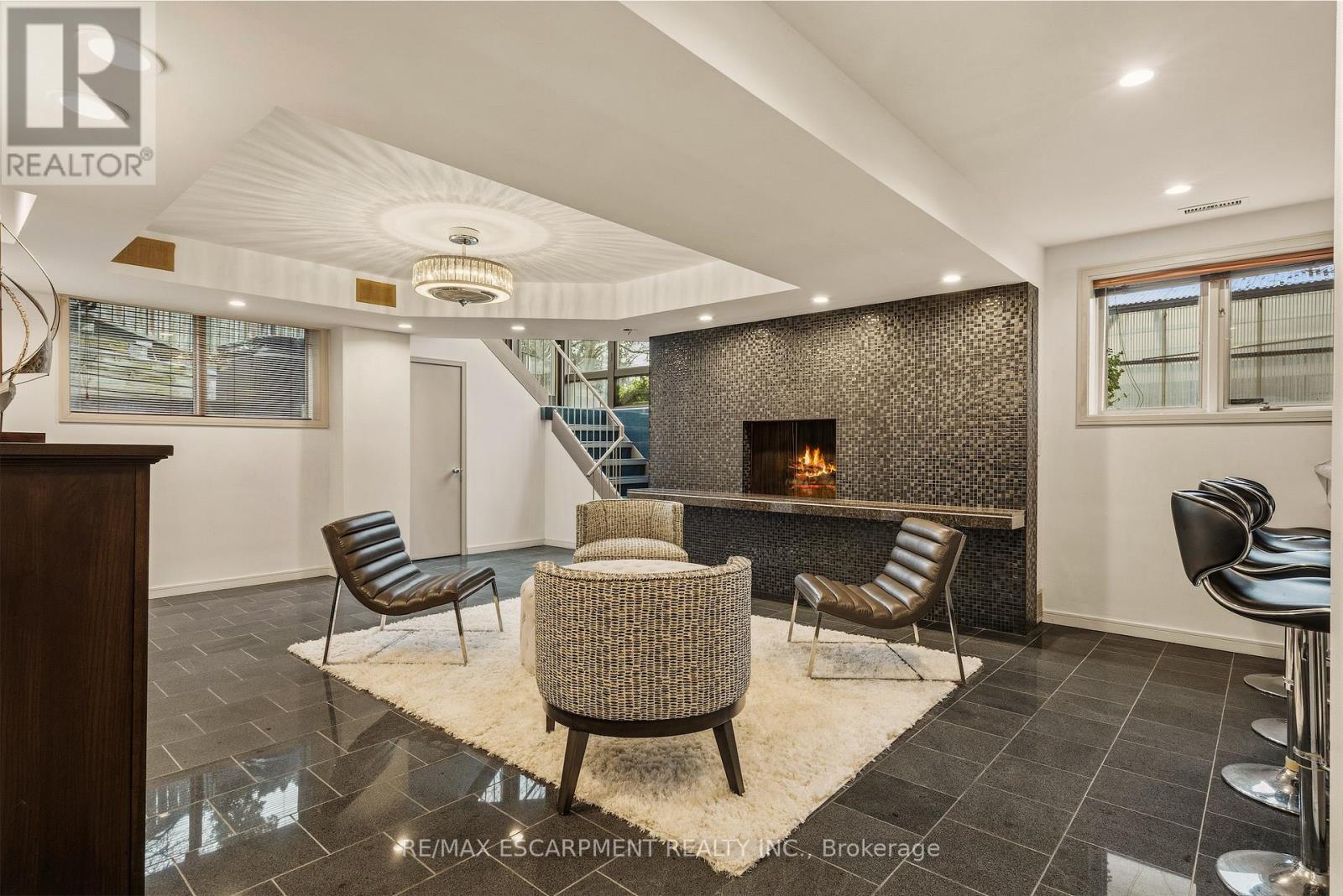 In the picturesque Dundas community of Pleasant Valley sits this extraordinary custom residence offering an elevated standard of living defined by impeccable craftsmanship and timeless design. Built by McConnell Homes, this distinguished all-brick two-storey spans over 4,500+ sqft above grade, plus 2,200+ sqft of exquisitely finished living space below. A grand double-door entry introduces an opulent Bisazza Italian stone foyer, setting the tone for the elegance that unfolds throughout. A sweeping staircase, adorned with luxurious Stark wool carpeting, anchors the home with architectural grace. The principal living spaces are thoughtfully designed for both grand entertaining and intimate gatherings, featuring wire-brushed hardwood floors and an effortless flow from formal living and dining areas into the heart of the home. The chef-inspired kitchen is a culinary showpiece, appointed with premium KitchenAid appliances, bespoke cabinetry, and generous prep space. The adjoining great room is equally captivating, highlighted by a striking imported Bisazza fireplace and seamless access to a private, resort-style backyard. Upstairs, natural light pours through a dramatic skylight, illuminating a spa-inspired ensuite featuring a jacuzzi tub, separate shower, dual walk-in closets, a private office, and a secluded terrace overlooking the gardens. Three additional bedrooms and two beautifully appointed bathrooms complete the upper level. The lower level is an entertainer's dream, with a richly finished family room, fireplace, granite flooring, wet bar, private theatre, kitchenette, and guest suite with ensuite bath. Walk-out to the multi-tiered interlock patio, covered in-ground concrete pool, and dedicated pool lounge - an outdoor retreat surrounded by mature landscaping, set on an oversized double lot. The property offers dual driveways from both Turnbull and Terrace, and a double garage with interior access-an exceptional offering of sophistication, comfort, and prestige. (id:64974)