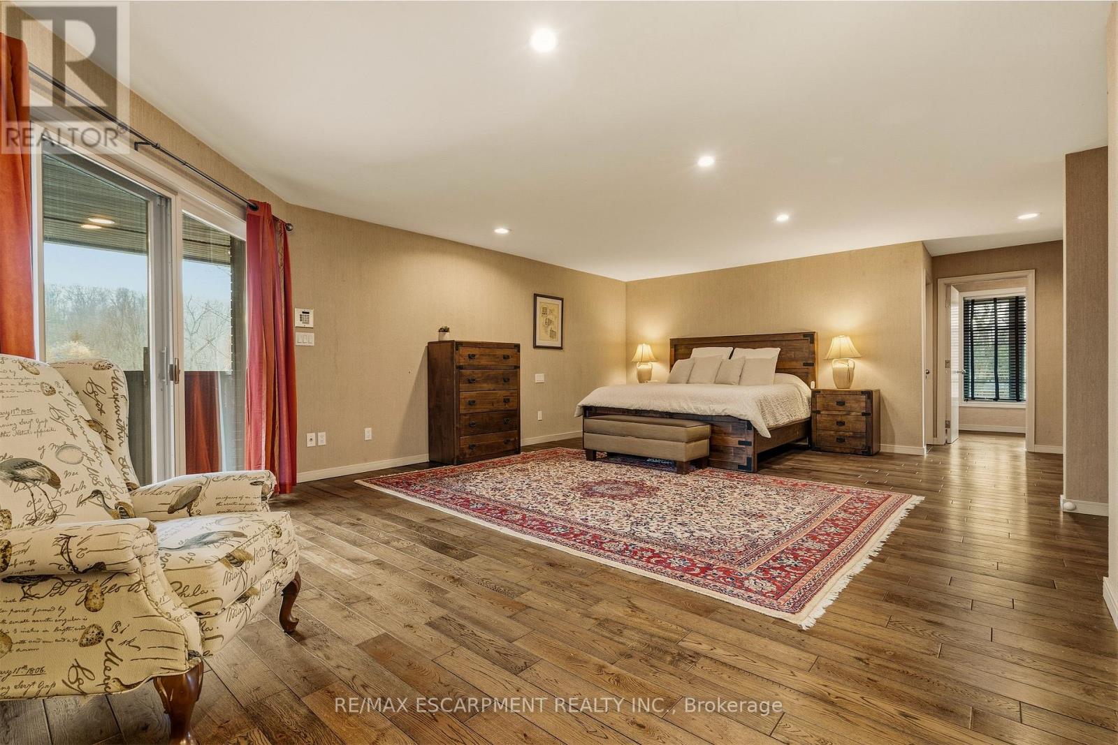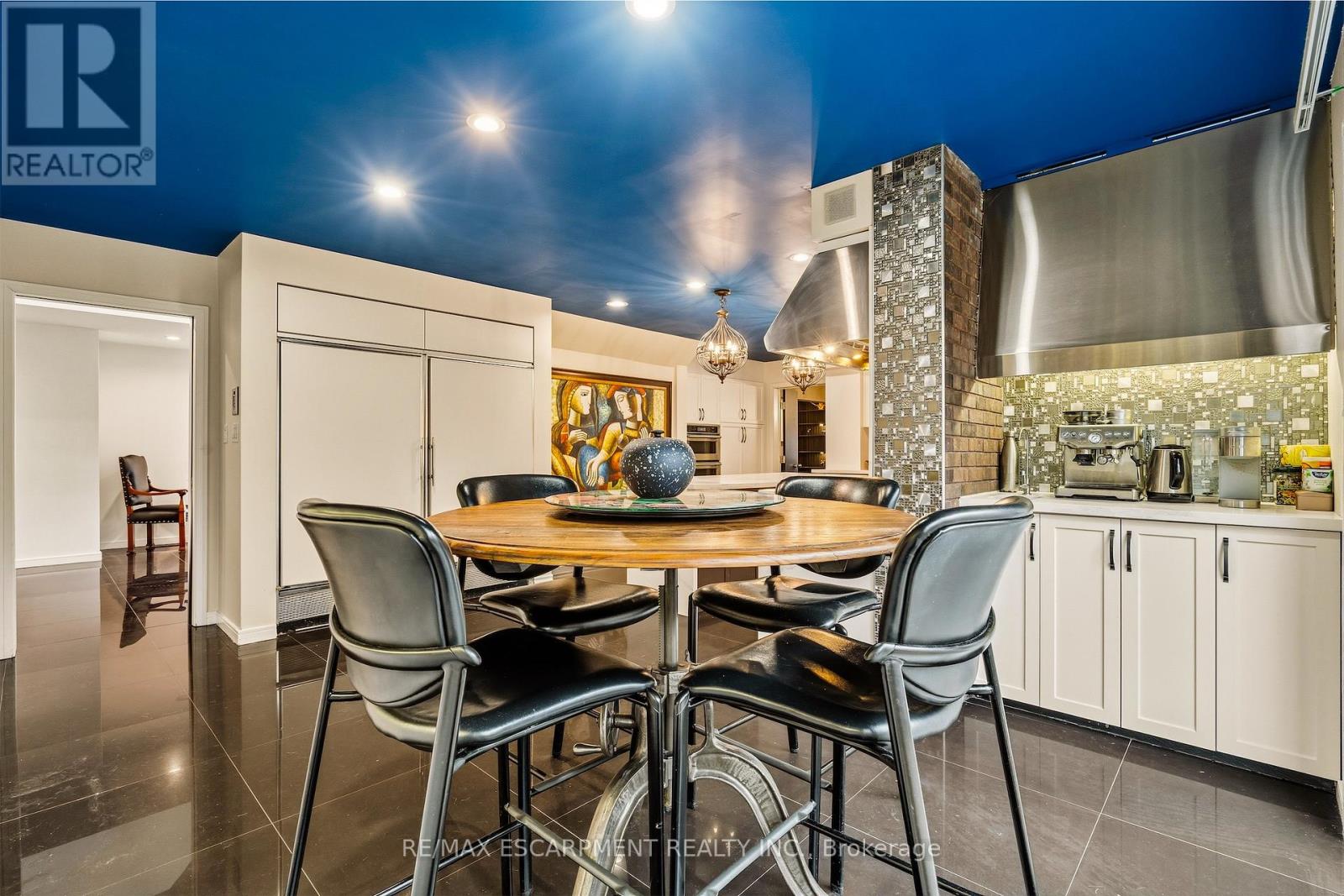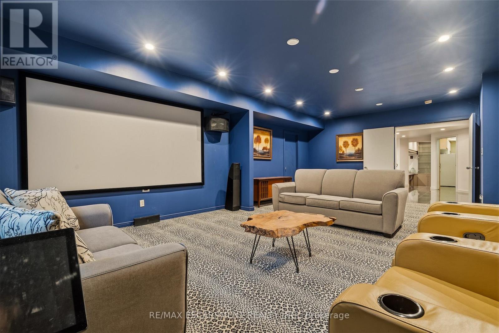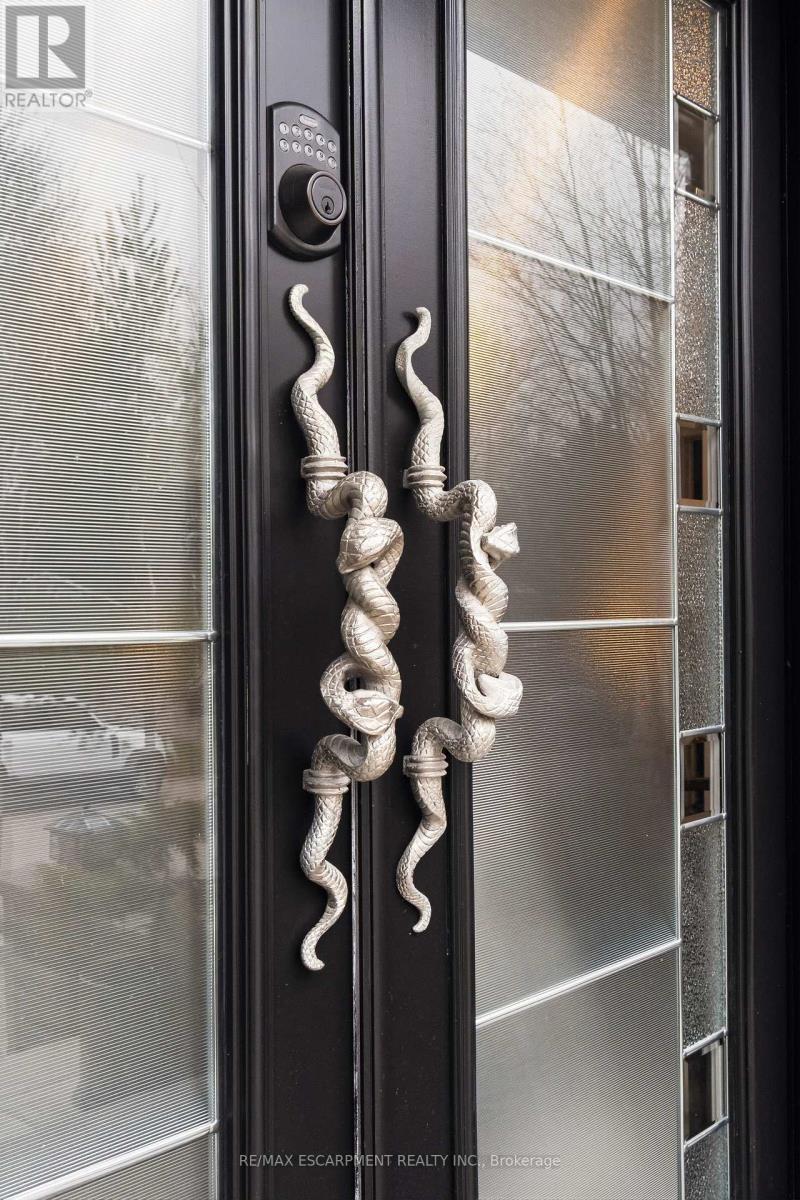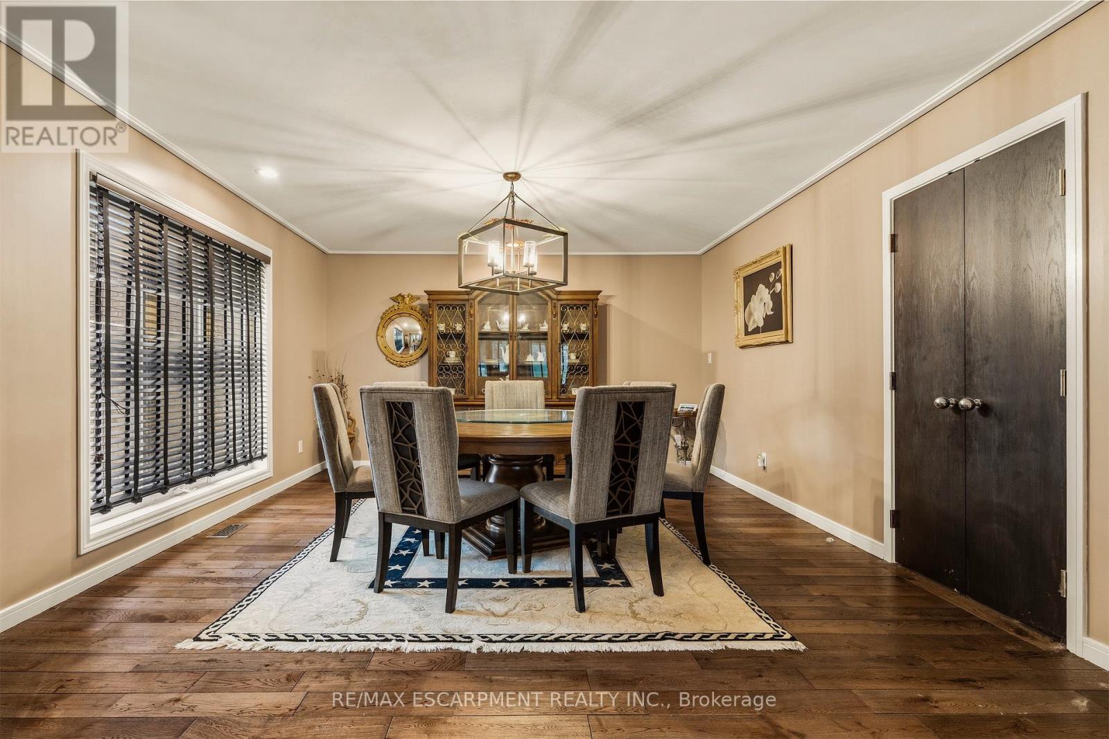 In the picturesque Dundas community of Pleasant Valley sits this extraordinary custom residence offering an elevated standard of living defined by impeccable craftsmanship and timeless design. Built by McConnell Homes, this distinguished all-brick two-storey spans over 4,500+ sqft above grade, plus 2,200+ sqft of exquisitely finished living space below. A grand double-door entry introduces an opulent Bisazza Italian stone foyer, setting the tone for the elegance that unfolds throughout. A sweeping staircase, adorned with luxurious Stark wool carpeting, anchors the home with architectural grace. The principal living spaces are thoughtfully designed for both grand entertaining and intimate gatherings, featuring wire-brushed hardwood floors and an effortless flow from formal living and dining areas into the heart of the home. The chef-inspired kitchen is a culinary showpiece, appointed with premium KitchenAid appliances, bespoke cabinetry, and generous prep space. The adjoining great room is equally captivating, highlighted by a striking imported Bisazza fireplace and seamless access to a private, resort-style backyard. Upstairs, natural light pours through a dramatic skylight, illuminating a spa-inspired ensuite featuring a jacuzzi tub, separate shower, dual walk-in closets, a private office, and a secluded terrace overlooking the gardens. Three additional bedrooms and two beautifully appointed bathrooms complete the upper level. The lower level is an entertainer's dream, with a richly finished family room, fireplace, granite flooring, wet bar, private theatre, kitchenette, and guest suite with ensuite bath. Walk-out to the multi-tiered interlock patio, covered in-ground concrete pool, and dedicated pool lounge - an outdoor retreat surrounded by mature landscaping, set on an oversized double lot. The property offers dual driveways from both Turnbull and Terrace, and a double garage with interior access-an exceptional offering of sophistication, comfort, and prestige. (id:64974)