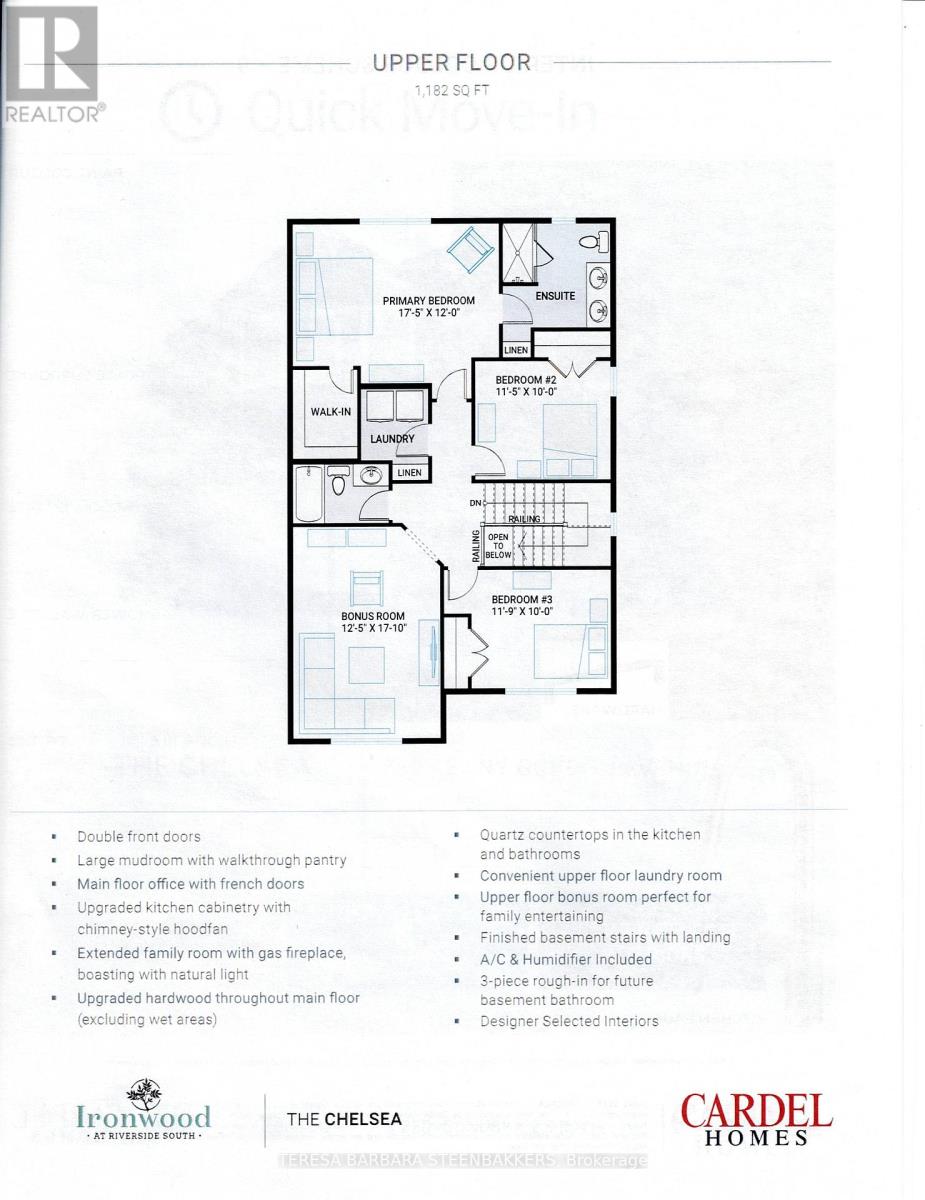 This home is gorgeous inside, with designer finishes in unusual, warm and light colours, so lovely!! Excellent pricing for a brand new home with a full Tarion Warranty and pre-delivery inspection. This newly developed area is close to Barrhaven's most popular major shopping/box stores and offers recently built schools within walking distance as well as light rail/public transit nearby. This one-of-a-kind home features popular builder upgrades incl attractive double front entry doors, beautiful kitchen cabinetry, quartz c/tops, upgraded main floor hardwood flrs and visually open/ finished bsmt stairs to the lower level with a 3pc bath rough-in. Add in a dedicated main floor office in addition to the modern, open concept floor layout. Upstairs, there are 3 bedrooms plus a bonus room to fit an active social family requiring the extra space to invite/entertain friends as needed. Floor Plan showing the convenient second floor laundry room is in photos and other builder information is available by realtor request. Current taxes are for land and property to be reassessed on closing, Pin number to be confirmed. Offers are to be communicated during regular business hours, if possible, with a minimum 24 hr irrevocable Deposit to be held by Seller's lawyer., Seller is Cardel Homes Inc. (id:64974)