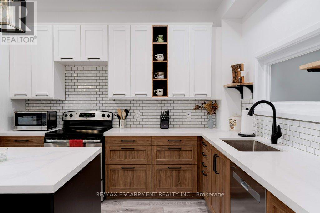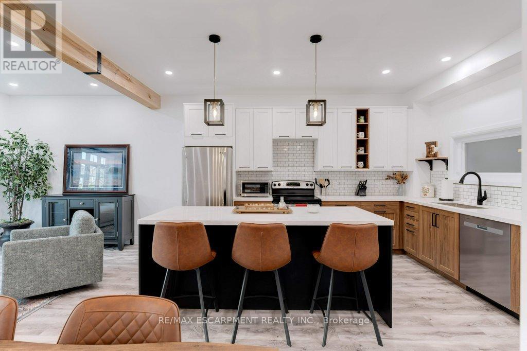 This beautifully upgraded freehold townhome in the heart of Waterdown delivers an exceptional blend of modern design, everyday comfort, and unbeatable convenience. Bathed in natural light, the home feels bright and inviting throughout, with a striking central skylight that fills the upper level with warmth. Completely renovated with permits in 2022, the thoughtfully reimagined layout offers seamless open-concept living that effortlessly connects indoor and outdoor spaces-ideal for both family life and entertaining. At the centre of the home is a stunning custom kitchen, completed in 2023, combining style and functionality with high-end finishes. A handcrafted hickory-clad beam adds character, while the custom staircase and railings create a standout architectural feature. Organization is elevated with built in custom California Closets installed in every bedroom and the upper-level laundry area, ensuring practical, well-designed storage throughout. Extensive upgrades provide both comfort and peace of mind, including a new roof in 2023 with a 40-year warranty, updated flooring, carpet, trim, and fresh paint. Roxul Safe 'n' Sound insulation has been added to the main floor ceiling, interior walls, and party walls for enhanced privacy and quiet. The ducts and furnace were professionally cleaned in 2023, completing the home's comprehensive list of improvements. Outside, professionally landscaped yard feature low-maintenance turf in the back, offering year-round greenery with minimal upkeep. Perfectly situated close to schools, parks, trails, the YMCA, shopping, dining, and vibrant downtown Waterdown, this home also provides quick access to Aldershot GO Station and major highways including the QEW, 403, 407, and Highway 6. Stylish, turnkey, and impeccably maintained, this is a rare opportunity to own in one of Waterdown's most sought-after communities. RSA. (id:64974)