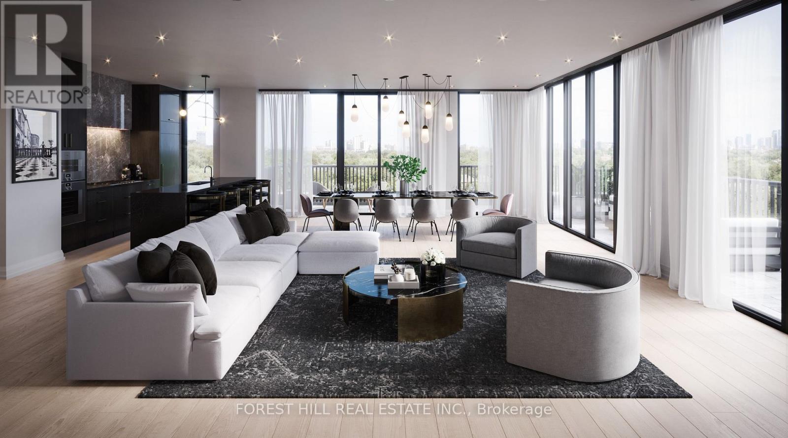 Welcome to The Rhodes - a truly unique, boutique residence with only 25 suites, offering exceptional privacy and quiet luxury. Ideally located where Forest Hill, Cedarvale, and the Upper Village meet, this is a rare opportunity to own in a building that blends tranquility with urban sophistication. Perched above Forest Hill and Cedarvale, this suite offers sweeping, tree-lined vistas reminiscent of Central Park. From every window, you're surrounded by canopy of mature greenery and historic rooftops - a serene, forest-like setting in the heart of the city. From the moment you enter, a sense of calm and privacy sets in - an extraordinary urban refuge that must be seen to be fully appreciated. This brand new 2-bedroom, 3-bathroom suite features direct elevator access into a private rotunda and foyer leading into a grand, open layout. Currently unfinished and fully customizable, buyers can personalize their space or opt for the premium standard finish package, included in the purchase price and completed within 90 days of a firm sale. Standard finishes include 7" wide plank engineered hardwood, quartz countertops, Gaggenau appliances, 7" baseboards, and 8' solid core doors. Suite highlights include 10' flat ceilings, architectural windows, in-floor heating in the primary ensuite. The east facing balcony is shared by both bedrooms, while the west-facing terrace off the living area offers partial coverage, a gas BBQ rough-in, and a beautifully landscaped planter with a large tree and seasonal florals. Enjoy refined living and white glove concierge service provided by the Forest Hill Group. (id:64974)