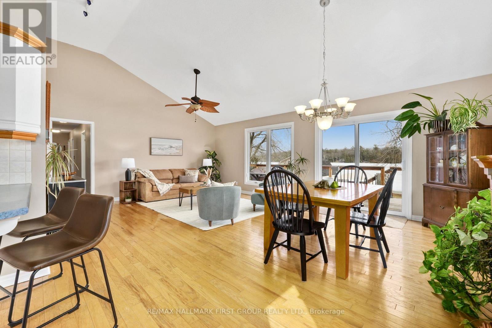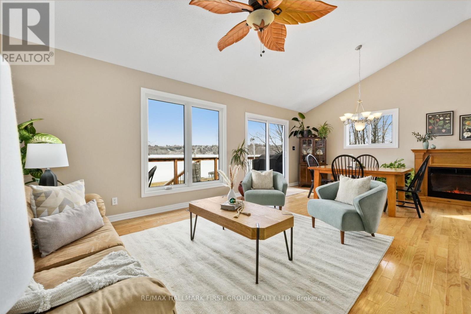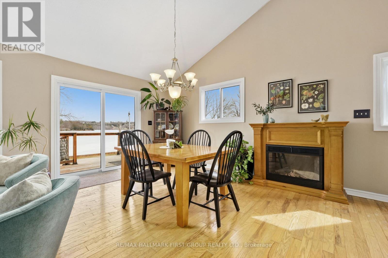 Set along the shores of Rice Lake, this waterfront property offers a thoughtful blend of comfort, functionality, and effortless connection to the outdoors, complete with an attached two-bay garage and boathouse. The main level is designed for easy living and gathering, with an open principal space highlighted by vaulted ceilings and expansive windows that frame unobstructed water views. A walkout from the dining area extends the living space outdoors, creating a natural flow for entertaining and everyday enjoyment by the lake. The kitchen is both practical and inviting, featuring ample counter and cabinet space, matching appliances, recessed lighting. A prep peninsula with breakfast bar and character rich open shelving adds warmth and personality to the space. Three well-appointed bedrooms are located on the main level, including a primary retreat with a walk-in closet. A full bathroom features a separate tub and glass shower enclosure, complemented by a convenient main-floor laundry and powder room. The lower level adds versatility with a cozy rec room anchored by a stove-style fireplace, a bright guest bedroom, a full bathroom, and a sauna for added relaxation. A separate entrance leads to the garage, which has been thoughtfully adapted to provide additional living space ideal for a games room or entertaining area. Outdoors, an elevated deck captures sweeping lake views and sets the scene for al fresco dining and sunset evenings, while a lower deck and generous green space invite time spent outdoors. Mature trees line the property's edges, enhancing privacy. The pristine shoreline is equipped for full enjoyment of lake life with a boathouse, marine rail, dock, and fire pit, creating a setting that is ready to be enjoyed in every season, with easy access to nearby trails for year-round recreation. (id:64974)