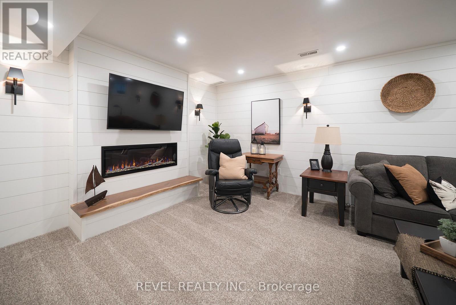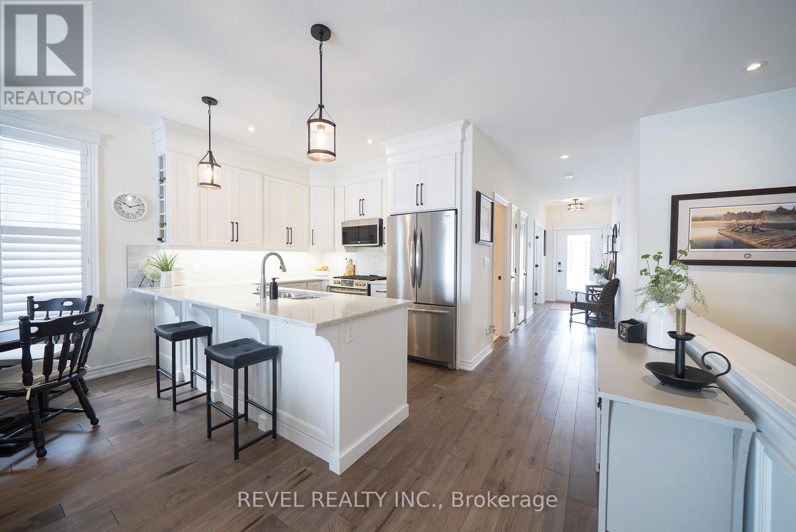 Welcome to this beautifully maintained 2+1 bedroom, 3 bathroom bungalow in the charming small town of Jarvis- voted as "Canada's Kindest Community" and just a short drive to the beaches and amenities of Port Dover. Nestled within a quiet, welcoming neighbourhood that still fosters a strong sense of community, this common elements condominium offers a thoughtful layout, modern finishes, and comfortable one-floor living with a fully finished basement-ideal for downsizers, professionals, or those seeking low-maintenance living. The main floor boasts engineered oak hardwood in the principal rooms, a versatile front bedroom/den with double doors, and a 4-piece guest bathroom with tiled floors and tub/shower combo. The bright kitchen offers white shaker cabinetry, quartz countertops, subway tile backsplash, peninsula, and stainless steel Frigidaire appliances. The open living/dining area includes a natural gas fireplace and patio doors that lead out to the backyard. The primary suite features a walk-in closet and a 3-piece glass shower ensuite, plus convenient main-floor laundry with garage access. The fully renovated (2022) basement provides a spacious recreation room with shiplap accent walls, sconce lighting, and an electric fireplace-ideal for relaxing or entertaining-along with a large bedroom featuring a proper egress window and generous closet, plus ensuite privilege to a stylish 3-piece bathroom with glass shower. Step outside to the covered backyard patio, a perfect space to enjoy your morning coffee, host summer dinners, or unwind in any season. Thoughtfully designed, move-in ready, and located in a welcoming community that offers small-town charm with nearby lakeside access, this home delivers comfort, style, and easy living-an excellent opportunity in Jarvis. (id:64974)