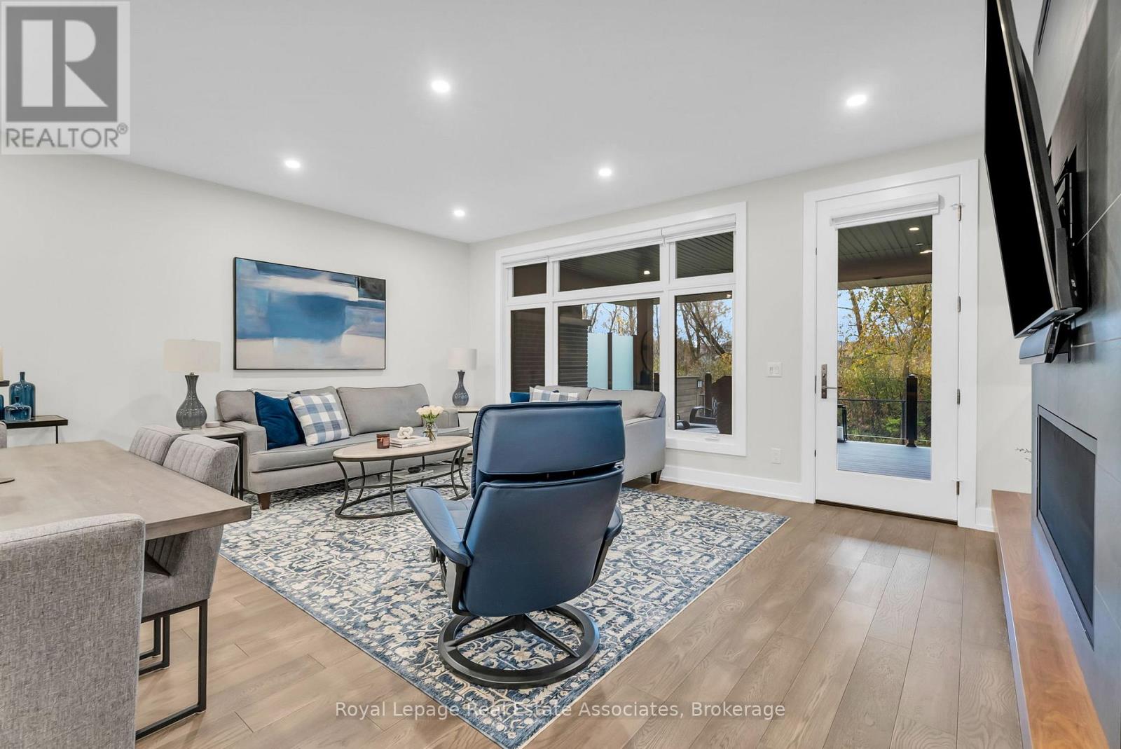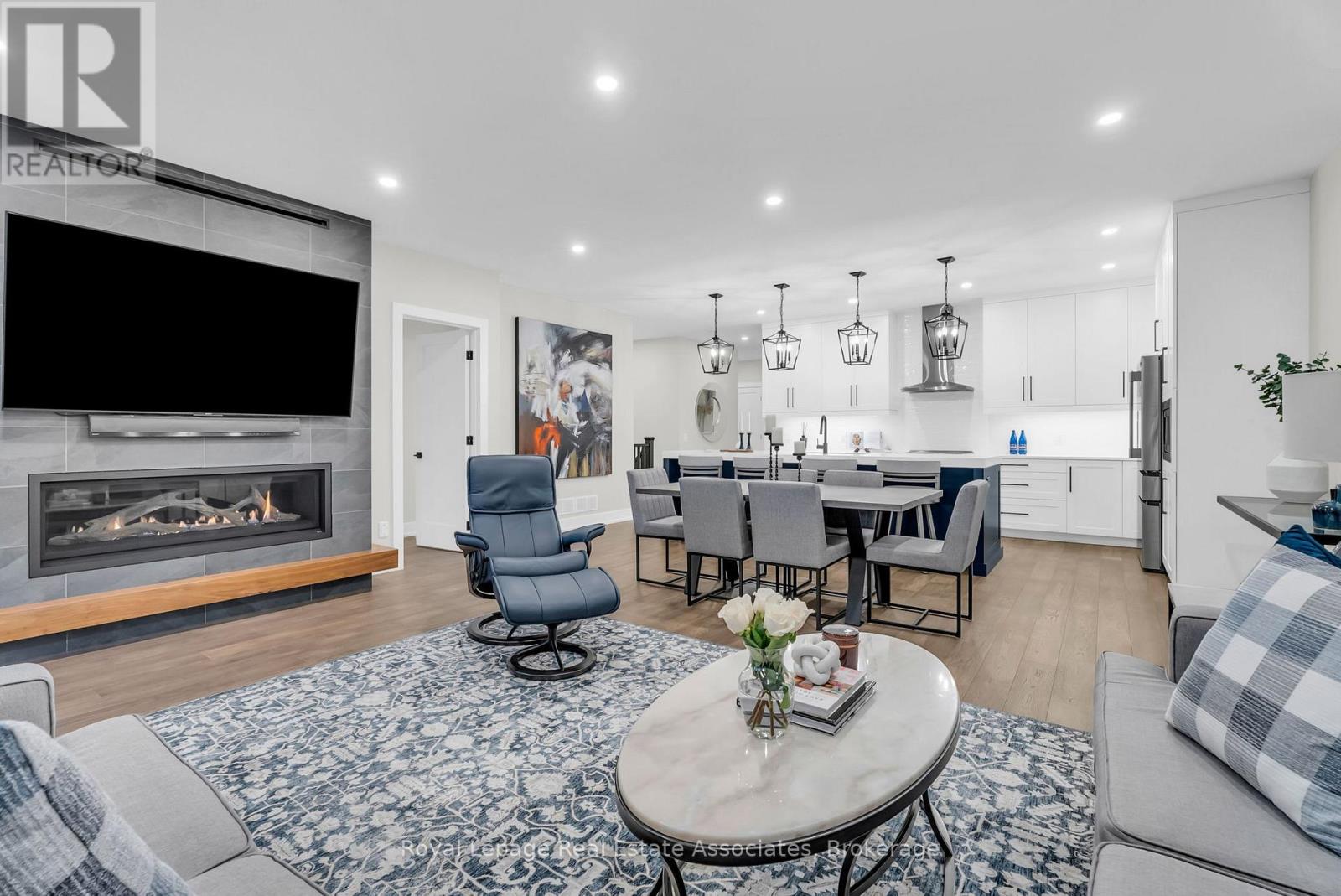 Welcome to this award-winning, Rinaldi-built luxury end-unit bungalow townhome, nestled in an exclusive community surrounded by protected green space. Only 4 years old, this home shows like new and features over $100,000 in premium upgrades. The main floor boasts 9' ceilings and includes 2 bedrooms, a fully upgraded kitchen with a stunning 10' island, and a spacious family room highlighted by a custom linear fireplace. The primary bedroom offers a walk-in closet and a luxurious ensuite with designer finishes. The finished basement impresses with 8' ceilings, an expansive recreation room, a full bathroom, and a large bedroom, providing ample space for guests or family. Additional upgrades include motorized window coverings, extensive pot lighting, and upgraded cabinetry and countertops throughout. Step outside to enjoy the morning sunrise from the 16' x 20' Trex deck or the lower patio, both overlooking a premium lot backing onto protected woodland-the perfect setting for peace and privacy. Experience ultimate 'lock and leave' lifestyle in this elegant bungalow townhome that is located minutes to all amenities. Forget exterior chores-the low maintenance fee covers your sprinkler system, grass cutting, snow removal. Enjoy sophisticated modern living with four key amenity rough-ins already complete: a central vacuum system, gas Stove, an elegant wet bar for effortless entertaining, and an electric vehicle (EV) charger in the garage. These spaces are professionally prepared for immediate installation and personalization. (id:64974)