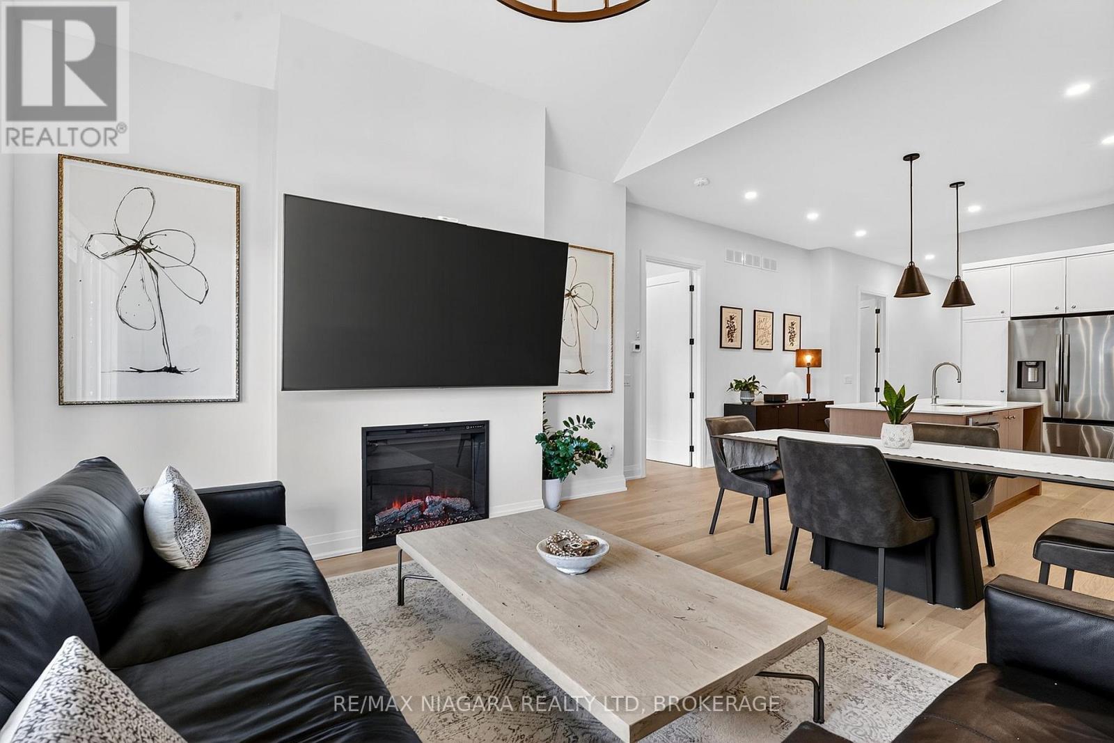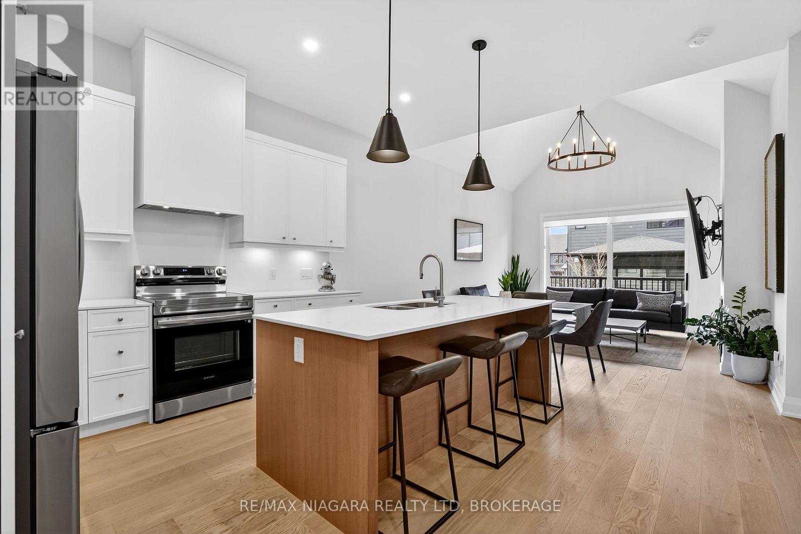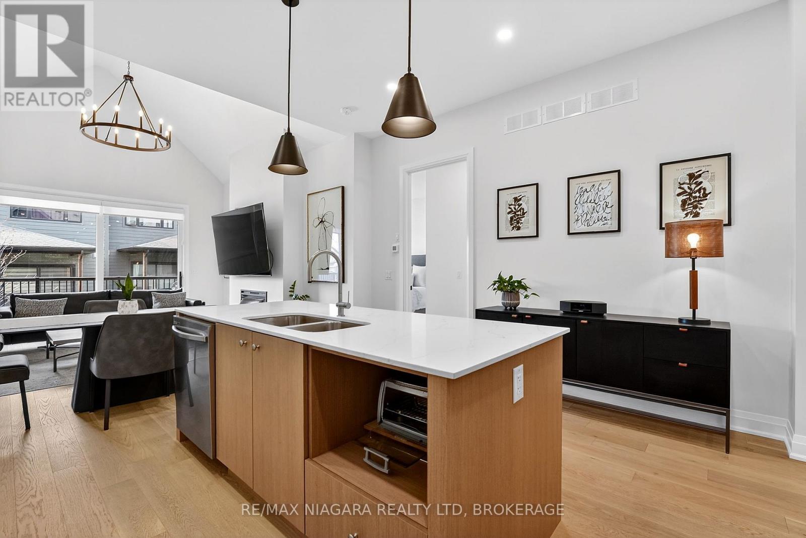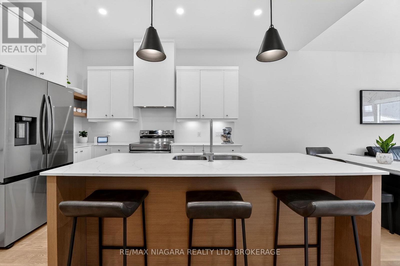 Experience luxury, low-maintenance living in this stunning interior-unit bungalow townhouse in Thorold, designed by ACK and ideally situated close to all amenities. Showcasing exceptional curb appeal, this thoughtfully designed home offers 2 bedrooms, 2 bathrooms, soaring 10-foot ceilings, and a vaulted great room that creates a bright, spacious feel. Features include hardwood flooring, custom kitchen cabinetry, tiled glass showers, 8-foot interior doors, main-floor laundry, and a covered rear deck perfect for relaxing or entertaining. Enjoy a carefree lifestyle with snow removal and lawn maintenance included. Located near schools, shopping, golf courses, and convenient QEW access, this home combines comfort, style, and convenience. (id:64974)
