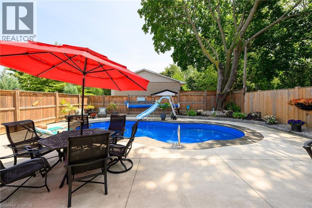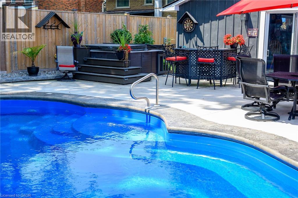 LAKESIDE LIVING! Just around the corner from the waterfront park. Beautifully updated throughout with open concept design. Set on large property with manicured grounds. Two large, paved driveways (2022), inground saltwater heated pool (new 2022), hot tub with resort style backyard Oasis! Chef's kitchen (new 2021) with island & appliances. Main floor family room open to kitchen with large bay window & glass doors leading to very private outdoor dining area. Primary bedroom with walk-in closet. 4PC ensuite bath (new 2020). Bright & spacious lower-level rec room with oversized windows, wet bar, additional bedroom & full bath, laundry room with washer/dryer (new 2020). Inside entry to fabulous 2.5 car garage/man cave with wood stove & epoxy floor. OTHER FEATURES INCLUDE: 200 amp service, new roof shingles (fall 2024), new windows 2021, BBQ hut with natural gas hookup. Hot water tank owned (new 2020), garage door opener, central air, central vac. This home is ideally suited for in-law accommodation. Short stroll to waterfront trails, schools & conveniences, 5 minutes from wineries & easy access to QEW. Nothing to do but move in & enjoy your very own resort lifestyle - at home! (id:64974)