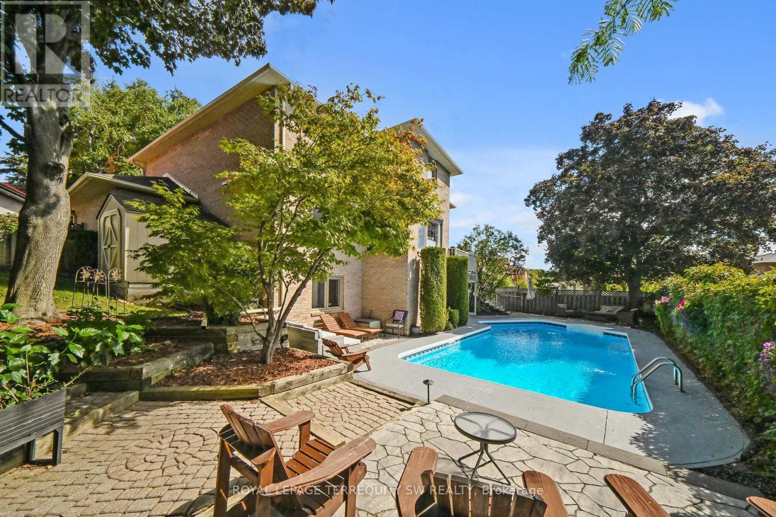 Tucked away on a quiet cul-de-sac in one of Brampton's most established enclaves, 8 Chalmers Court offers an exceptional balance of elegance, comfort, and family functionality. This detached 2 storey executive brick home sits on a mature, pie-shaped lot measuring 52 ft across at the front widening to over 130ft at the rear-surrounded by manicured gardens, mature trees, and resort-style outdoor living with a stone patio, gazebo, pristine heated in-ground pool. A gracious foyer opens to distinct principal rooms with refined finishes: formal living and dining rooms with French drs, smooth ceilings, and gleaming hardwood floors; a bright family room anchored by a gas fireplace, built-in cabinetry, and patio doors to the sun deck. The chef's kitchen impresses with granite countertops, centre island, custom backsplash, gas stove, under-mount lighting, pot lights, beverage fridge, and stainless-steel appliances. The adjoining breakfast rm-featuring a bay window and walk-out to the deck-overlooks the lush gardens, gazebo, and pool. Upstairs, the spacious primary suite (incorporating the fifth bedroom) offers a private dressing area, hardwood floors, and a luxurious 4-pc ensuite with heated floors, double sinks, glass shower, and standalone tub. Three additional bedrooms and a skylit hallway complete the level. The finished lower level adds a versatile recreation room with wood-burning fireplace, wet bar, games area, 4-pc bath with Jacuzzi, exercise space, built-ins, and a walk-out to the patio. Recent updates include roof(2023), main bath(2016), new blinds throughout, 200-amp service + pony panel, pool liner(10 yrs), pump(5 yrs), heater(10 yrs), and backyard patio (3 yrs). Additional features: central air, central vac, security system, in-ground sprinklers, landscape lighting, and gas line for BBQ/fire table. Minutes to schools, parks, and major routes (410/407/401), a beautifully maintained executive residence on a peaceful court-pride of ownership shines inside and out. (id:64974)