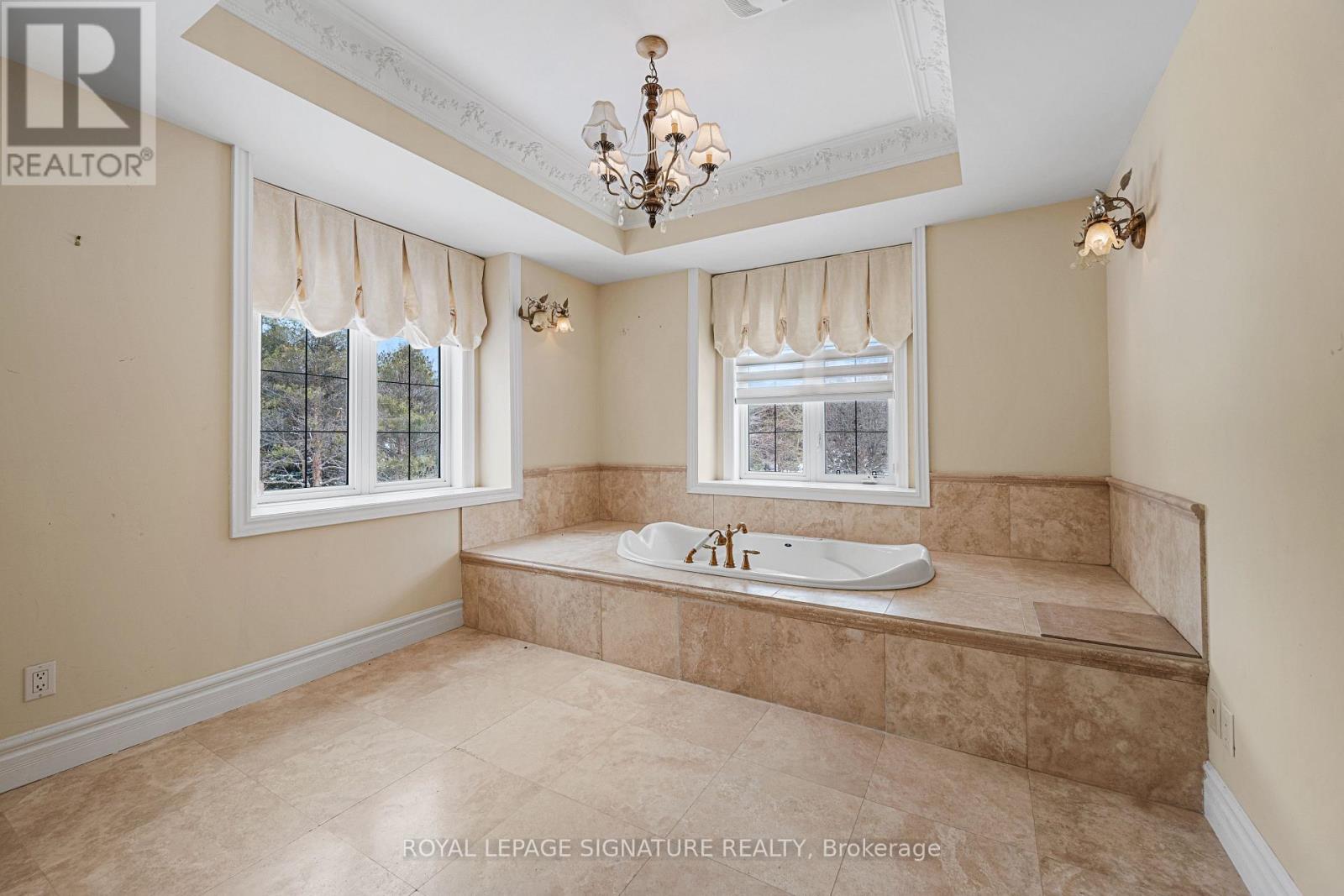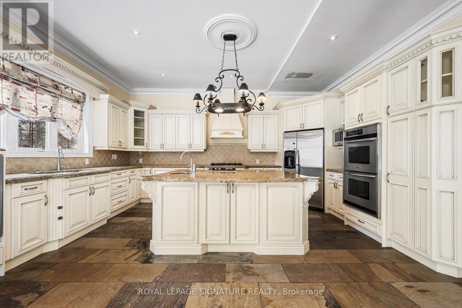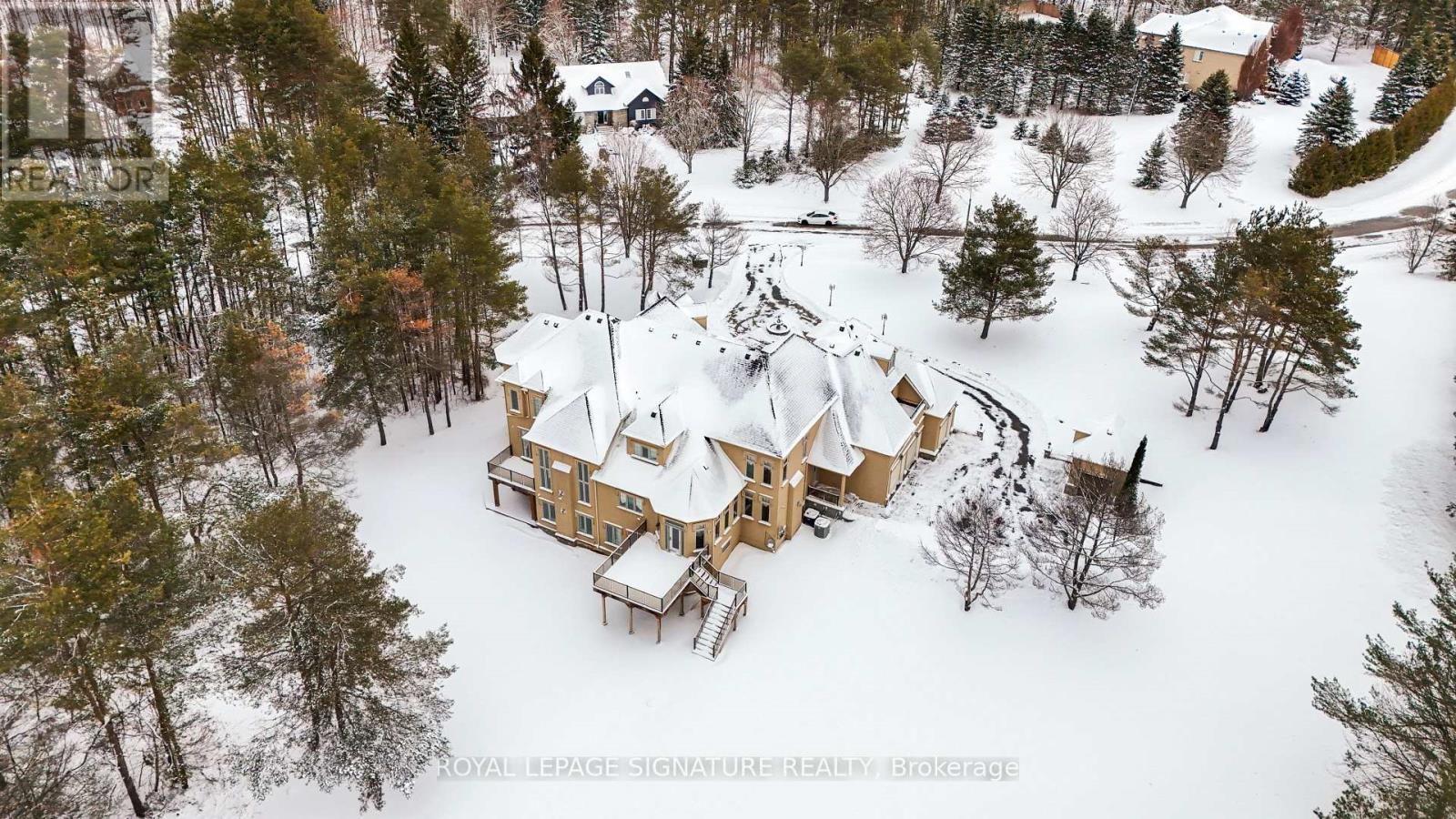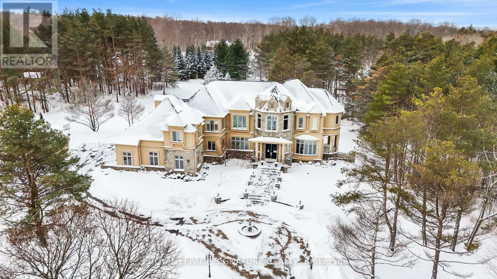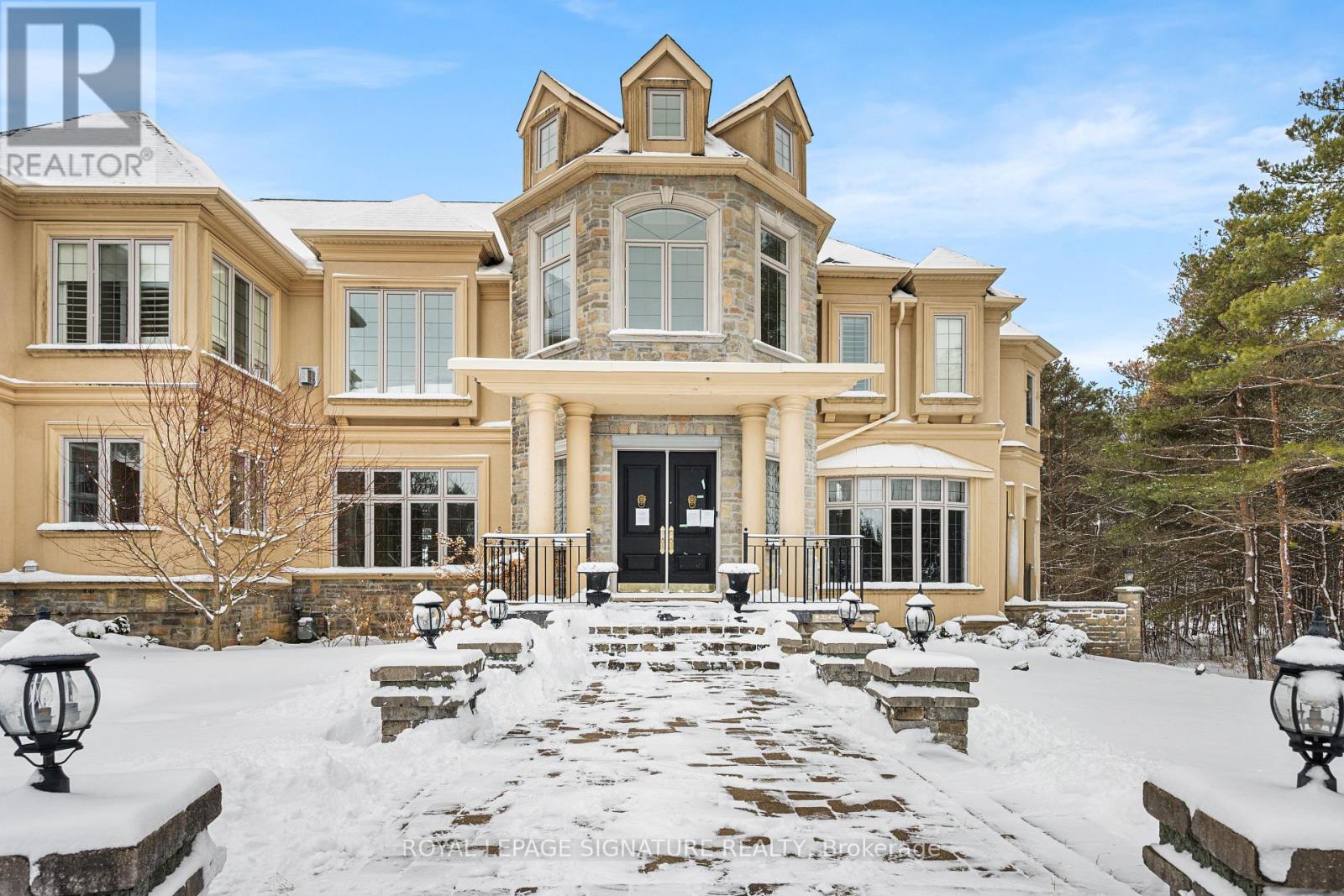 Welcome to this rare offering combining over 8500 sq ft of total living space, thoughtful design, and a prestigious setting in an exclusive enclave. Nestled on a quiet private cul-de-sac and surrounded by prestigious multi-million-dollar estates, this exceptional residence sits on a sprawling two-acre lot offering privacy, space, and refined living. A grand main floor welcomes you with soaring ceilings and elegant tile flooring throughout, creating a bright and open atmosphere ideal for both everyday living and entertaining. A thoughtfully tucked-away office with warm natural wood accents provides ample work-from-home space, while the bright formal dining room showcases crown moulding and timeless charm. Chef's kitchen featuring stone countertops, a stone centre island, and a breakfast area with walkout to the deck-perfect for seamless indoor-outdoor living. Multiple gas fireplaces add warmth and character throughout the home. The upper level features four spacious bedrooms, each with its own private ensuite. The expansive primary retreat offers a luxurious five-piece spa-like ensuite and plenty of room to relax. The above-grade lower level provides exceptional versatility with two additional bedrooms, a kitchen, comfortable sitting area, and flexible space ideal for a gym, recreation area, or playroom. Multiple walkouts lead directly to the expansive backyard, creating endless opportunities for outdoor enjoyment. Walk to Hanson's Chinese + Pizza, Whitchurch Conservation Area, and a quick drive to Highway 404, golf courses, Longo's, Farm Boy, Walmart, Pharmacies and more. (id:64974)