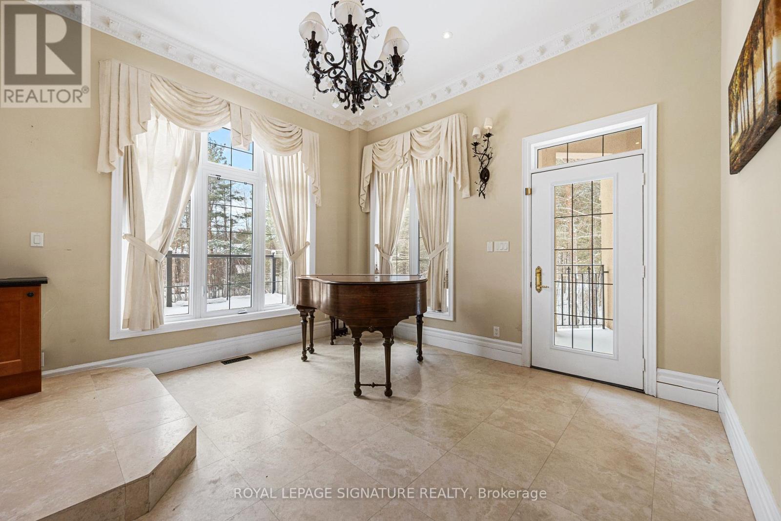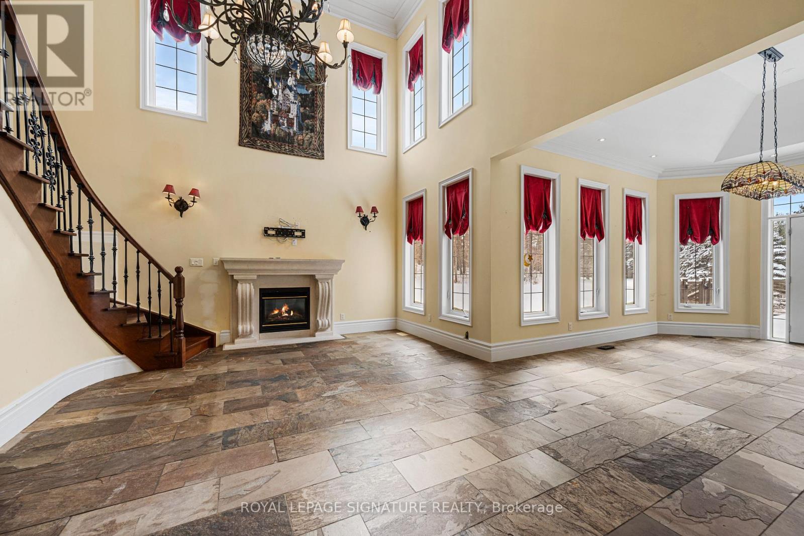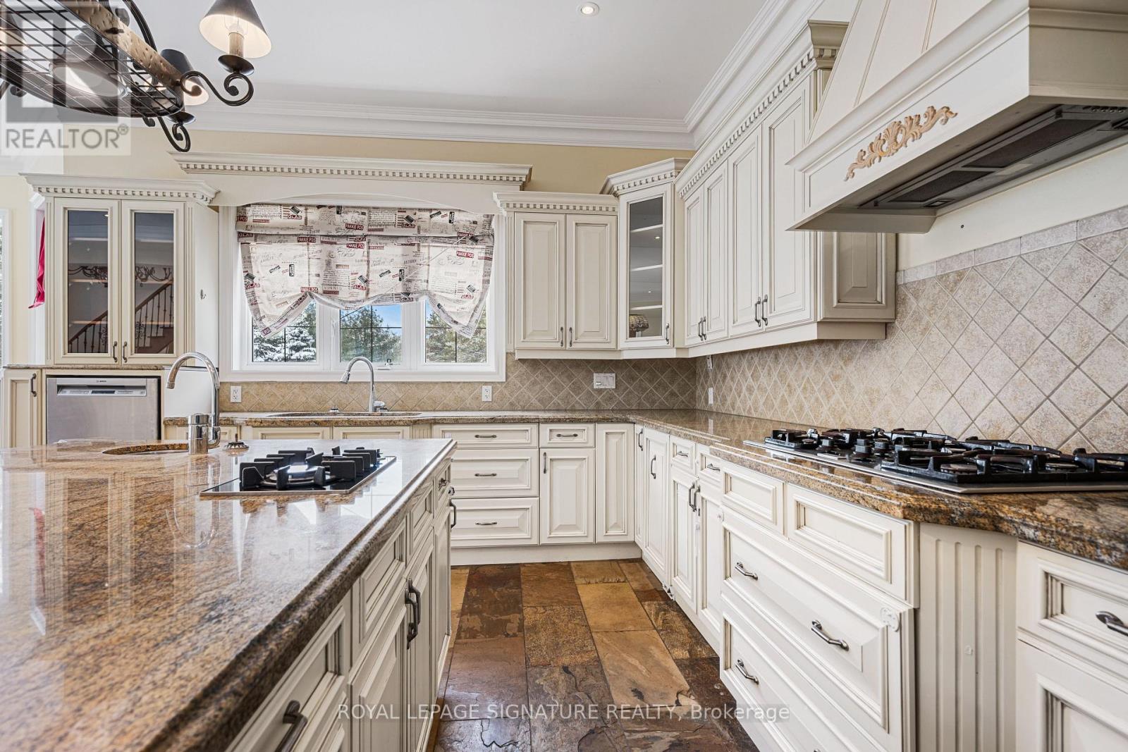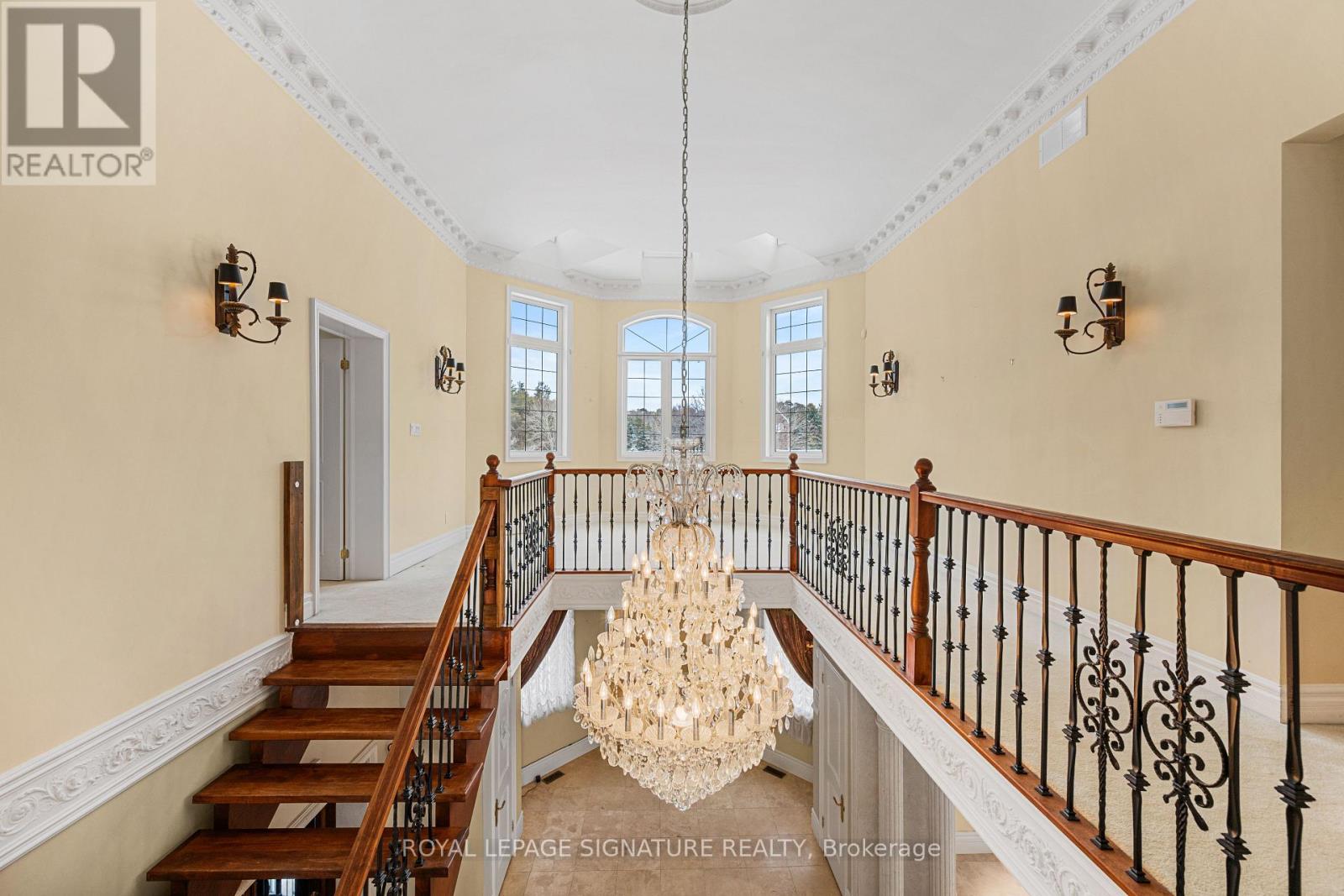 Welcome to this rare offering combining over 8500 sq ft of total living space, thoughtful design, and a prestigious setting in an exclusive enclave. Nestled on a quiet private cul-de-sac and surrounded by prestigious multi-million-dollar estates, this exceptional residence sits on a sprawling two-acre lot offering privacy, space, and refined living. A grand main floor welcomes you with soaring ceilings and elegant tile flooring throughout, creating a bright and open atmosphere ideal for both everyday living and entertaining. A thoughtfully tucked-away office with warm natural wood accents provides ample work-from-home space, while the bright formal dining room showcases crown moulding and timeless charm. Chef's kitchen featuring stone countertops, a stone centre island, and a breakfast area with walkout to the deck-perfect for seamless indoor-outdoor living. Multiple gas fireplaces add warmth and character throughout the home. The upper level features four spacious bedrooms, each with its own private ensuite. The expansive primary retreat offers a luxurious five-piece spa-like ensuite and plenty of room to relax. The above-grade lower level provides exceptional versatility with two additional bedrooms, a kitchen, comfortable sitting area, and flexible space ideal for a gym, recreation area, or playroom. Multiple walkouts lead directly to the expansive backyard, creating endless opportunities for outdoor enjoyment. Walk to Hanson's Chinese + Pizza, Whitchurch Conservation Area, and a quick drive to Highway 404, golf courses, Longo's, Farm Boy, Walmart, Pharmacies and more. (id:64974)
