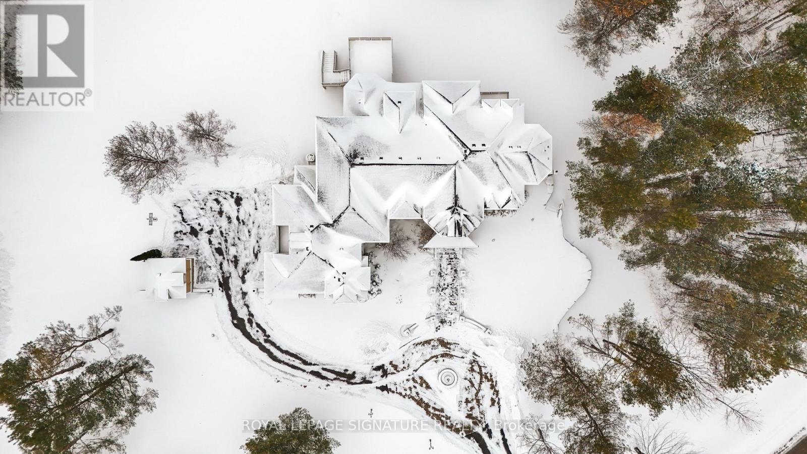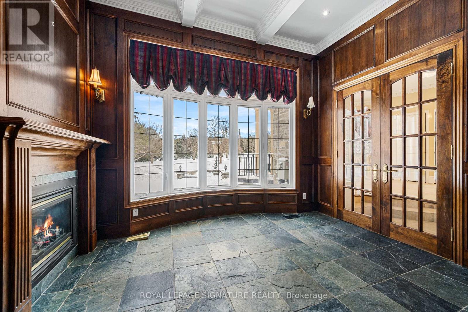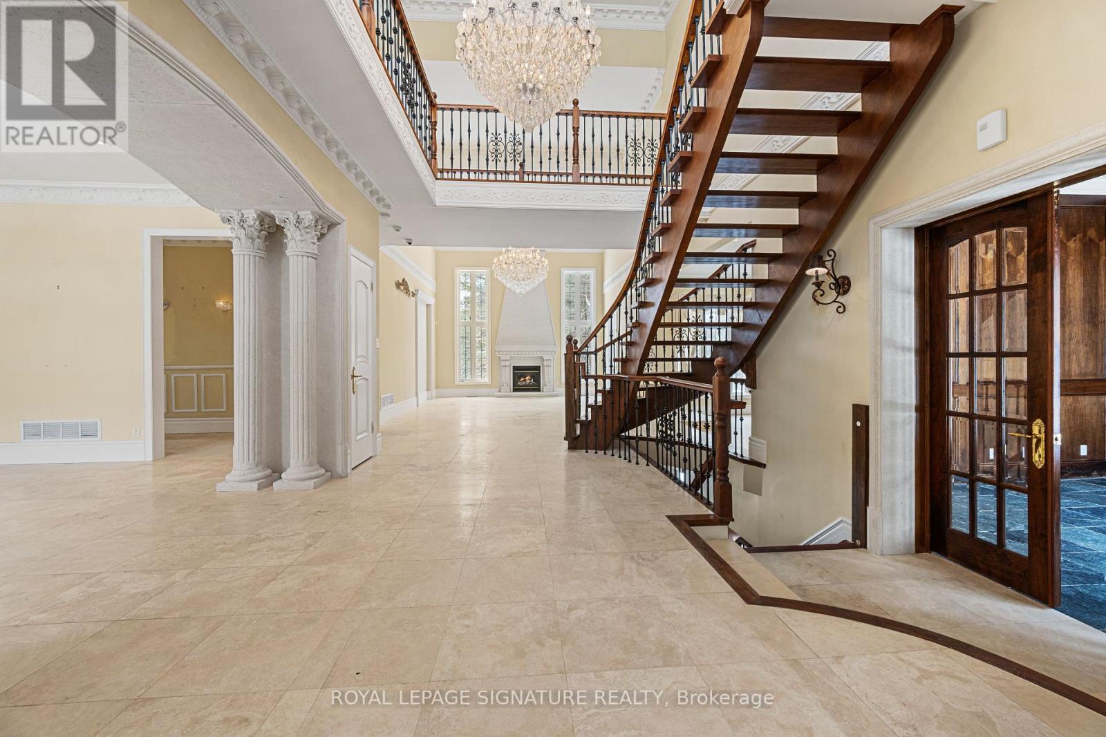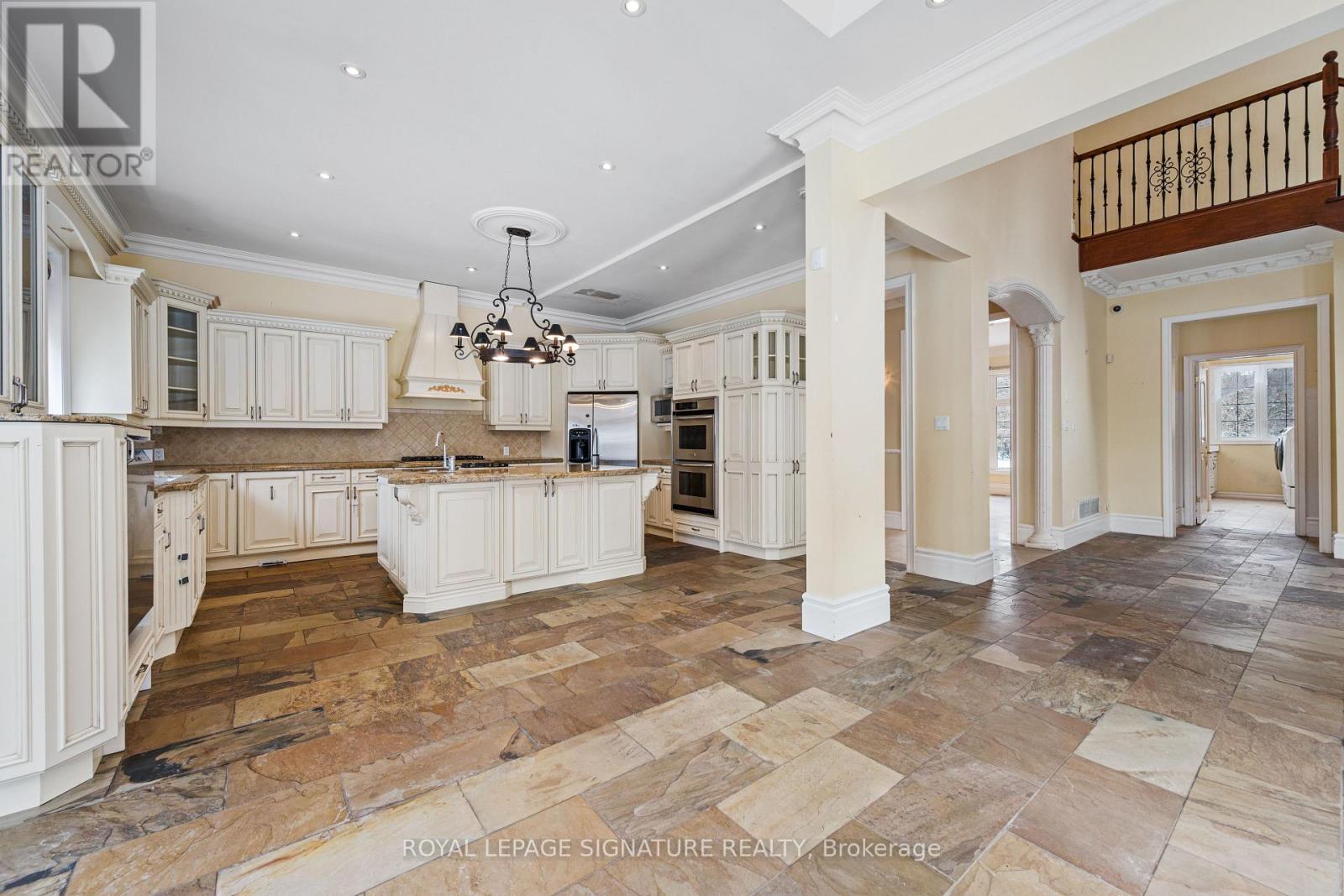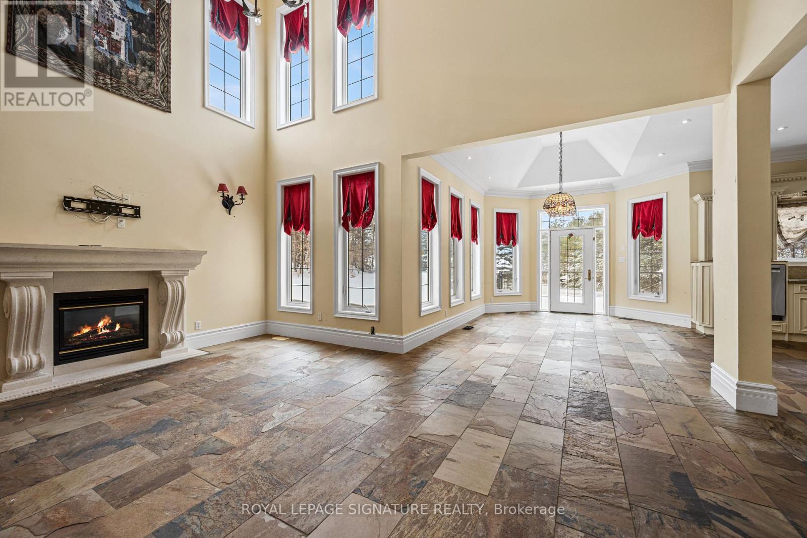 Welcome to this rare offering combining over 8500 sq ft of total living space, thoughtful design, and a prestigious setting in an exclusive enclave. Nestled on a quiet private cul-de-sac and surrounded by prestigious multi-million-dollar estates, this exceptional residence sits on a sprawling two-acre lot offering privacy, space, and refined living. A grand main floor welcomes you with soaring ceilings and elegant tile flooring throughout, creating a bright and open atmosphere ideal for both everyday living and entertaining. A thoughtfully tucked-away office with warm natural wood accents provides ample work-from-home space, while the bright formal dining room showcases crown moulding and timeless charm. Chef's kitchen featuring stone countertops, a stone centre island, and a breakfast area with walkout to the deck-perfect for seamless indoor-outdoor living. Multiple gas fireplaces add warmth and character throughout the home. The upper level features four spacious bedrooms, each with its own private ensuite. The expansive primary retreat offers a luxurious five-piece spa-like ensuite and plenty of room to relax. The above-grade lower level provides exceptional versatility with two additional bedrooms, a kitchen, comfortable sitting area, and flexible space ideal for a gym, recreation area, or playroom. Multiple walkouts lead directly to the expansive backyard, creating endless opportunities for outdoor enjoyment. Walk to Hanson's Chinese + Pizza, Whitchurch Conservation Area, and a quick drive to Highway 404, golf courses, Longo's, Farm Boy, Walmart, Pharmacies and more. (id:64974)