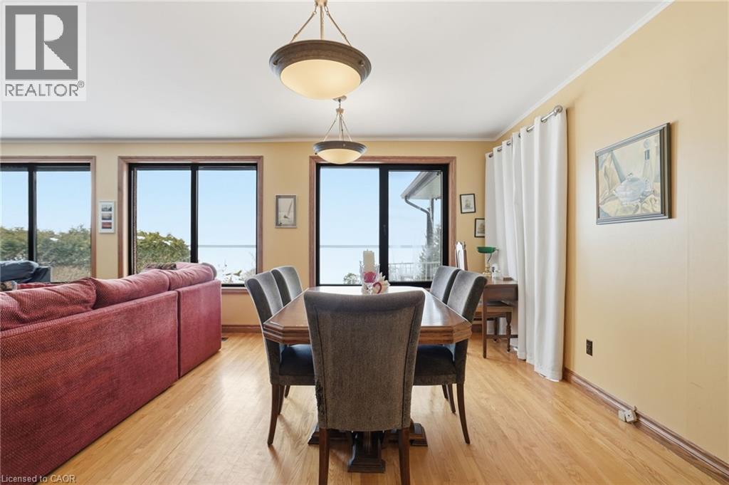 Welcome to waterfront living at its finest on Firelane 14D. This exceptional 2+1 bedroom lakefront home offers approximately 1,500 sq ft above grade with breathtaking, unobstructed views across Lake Ontario—where, on clear days, you can see the Toronto skyline in the distance. From vibrant summer sunsets to dramatic winter ice formations, the setting is truly spectacular year-round. Designed to maximize natural light and lake views, the bright open-concept main floor is flooded with sunshine through expansive panoramic windows, complete with electric blackout storm shutters for comfort and security. Hardwood flooring runs throughout the entire main level, creating warmth and continuity. The spacious living room showcases stunning water views and flows into a separate formal dining room—ideal for entertaining. The eat-in kitchen offers ample cabinetry and workspace, along with a casual dining area perfect for everyday meals overlooking the lake. The main floor features two generously sized bedrooms, each with its own private ensuite. The primary bedroom includes a 4-piece ensuite, while the second bedroom offers a 3-piece ensuite—providing excellent comfort and privacy for family or guests. The fully finished lower level, complete with a separate entrance, adds incredible versatility with an additional bedroom, 3-piece bath, and flexible living space ideal for extended family, guests, a home office, or recreation area. Outdoors, multiple deck areas and professional landscaping create beautiful spaces to relax or entertain. Enjoy swimming, kayaking, boating, and peaceful walks along nearby conservation lands and the 8 Mile Creek biosphere. A 1.5-car attached garage with inside entry, separate shed, concrete driveway, and parking for five vehicles complete the package. Tucked away on a private maintained road yet minutes to the QEW, Niagara-on-the-Lake, St. Catharines, wineries, schools, and shopping—this is waterfront living without compromise. (id:64974)