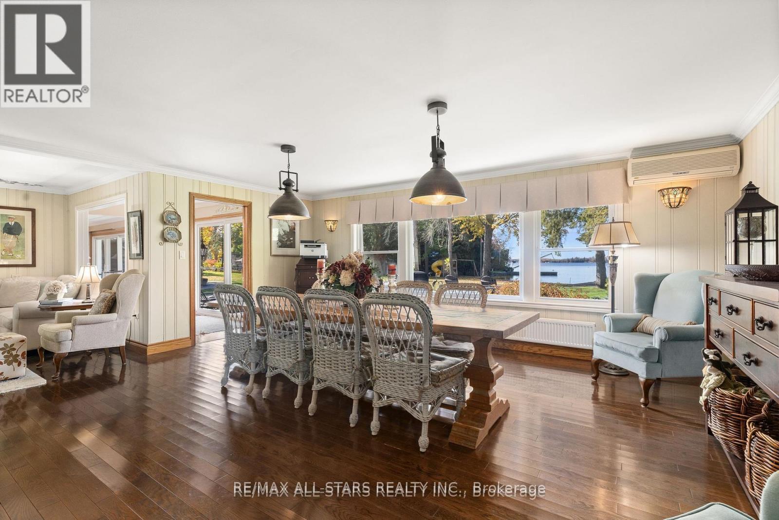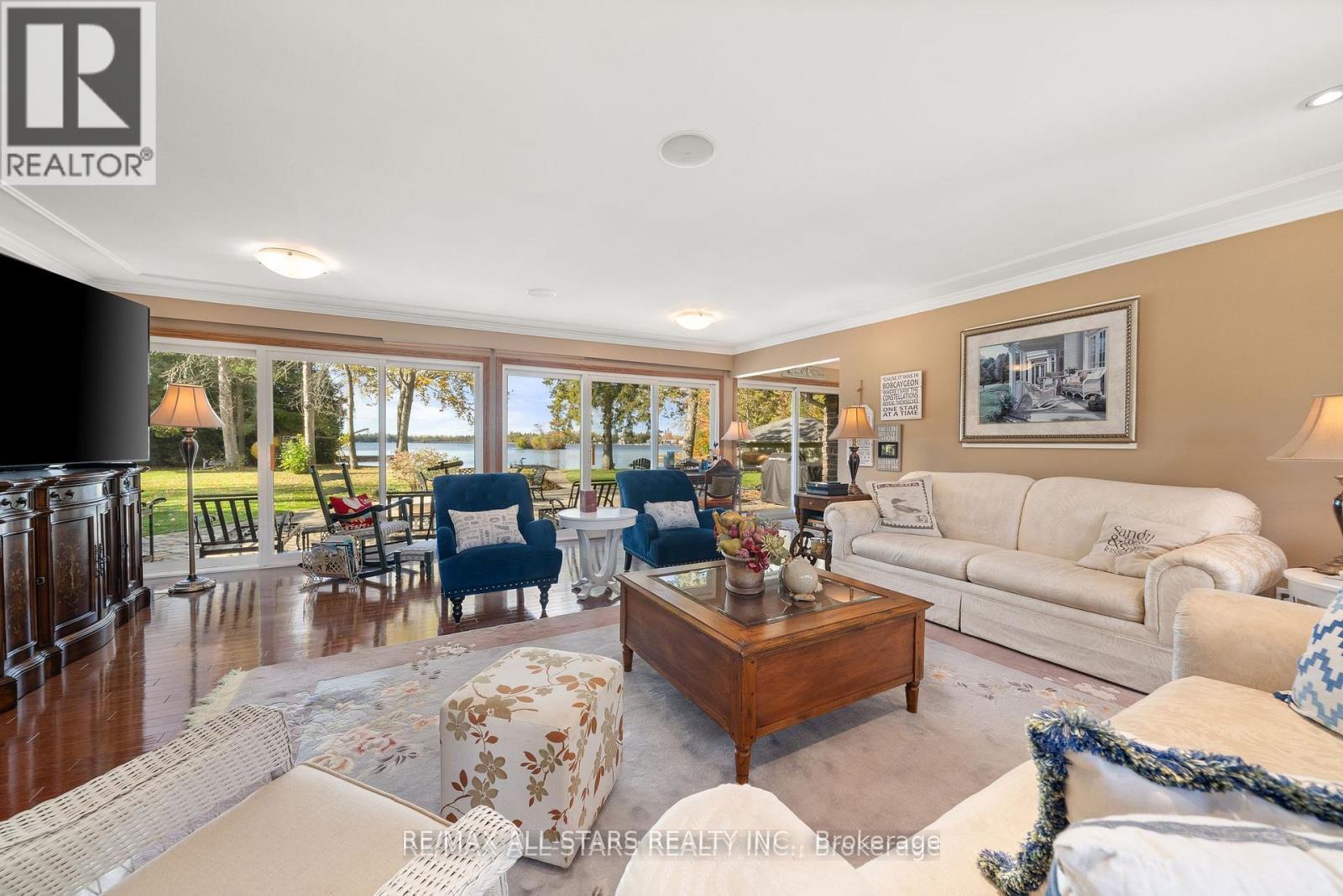 Experience lakeside luxury on the shores of beautiful Sturgeon Lake. Nestled on over half an acre in one of Bobcaygeon's most exclusive neighbourhoods, this exceptional property offers over 90 feet of clean, accessible shoreline-a rare find with full town services. Relax on the expansive patio where sweeping water views meet a manicured, irrigated lawn, or set out on the lake from your private double-slip boathouse. The circular drive leads to a three-car garage with a convenient drive-through to the backyard, making parking and storing recreational toys effortless. Inside, a grand living room with panoramic lake views sets the stage for entertaining. This tastefully remodelled residence blends timeless elegance with modern comfort. A commanding wood-burning stone fireplace anchors the formal dining space- an impressive setting for elegant dinners or family gatherings-served by a convenient butler's pantry in addition to the well-equipped kitchen. The inviting family room offers an intimate retreat, ideal for quiet evenings and meaningful conversation. With six bedrooms and 2.5 bathrooms, every guest is accommodated in comfort. The primary suite is a private sanctuary, featuring a generous walk-in closet and a spa-inspired ensuite with a Jacuzzi tub-the perfect place to unwind. Multiple patio doors and expansive windows invite natural light and frame breathtaking lake views from nearly every room, creating a sense of serenity and connection to nature throughout. Additional features include an integrated backup generator and an automated irrigation system for effortless, year-round living-all within walking distance of quaint downtown Bobcaygeon. This is more than a home-it's a refined lakeside lifestyle on Sturgeon Lake. Schedule your private viewing today and experience the serenity for yourself. (id:64974)