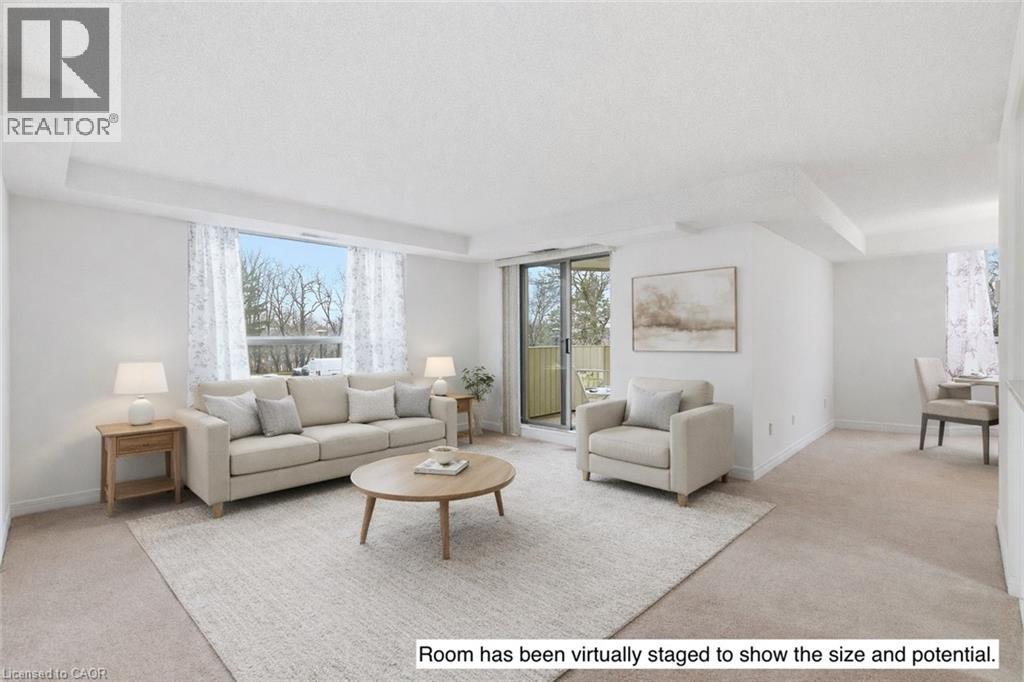 Welcome to 8 Village Green, Stoney Creek, located in Stoney Creek's historic and charming downtown King St area with quaint shops and restaurants. This well-maintained condominium apartment offers comfortable and spacious living (approx. 1200 square feet) in a desirable, well-managed community, popular with seniors and downsizers. Featuring 2 oversized bedrooms and 2 full bathrooms, a separate dining room for entertaining, and a bright and roomy living area with walkout to a private balcony large enough for a patio set: This home is ideal for relaxed every day living and great for someone who wants a space that's smaller and more manageable than their detached home with no snow to shovel and no lawn to cut! Great for snowbirds who want to simply lock the door and leave without worrying! Residents enjoy excellent building amenities including a workshop, library, exercise room, sauna, and party room with kitchen area. Convenient underground parking spot right near the elevator entry! Located near shopping, parks, transit, major highway access (Red Hill & QEW), Centennial Parkway, The Battlefield House and Park, Devil's Punchbowl and Waterfall, and the Bruce Trail. The suite overlooks the back of the building where there is serene greenspace and trees for privacy. Absolutely ideal for downsizers who still want space and a separate dining area, first time buyers who want a large condo, or anyone seeking low-maintenance, easy and enjoyable condo living! Lovingly cared for and maintained, the condo has been freshly painted and has new modern laminate flooring in the hallways (2026) Don't miss out on this desirable and affordable condominium! (id:64974)