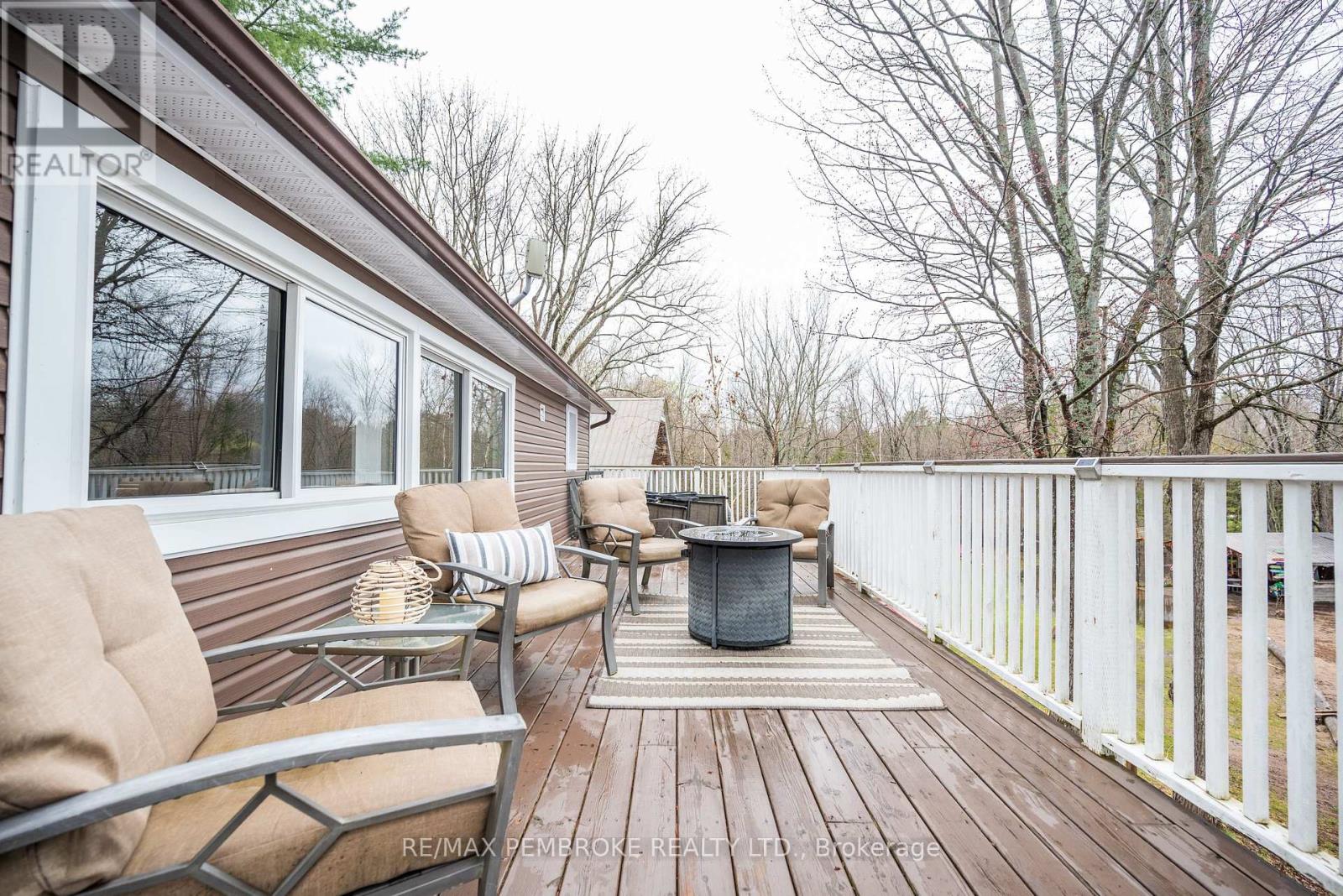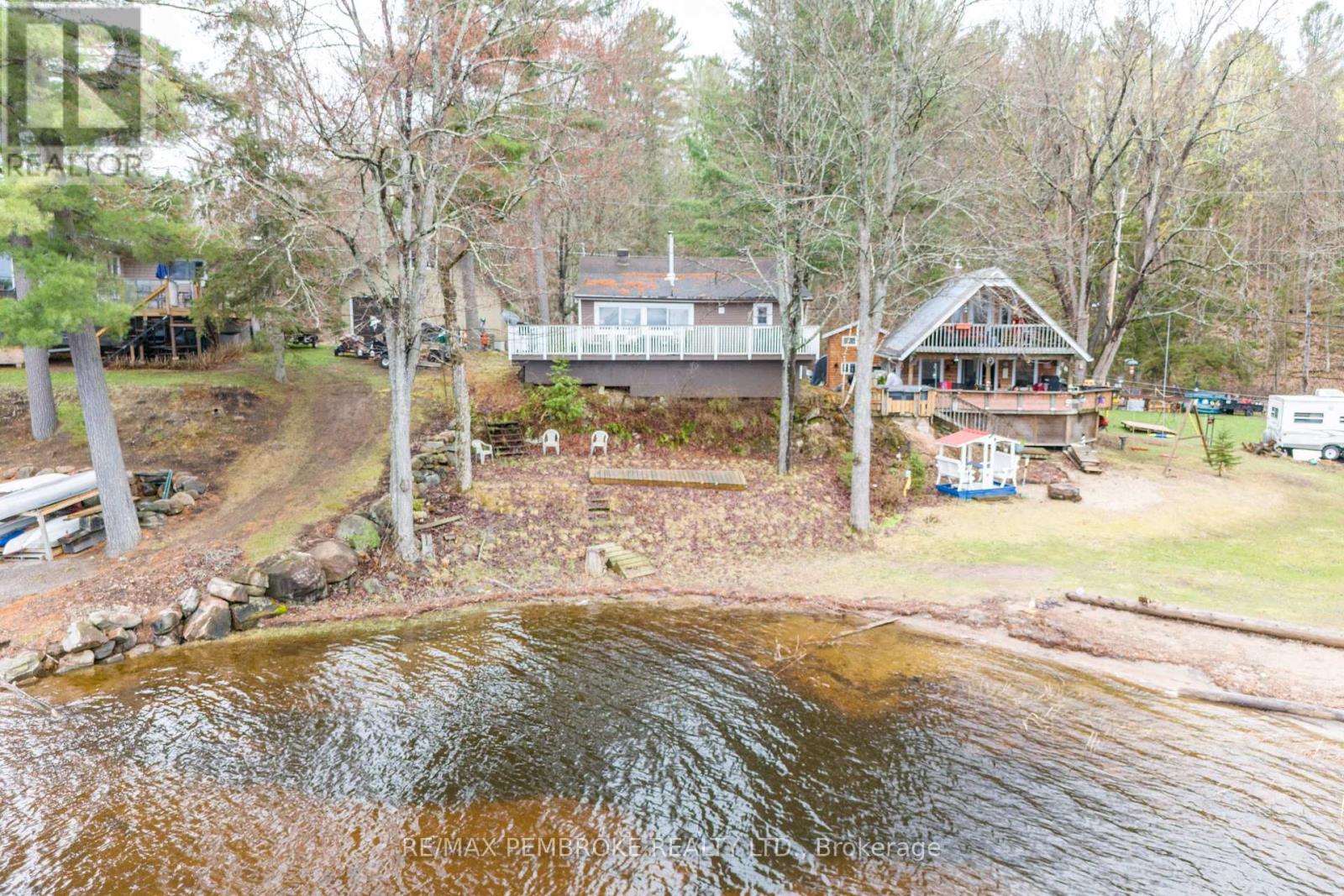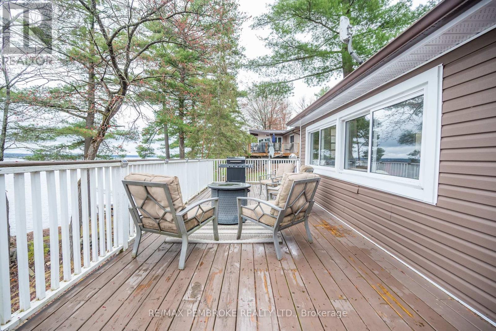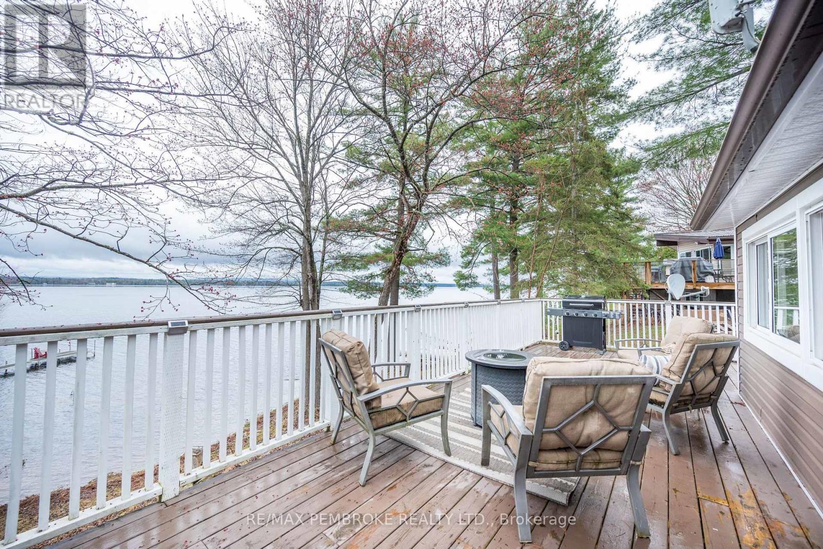 Welcome to your own boutique four-season retreat on the shores of the Ottawa River - where breathtaking sunsets and peaceful waterfront living become part of your everyday life. Tucked away on a private road and just minutes to Garrison Petawawa, this move-in ready home is the perfect blend of comfort, style, and convenience.Thoughtfully updated throughout, this charming home features a beautifully renovated kitchen and bathroom, new flooring, and fresh paint, creating a modern and inviting space. The open-concept living area is warm and welcoming, highlighted by a cozy propane fireplace - perfect for relaxing winter nights.Designed for easy living, the home offers one spacious bedroom that comfortably fits a king-size bed, making it ideal for professionals, down sizers, or those seeking a serene escape.Step outside to the wrap-around front deck and take in the incredible river views and unforgettable sunsets-your own private staycation, every day. A detached shed with power provides excellent storage or workspace for hobbies and outdoor gear.Additional features include 200 amp service and all appliances included-just move in and enjoy.Whether you're looking for a full-time residence or a peaceful waterfront getaway, this unique property offers an exceptional lifestyle in a highly sought-after location. THIS HOME WAS NOT AFFECTED FROM FLOODING IN PAST YEARS, ELEVATED FROM FLOOD PLAIN. 24 hour irrevocable on all offers. (id:64974)