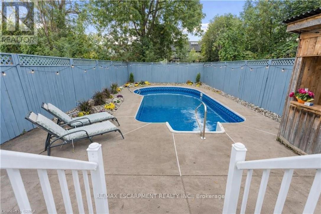 Your backyard summer starts here! Welcome to 80 Walnut Street, nestled in the charming and peaceful neighbourhood of Old West Brant-featuring a large in-ground swimming pool that transforms this property into your own exclusive retreat. This beautifully updated bungalow offers 3 bedrooms and 2 bathrooms one offering you ensuite privileges along with numerous improvements throughout the home, including updated electrical and plumbing, furnace (2012), windows, and roof. At the heart of the home is the stunning renovated kitchen, designed to blend style with everyday functionality. Rich espresso cabinetry provides generous storage and is complemented by sleek modern hardware and a stylish tile backsplash. Stainless steel appliances add a contemporary touch, while the spacious centre island with breakfast bar seating offers the perfect place for casual dining, meal prep, or entertaining guests. Durable stone countertops and modern lighting complete this beautifully designed space, creating a warm and inviting hub for the home.Step outside and discover the true highlight of the property: a fully landscaped backyard designed for relaxation and entertaining. A large deck overlooks the sparkling in-ground pool, complemented by a fun tiki bar and plenty of space to host summer gatherings with family and friends. The pool area has also seen significant upgrades with a new liner, heater, and pump installed in 2021, giving you peace of mind for years to come.Located just minutes from parks, scenic trails, great schools, grocery stores, and everyday amenities, this home offers the perfect blend of lifestyle and convenience. (id:64974)