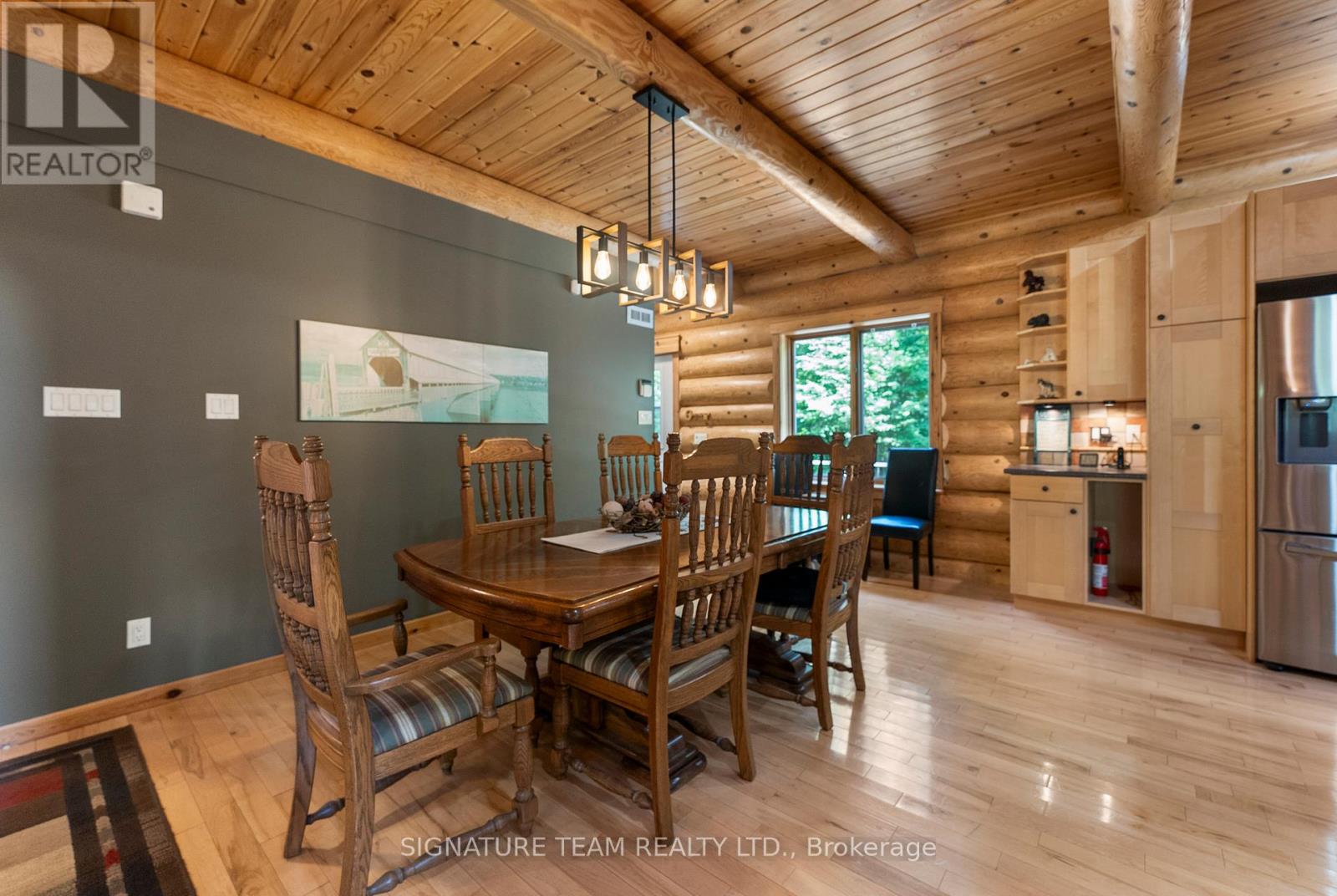 Set amidst 14.95 acres of mixed hardwood forest minutes from Pembroke, this extraordinary custom built log home offers a rare blend of artisanal craftsmanship and refined rural living. Designed with timeless attention to detail, this home is a true testament to natural beauty and enduring quality. The heart of the home is an expansive open-concept kitchen and dining area, thoughtfully laid out. Adjacent, the great room is anchored by a floor-to-ceiling stone fireplace and framed by dramatic 25-foot pine tongue-and-groove cathedral ceilings, creating a sense of warmth and scale rarely found. You'll find 2-beds, a 4-piece bath and screened in porch off the kitchen. Maple hardwood floors flow seamlessly throughout the main level, while handcrafted log railings and a custom staircase add authenticity and rustic elegance. The 2nd level opens to a spacious loft overlooking the great room below. Additionally, the large primary features 11-foot ceilings, bamboo flooring, a walk-in closet, and ensuite bathroom. Full basement is partially finished with its own entrance, a large rec room, a bedroom, 3-piece bath and a wood elevator. Outdoor living is equally impressive, with a large deck complete with built-in bench seating and a screened 3-season porch that invites you to relax. The detached 30' x 40' garage offers versatility, boasting 14-foot ceilings, 200 amp service, a 12' x 12' room with A/C, a bar area, insulated with radiant in-floor heat, and hot/cold water. In addition to the garage, there is also a gazebo area, lean-to, outbuilding for storage and a 3-season bunkie with a cookstove and kitchenette. Modern updates include a LG stove, dishwasher, washer, dryer, water treatment system, pressure tank, and roof was replaced in 2023. For those seeking a lifestyle in harmony with nature and elegance, this is a rare opportunity to experience the best of country living in a setting of charm, comfort, and craftsmanship. Min 24 hr irrevocable. (id:64974)