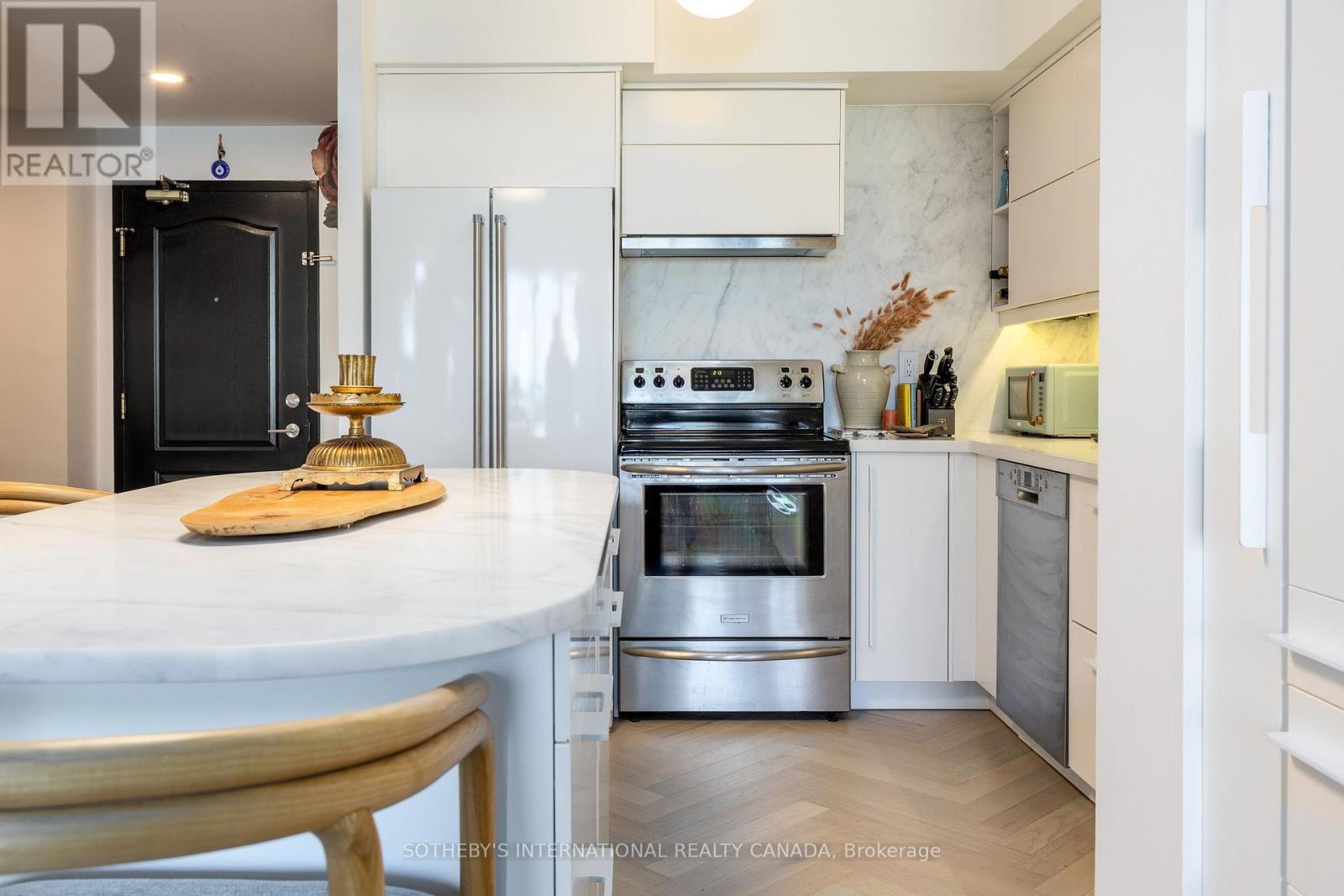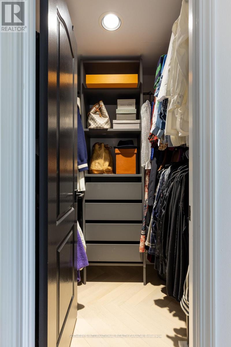 Designer-owned luxury suite! Beautifully renovated (2022) with high end finishes, featuring herringbone hardwood floors through-out, an open concept living/ dining space, and kitchen with marble countertop island. Partial views into the Rosedale Valley, and lovely lighting throughout the day. Entry den leads to a bright open-concept living/dining + kitchen space, perfect for day to day living, and entertaining.High ceilings with plenty of storage including full height pantry. Extra ceiling light fixture at living room / dining room - uncommon to most units. Spacious primary bedroom with walk in closet, full length mirrors, and spa-inspired ensuite and linen cabinet/ makeup station.Second bedroom space ideal as an office or guest room, with walk-in closet, and walk out to balcony. **The 2nd bedroom is currently configured as office, but will be converted to a bedroom before closing**. EXTRA'S: In-suite laundry, individually controlled heat & A/C. Walk out balcony. Includes 1 underground parking space. Corner spot /unobstructed side. Hydro, internet not included.Landlord prefers no pets.24/7 concierge.Good sized private gym/ booked privately by each tenant. BBQ at communal patio + party room avail. to book for your functions. Paid bike storage rack available. Everything you need is at your doorstep in this quaint and quiet,boutique building with TTC, Bloor St. shops, all amenities, coffee shops and the very best restaurants Toronto has to offer...only steps away! This is the place you will be proud to call home! Second bedroom doors to be installed at tenants request. (id:64974)
