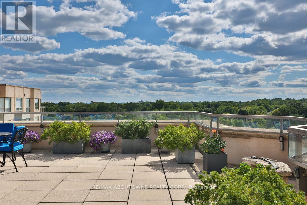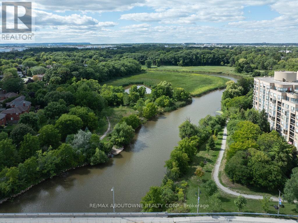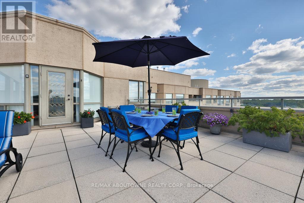 Welcome to Bronte Harbour Club. An exceptionally sought-after waterfront residence ideally located in the heart of Bronte Village, this beautifully updated 2-bedroom, 2-bathroom Penthouse Suite offers approx 1,545 sq. ft. of elegant living space with seamless indoor-outdoor flow. If features an expansive 31 ft x 39 ft private terrace, and additional balcony. Thoughtfully upgraded throughout, the suite features hardwood flooring in the LR, DR, and Bedrooms, crown moulding, newly installed pot lights, a new up-to-code electrical panel, and two HVAC systems. HVAC system serving the main living areas & primary bedroom has been completely updated. The upgraded kitchen is both stylish and functional w/quartz countertops, stainless steel appliances, pull-out drawers, pantry, enhanced cabinetry storage, and a breakfast nook overlooking the terrace. Both bedrooms are enhanced with California Closet organizers, with the second bedroom offering custom built-in office ideal for work-from-home living. The primary retreat features a custom wall unit, walk-in closet, and additional his-and-hers closets w/ mirrored sliding doors. The updated bathrooms include quartz countertops, elevated toilets, a glass-enclosed shower in the main bath, and a spa-like four-piece primary ensuite with soaker tub, separate shower, and upper cabinetry. A well-appointed laundry room offers newer appliances, laundry tub, counterspace, and cabinetry. Electric fireplaces in the living room and primary bedroom add warmth and ambiance to the living space. The suite overlooks lush greenspace, conservation area, and Bronte Creek offering a tranquil atmosphere that feels world away from the City. Located steps to the marina, waterfront trails, shops, and dining, this RARE residence offers a sophisticated lakeside lifestyle in one of Oakville's mostdesirable communities. (id:64974)