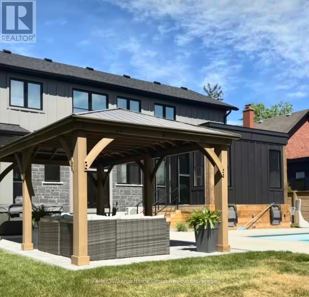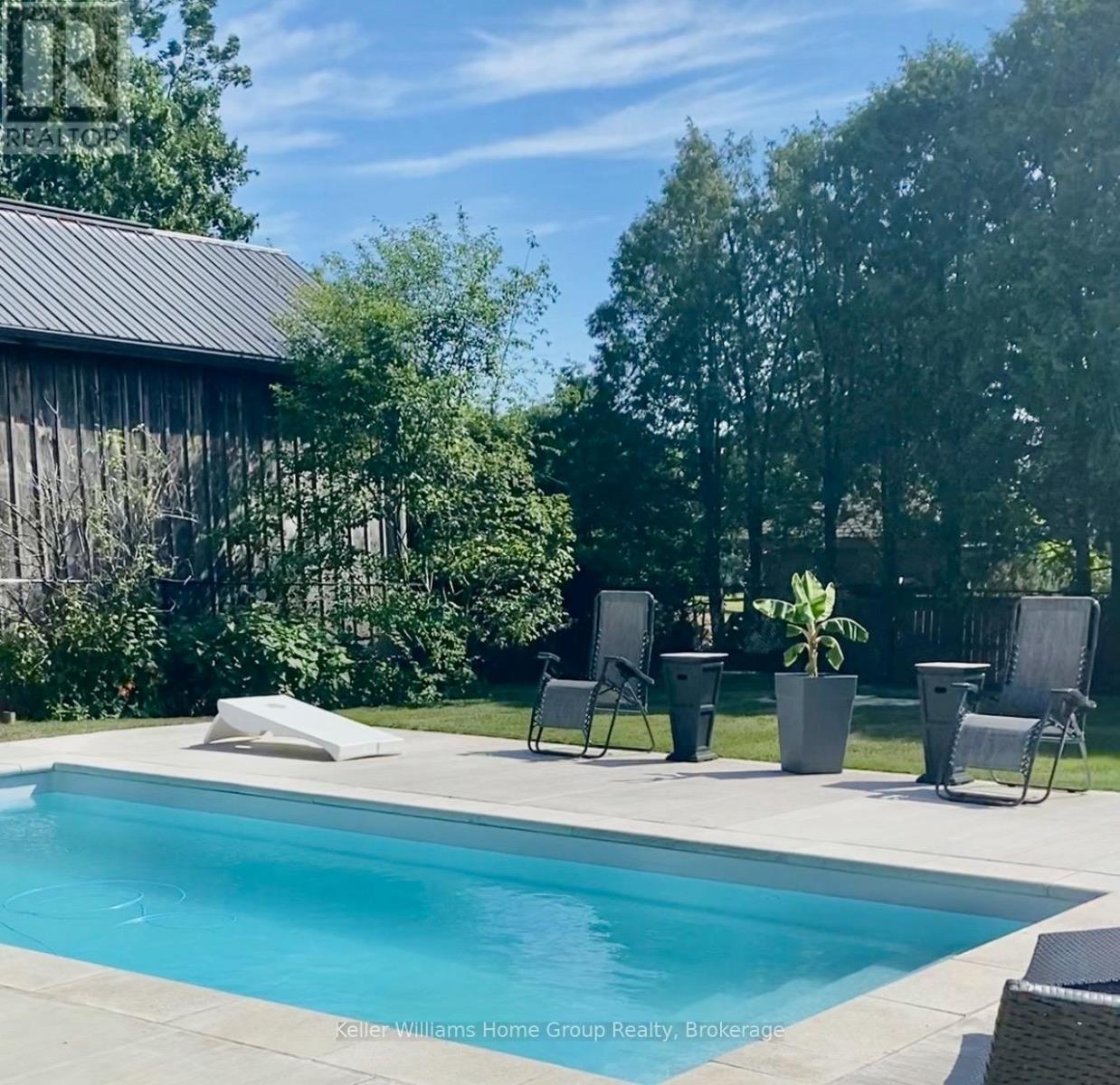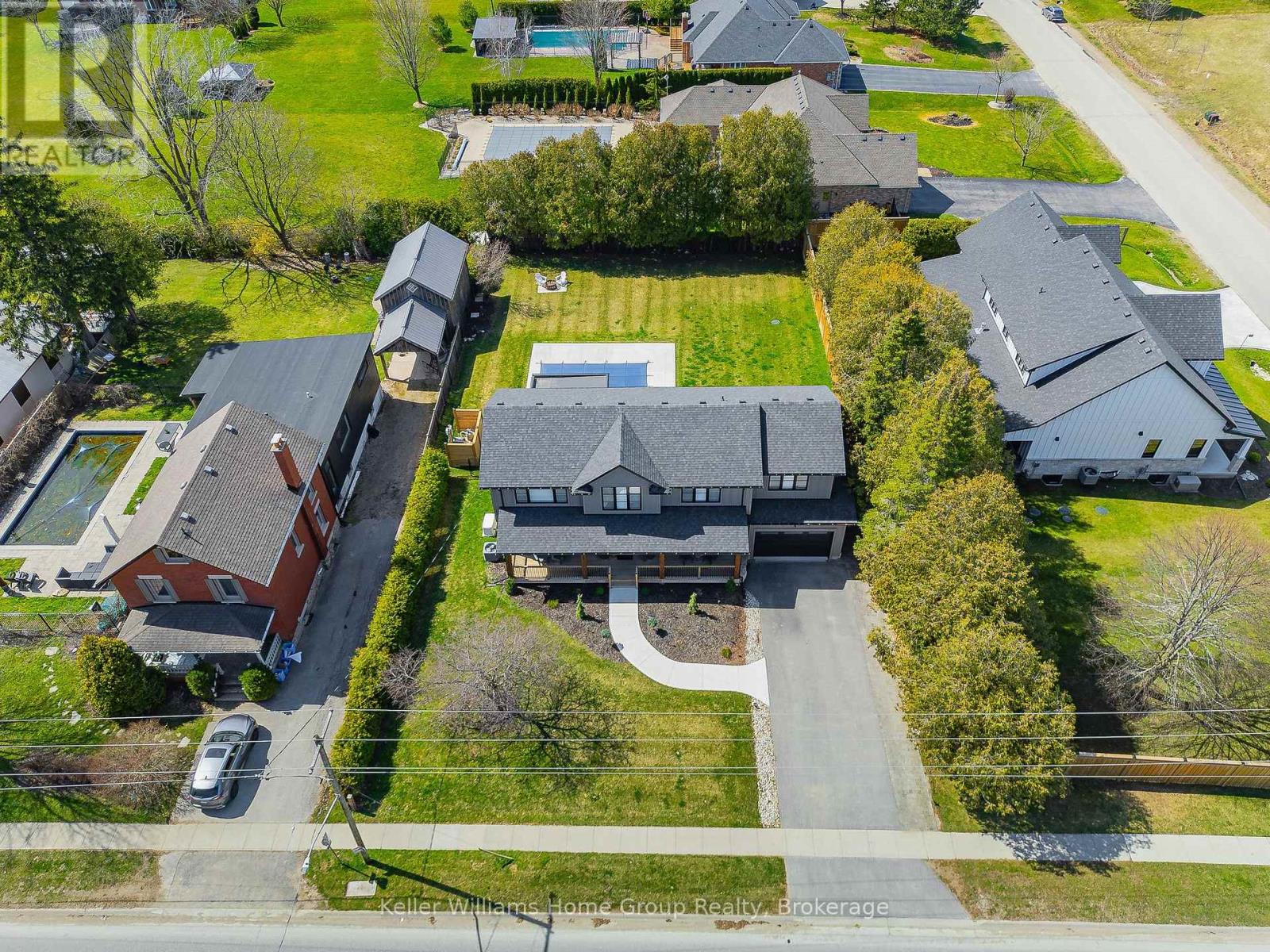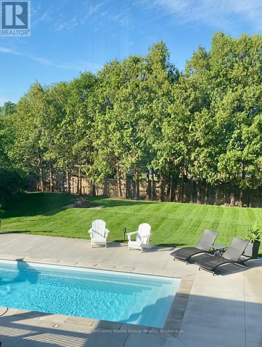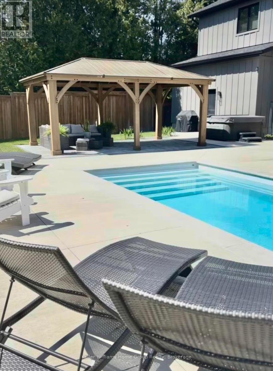 Rare Arkell opportunity offering luxury country living with city convenience - homes in this sought after community rarely come available. Set on a large private lot with a resort-style backyard, this four year old custom home delivers refined modern living designed for both entertaining and everyday comfort. Enjoy summer days by the sparkling saltwater pool, unwind beneath the elegant pergola and appreciate manicured landscaping with in ground sprinkler system, your own private outdoor retreat. Inside, open concept living unfolds beautifully. Just off the gourmet kitchen is a stunning, light filled family room, a true showpiece of this home, featuring a sleek linear fireplace with custom wood mantel, statement lighting and walls of windows that create an almost sunroom like atmosphere. Flooded with natural light and overlooking the backyard, this inviting space is perfect for morning coffee, family gatherings or cozy evenings by the fire. The chef's kitchen impresses with quartz countertops, premium appliances, sleek cabinetry and an oversized island with breakfast bar seating, thoughtfully designed for hosting and daily living. A dramatic staircase becomes an architectural focal point, highlighted by a skylight above and striking staked windows that fill the home with natural light and create an airy, elevated feel from the moment you enter. Upstairs, the primary suite offers a serene retreat with spa inspired ensuite including soaking tub, walk-in glass shower, and double vanity. Three additional bedrooms and a beautifully finished main bath private exceptional comfort for family and guests. The fully finished basement expands your living pace with an additional family area, two bedrooms and a full bathroom, ideal for guests teens or a home office. Located minutes to shopping, schools and parks this rare Arkell property delivers modern luxury, seamless indoor-outdoor living and the peace of country living with city access. (id:64974)