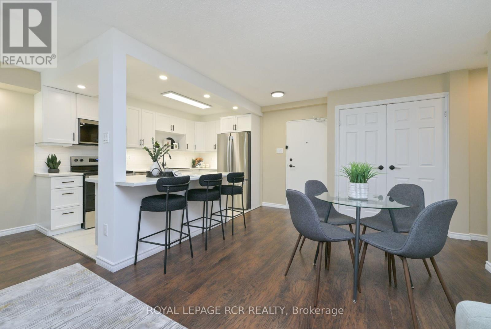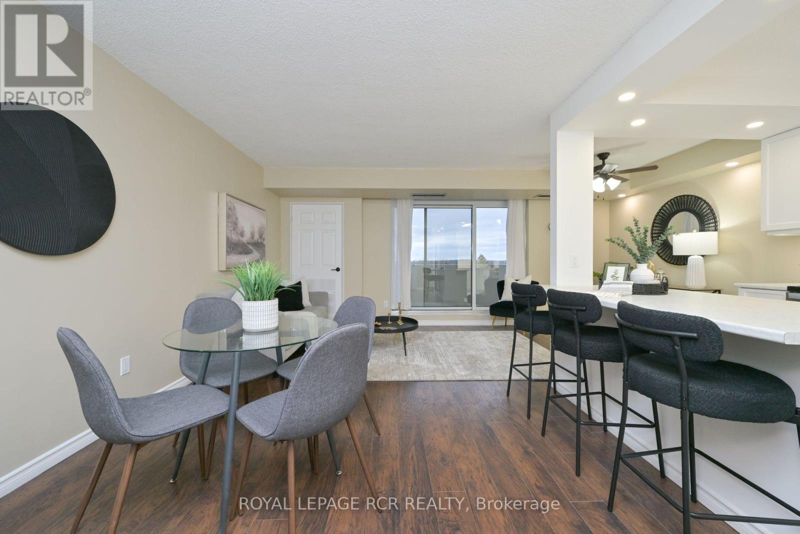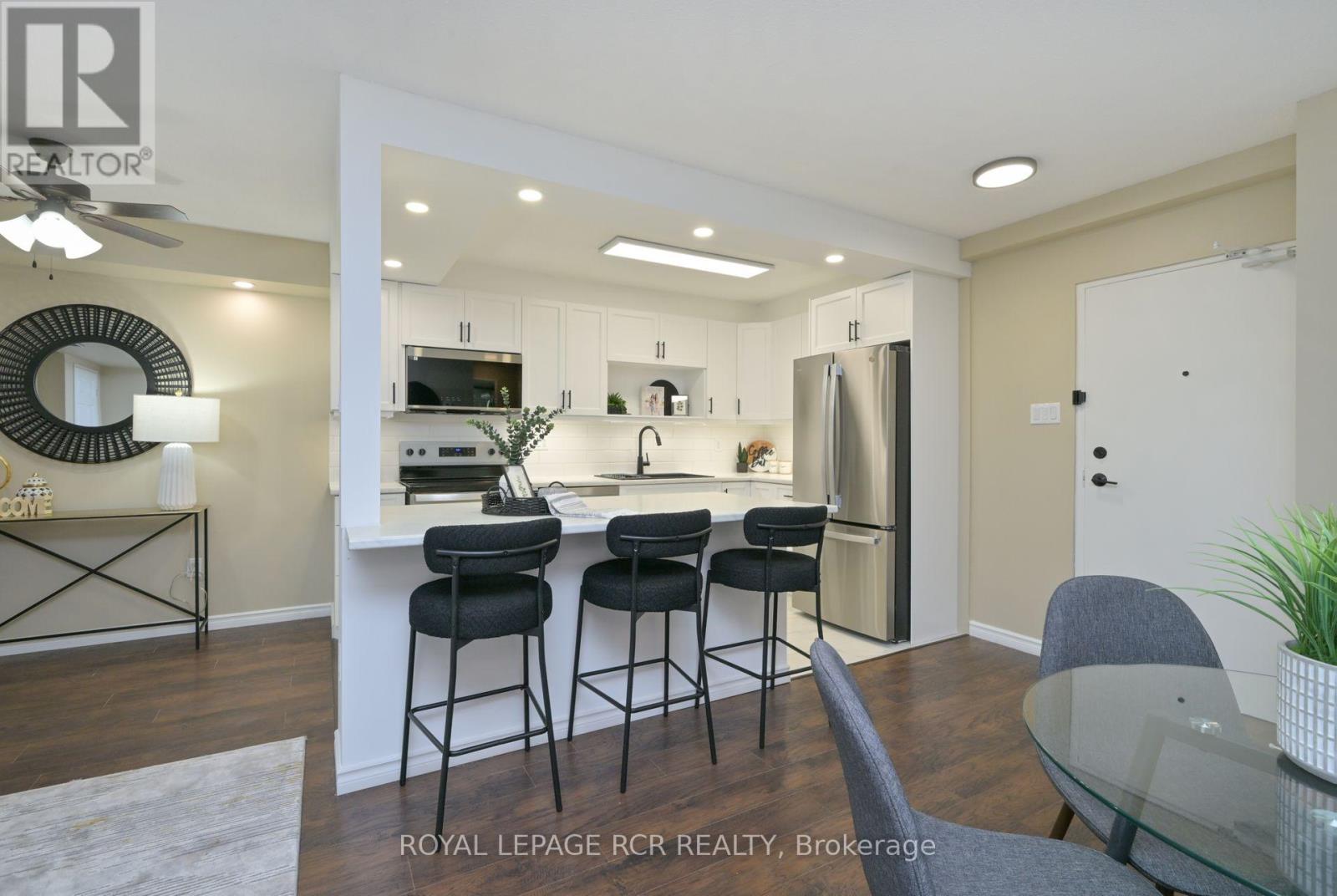 Discover a rare opportunity to own a fully renovated, move-in-ready condominium in one of Orangeville's most established and sought-after buildings...the Bromount. Perched on the 8th floor of The Bromount, this exceptional residence blends contemporary elegance with everyday comfort, offering breathtaking sunrise views, thoughtful upgrades throughout, and an unbeatable downtown location. Situated just steps from vibrant Broadway offering boutique shopping, fine dining, cozy cafes, all within steps from your front door. One of the home's most captivating features awaits the moment you step inside: a spectacular east-facing vista that captures both the character of historic downtown Orangeville and the tranquil beauty of Island Lake Conservation Area. Every inch of this condominium has been meticulously and stylishly updated. The brand-new kitchen serves as the centrepiece of the home with subway tile backsplash, sleek undermount lighting, stainless steel appliances, and a centre island adding valuable storage, prep space, and casual dining options. The open-concept layout flows directly into the dining and living areas, walkout to covered porch...perfect for entertaining. The upgrades continue! A beautifully redesigned bathroom, with walk-in shower with contemporary tile, a heated mirror that ensures clarity at all times, and a sophisticated vanity topped with quartz counters. Spacious primary bedroom boasting double closets that provide excellent storage. You'll also enjoy, new flooring, updated light fixtures and pot lights, stylish hardware, new interior doors, underground parking space (a true luxury during winter months), and dedicated storage locker. Residents of The Bromount appreciate the building's secure entry, friendly community atmosphere, and its reputation for being well-maintained. Welcome to your next chapter at The Bromount and welcome home. (id:64974)