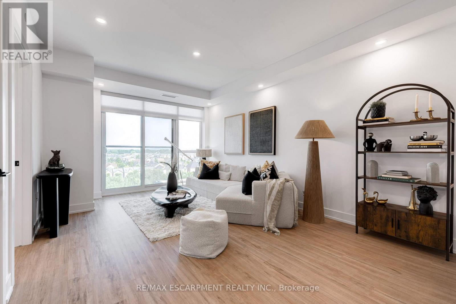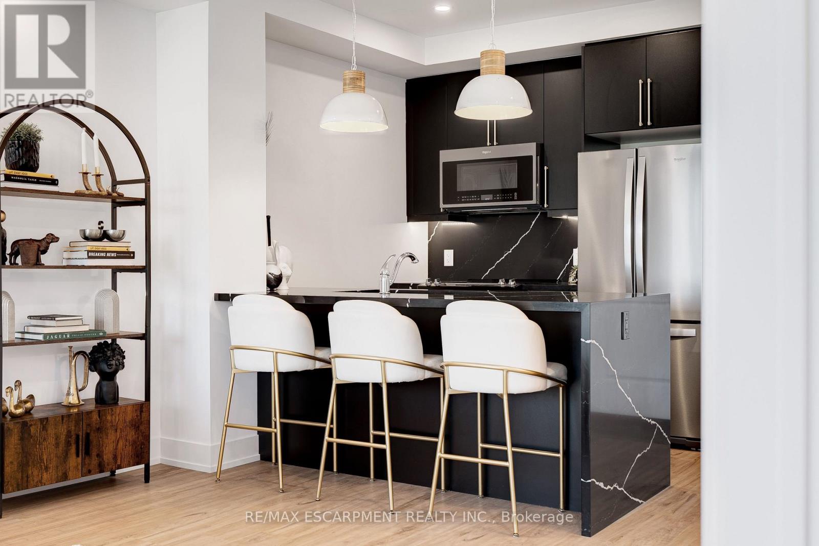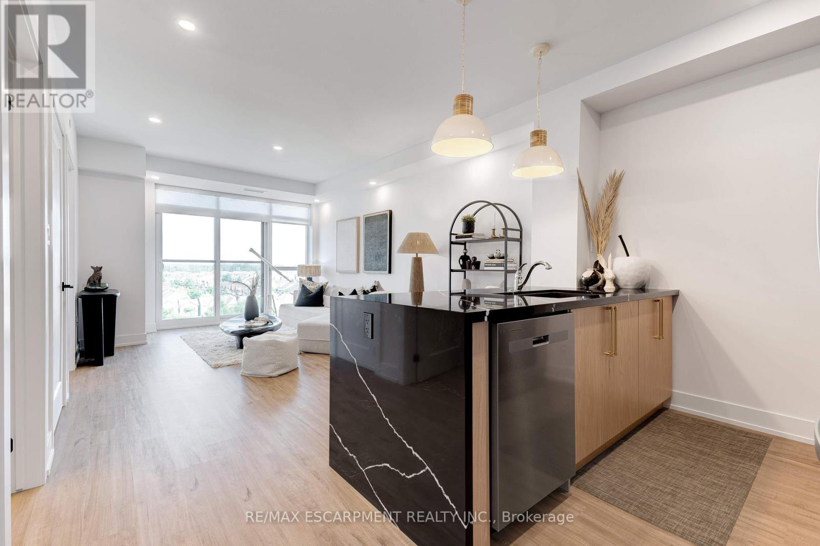 Welcome to Trend 3 Condos in the heart of Waterdown! This stunning 587 sq ft, 1-bedroom designer suite is perched on the 8th floor and is loaded with over $60,000 in premium upgrades. A true designer dream, this condo blends modern luxury with thoughtful details throughout. The open-concept layout showcases a fully upgraded kitchen, stainless steel appliances, pot lights throughout, and stylish flooring with no carpet. The spa-inspired bathroom features a sleek walk-in shower, creating a hotel-level experience at home. The generous bedroom offers comfort and privacy, while the rare Juliette balcony allows fresh air and an effortless inside-out breeze, filling the space with natural light and an airy feel. Convenience meets luxury with in-suite laundry, one parking space, and a private locker. Residents of Trend Condos enjoy exceptional amenities including a rooftop terrace with panoramic views, fitness centre, party room, bike storage, and visitor parking. Located minutes from major highways and just a 10-minute drive to Aldershot GO, this prime location also places you steps from scenic trails, parks, restaurants, and everything Waterdown has to offer. (id:64974)