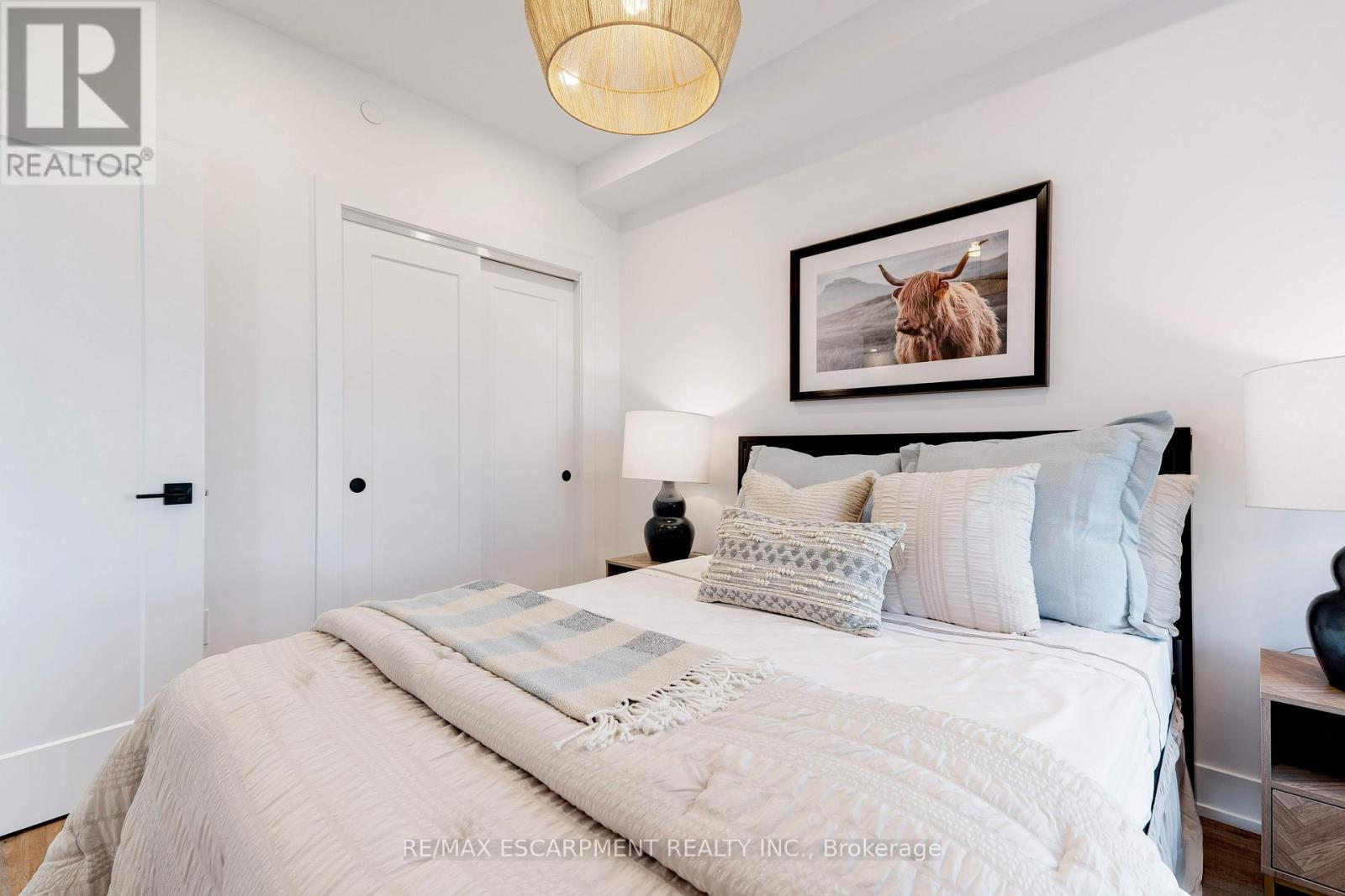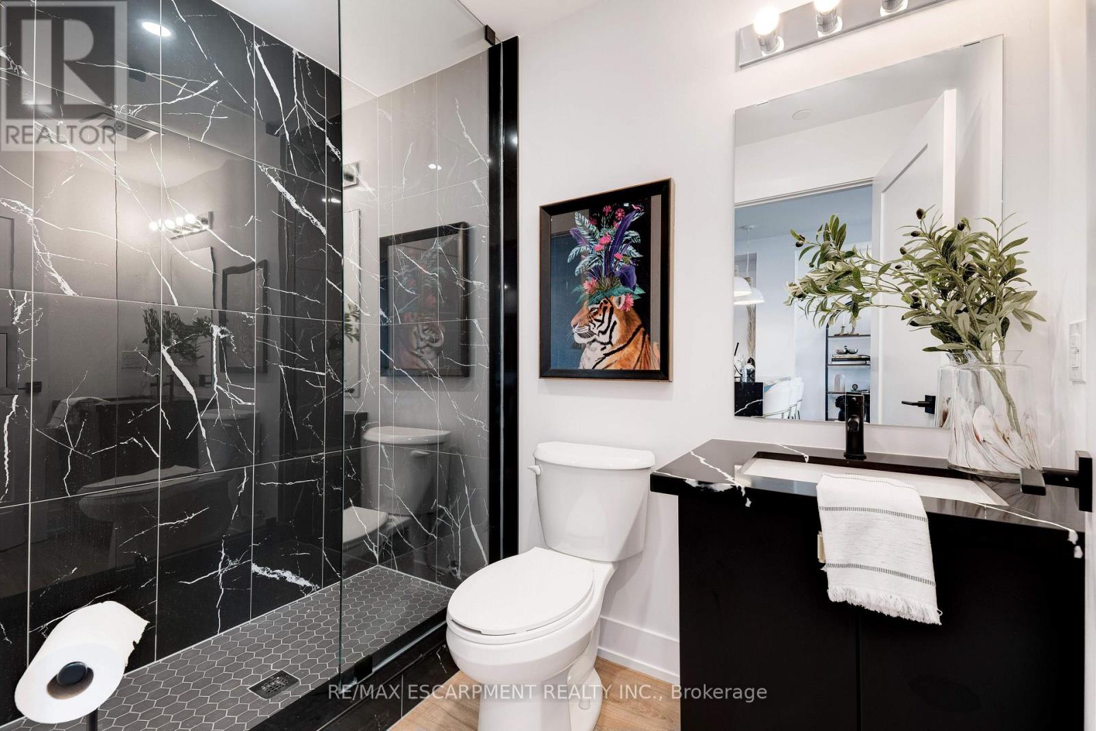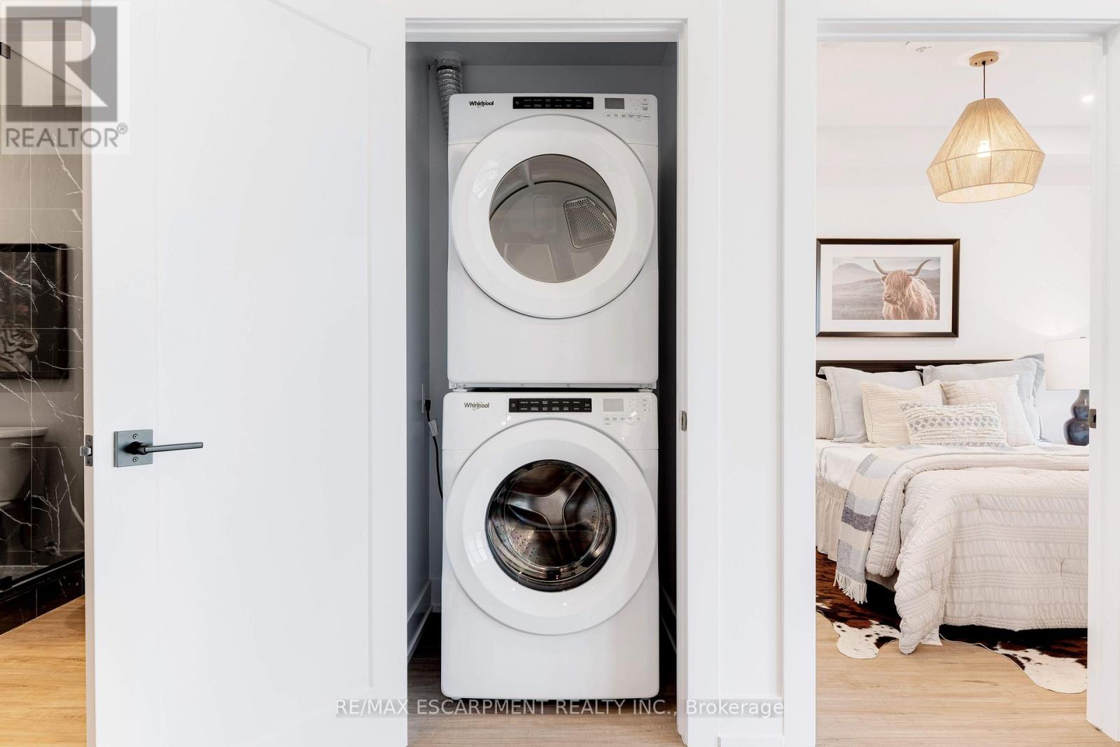 Welcome to Trend 3 Condos in the heart of Waterdown! This stunning 587 sq ft, 1-bedroom designer suite is perched on the 8th floor and is loaded with over $60,000 in premium upgrades. A true designer dream, this condo blends modern luxury with thoughtful details throughout. The open-concept layout showcases a fully upgraded kitchen, stainless steel appliances, pot lights throughout, and stylish flooring with no carpet. The spa-inspired bathroom features a sleek walk-in shower, creating a hotel-level experience at home. The generous bedroom offers comfort and privacy, while the rare Juliette balcony allows fresh air and an effortless inside-out breeze, filling the space with natural light and an airy feel. Convenience meets luxury with in-suite laundry, one parking space, and a private locker. Residents of Trend Condos enjoy exceptional amenities including a rooftop terrace with panoramic views, fitness centre, party room, bike storage, and visitor parking. Located minutes from major highways and just a 10-minute drive to Aldershot GO, this prime location also places you steps from scenic trails, parks, restaurants, and everything Waterdown has to offer. (id:64974)