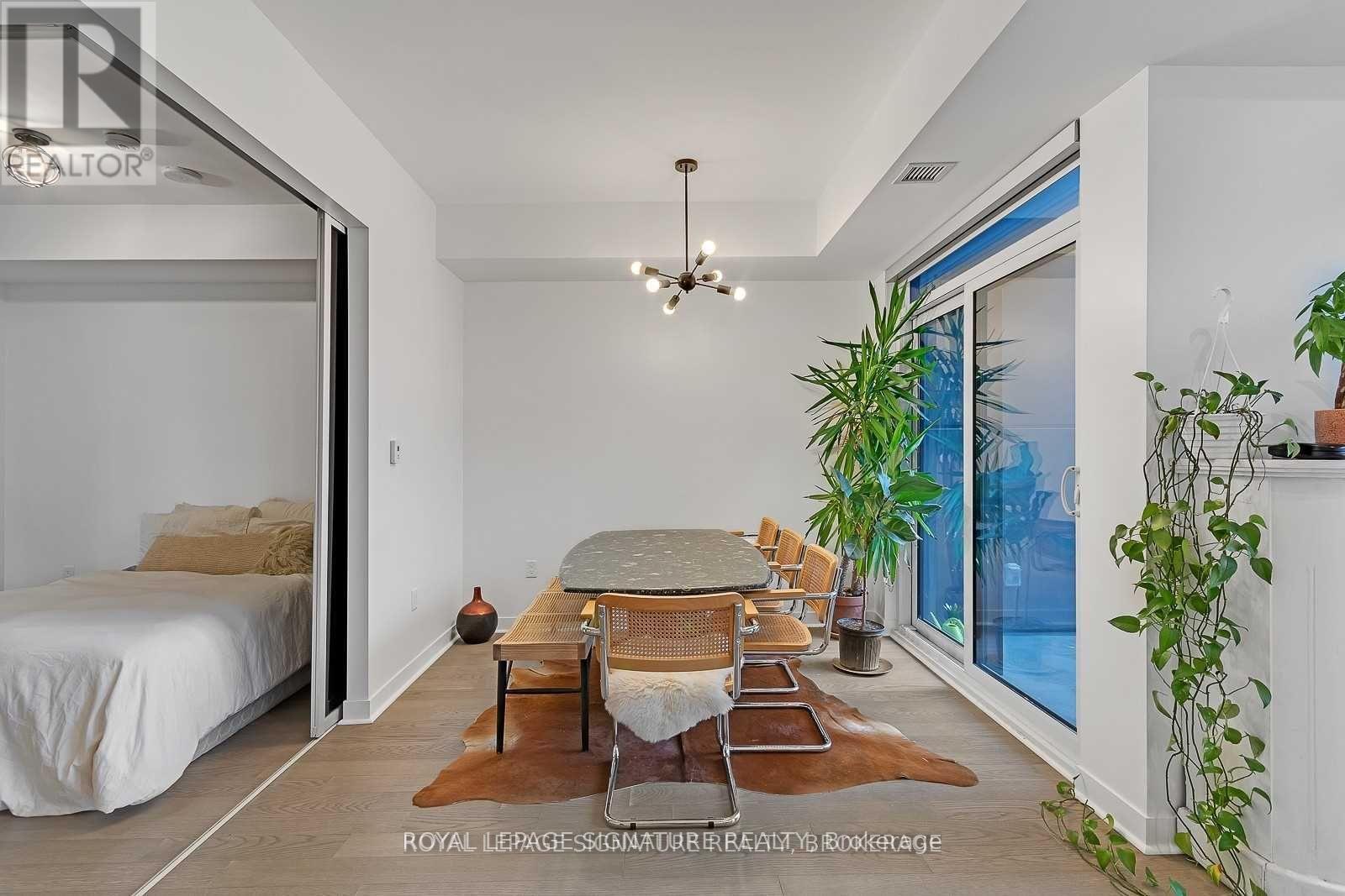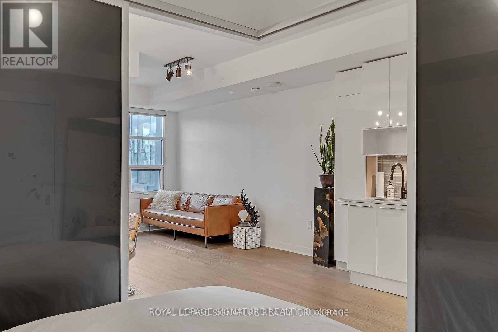 Experience the best of King West living at the highly coveted Kingly Condos at King & Portland. This exceptional 1-bedroom suite offers incredible value with thoughtful upgrades and a spacious open-concept layout designed for modern city living.The suite features expansive New York-style warehouse windows, 9-ft smooth ceilings, and wide plank flooring throughout, creating a bright and stylish atmosphere. The custom Scavolini kitchen is a standout, complete with full-sized integrated/panelled stainless steel appliances, natural stone counters, subway tile backsplash, and an additional custom pantry for extra storage.The lengthy open-concept living and dining area is perfect for entertaining, enhanced by floor-to-ceiling windows that bring in abundant natural light and offer versatile layout options. The primary bedroom is smartly enclosed with frosted glass sliding doors and features a double closet. Relax in the spa-inspired 4-piece bathroom finished with modern tile, a stone vanity, mirrored medicine cabinet, extra shelving, and a luxury 2-in-1 shower/tub. Step out onto your private balcony to enjoy sensational sunrise views, and take advantage of the included locker for added convenience.Residents enjoy state-of-the-art amenities, including a fitness centre and gym, rooftop deck, party and meeting rooms, and 24-hour concierge. Located just steps from Toronto's hottest restaurants, cafes, nightlife, and shopping, this is King West living at its finest. Live like royalty at The Kingly. (id:64974)