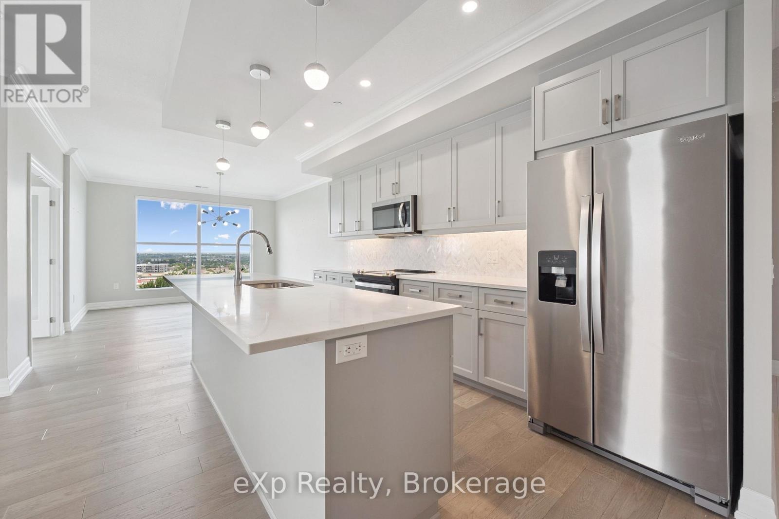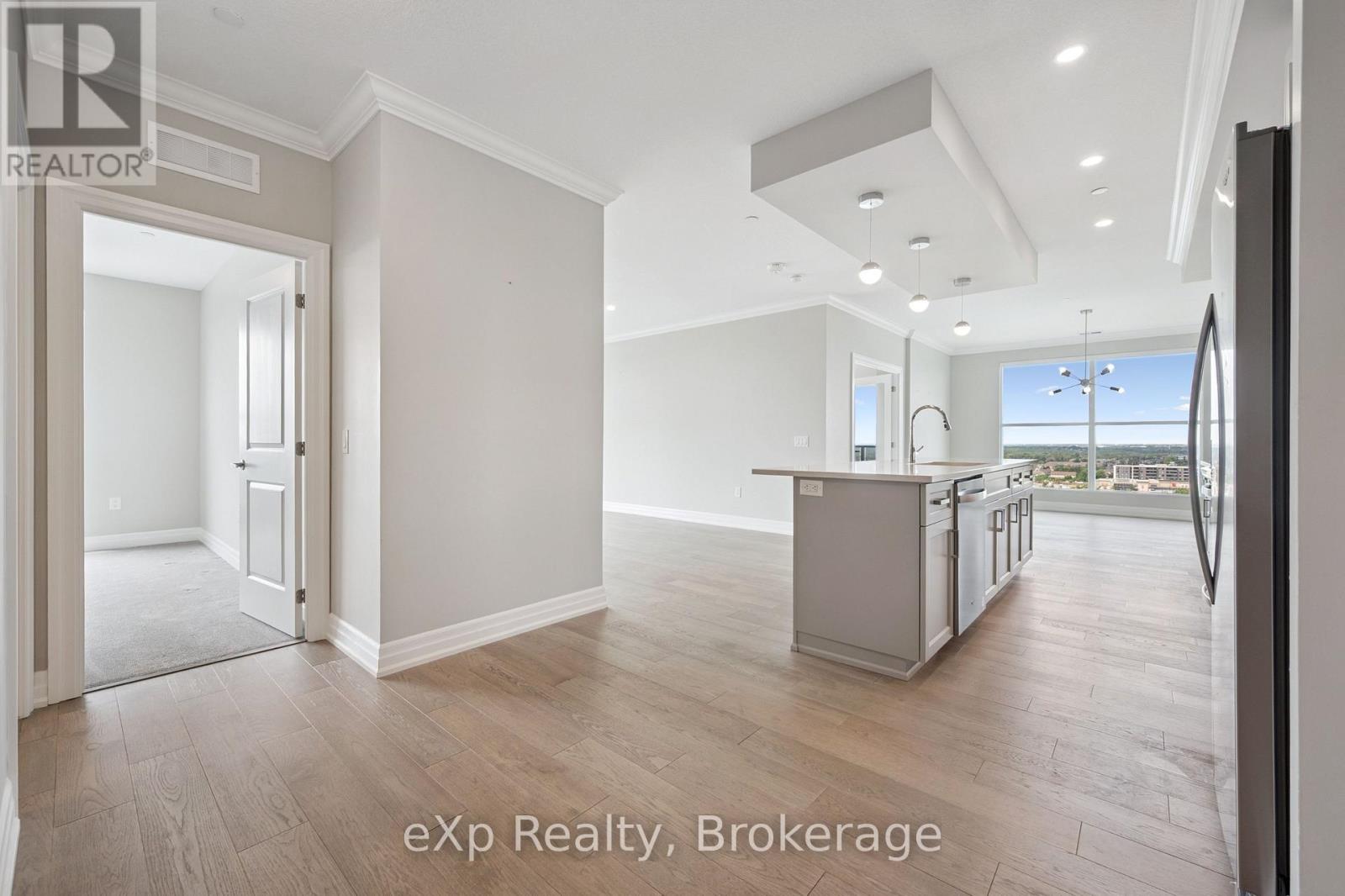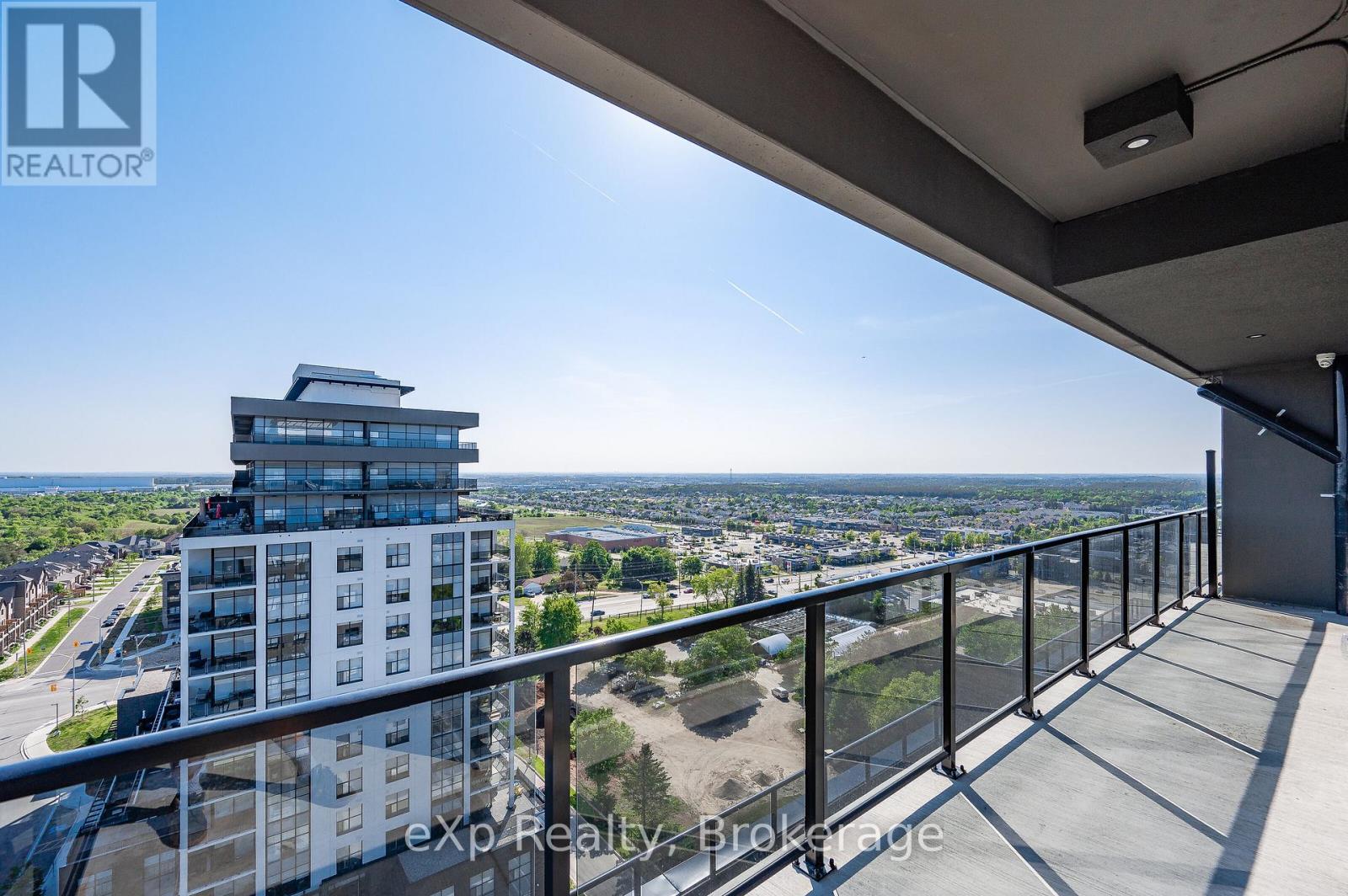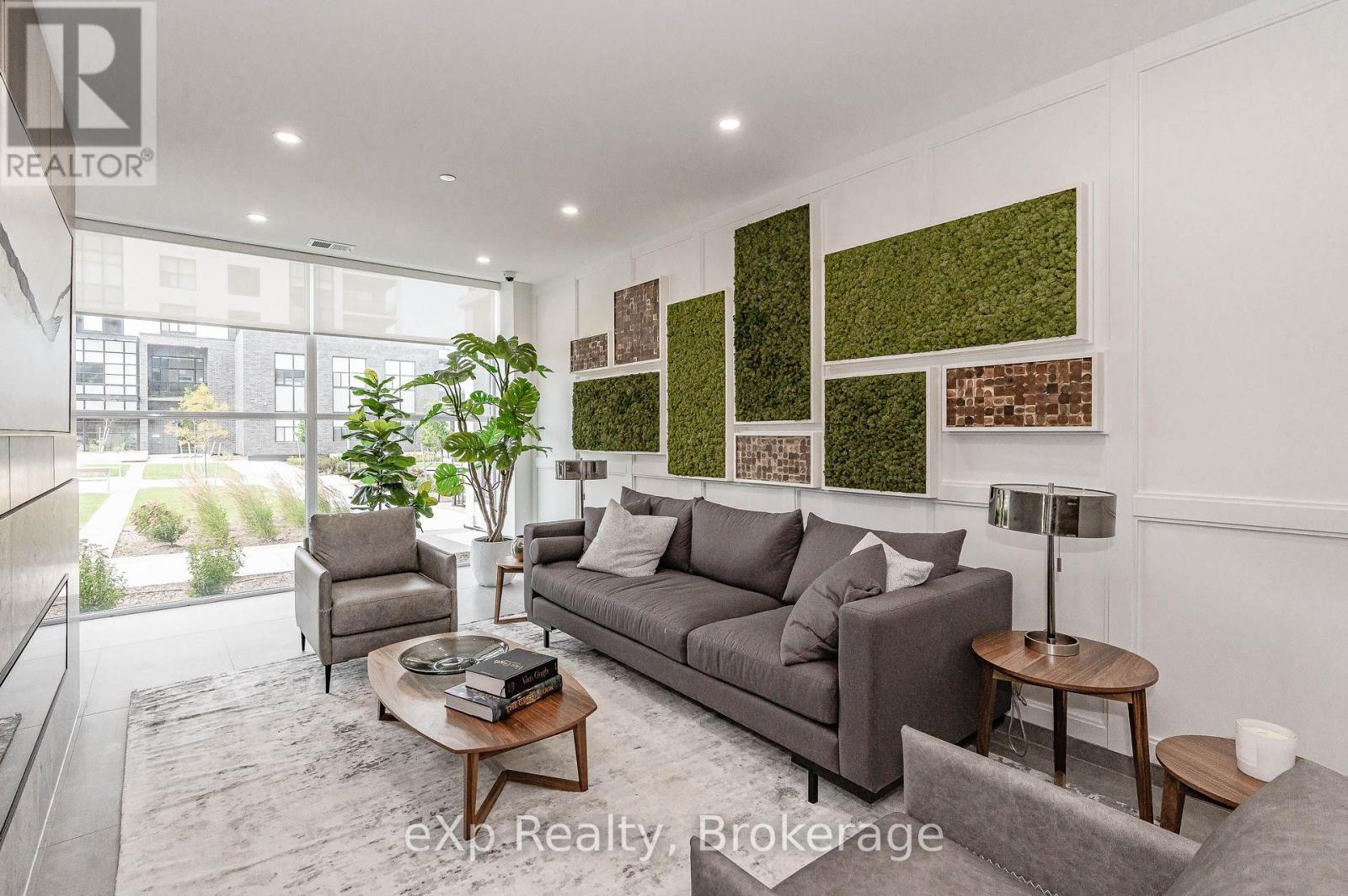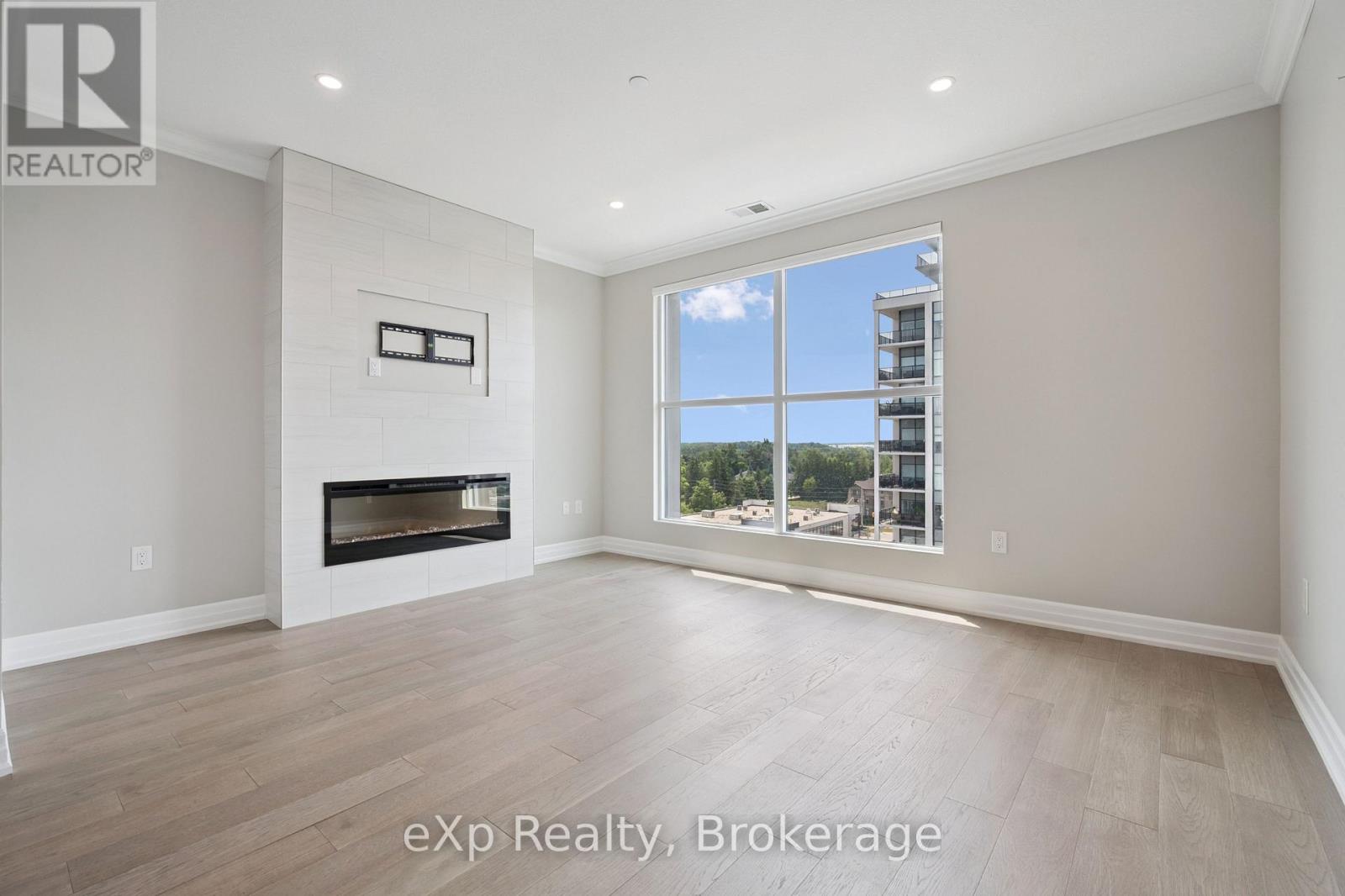 This expansive 1,650 square foot corner suite boasts one of the top layouts, featuring 2 bedrooms, 2 bathrooms, a spacious den, plus a 133 square foot wrap-around balcony. Built in 2022, this upscale suite blends functionality with high-end design, offering an open-concept floor plan, tall ceilings, abundant natural light, and BREATHTAKING NORTHWEST PANORAMIC VIEWS. The grand Primary easily accommodates a king-size bed and includes a large walk-in closet. The upgraded ensuite offers quartz counters, marble backsplash, heated floors and a glass walk-in shower. The open concept kitchen showcases a grand quartz island breakfast bar with stylish pendants, marble backsplash, stainless steel appliances, and ample storage space. Flowing seamlessly into the bright living and dining areas, you'll feel at home with an upgraded tiled fireplace, elegant cove detailing, and massive windows that create a warm, welcoming environment. The open den/sunroom is framed by upgraded glass French doors and window surround, providing an inspiring workspace or breakfast nook with stunning views. The second bedroom is generously sized, and the main 4-pc bathroom features quartz countertops and a tub. Additional highlights include a spacious in-suite laundry room, underground parking, and a large storage locker. Residents of this exclusive building enjoy premium amenities, including a modern gym, a luxurious Sky Lounge with a kitchen, a billiards room, an outdoor terrace, a golf simulation room with a bar, a fully equipped guest suite, and ample visitor parking. Enjoy a lifestyle of luxury, convenience, and sophistication, with easy access to the 401 and a wealth of dining, shopping, and entertainment options just steps away! With Tower 3 starting in the mid-900K price range, don't miss this rare opportunity. Need more than one parking spot? There are *ADDITIONAL UNDERGROUND PARKING SPOTS FOR SALE* through the builder! (id:64974)