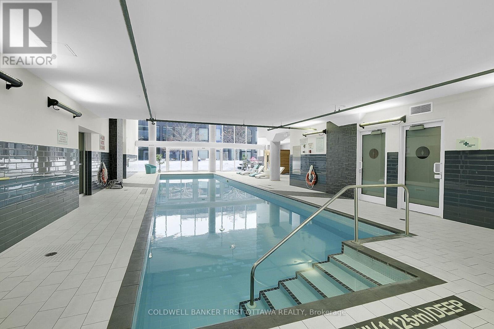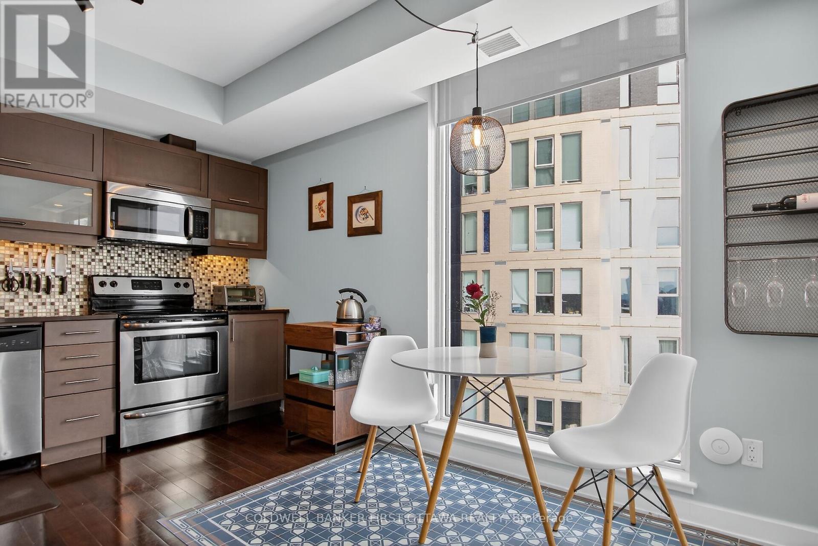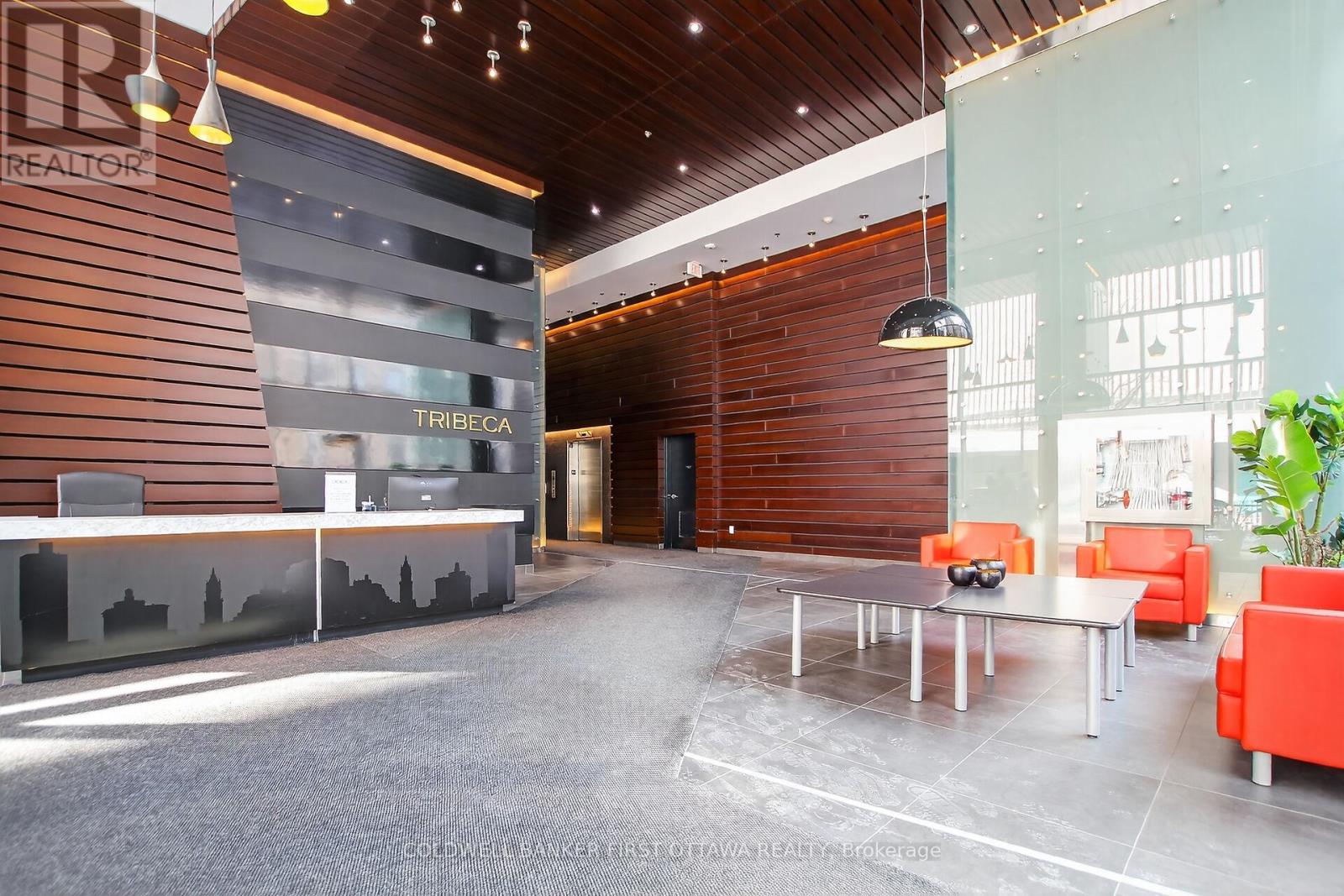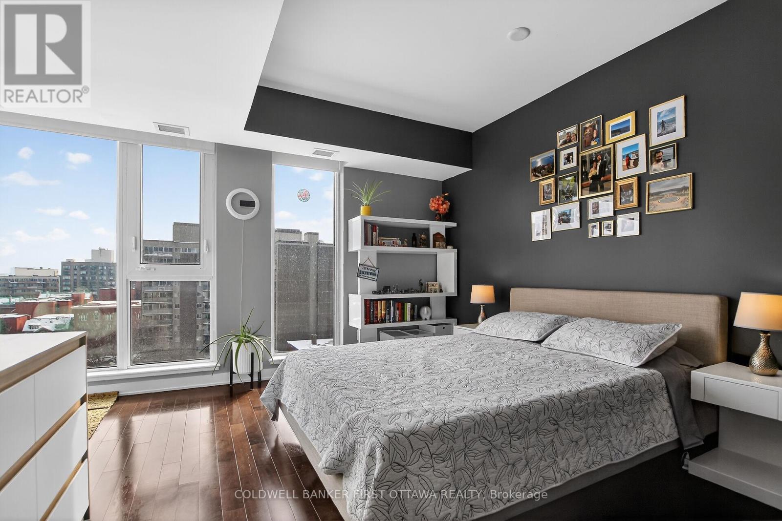 Bright (South exposure) corner 1 + den unit in the Tribeca condo building. Nicely located withing walking distance to Ottawa U, Parliament Hill, Rideau Centre with a convenient Farm Boy and coffee shop on the main level. This unit is open concept and has no carpets; all wall to wall espresso hardwood floors & Smart light switches. Quartz countertop in the kitchen and bath. The open den space has been modified with glass sliding doors to create storage space but can easily be opened up by removing the doors.The bigger 1 + den in this building offers approx. 805 square feet of living space. Heat and water are included in the condo fees. All appliances: Fridge, Stove, Microwave Hood-fan, Dishwasher, Washer & Dryer and custom blinds all included. No rental items. Includes underground parking and a storage locker. The ensuite laundry space off the foyer offers also some in-unit storage. Great condo amenities include: Gym, Indoor pool, Sauna, Guest Suites, visitor Parking in underground parking on Nepean Street, terrace with BBQ's (all these on 2nd floor) & roof top terrace. Available within 30 days of accepted agreement of purchase. (id:64974)