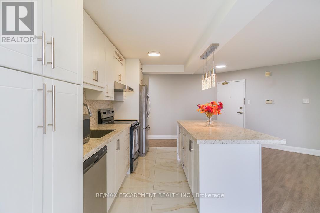 Welcome to Place IV, an upscale residence in the heart of Mississauga, just minutes from Square One Shopping Centre, The Valleys Recreation Centre, and every convenience you could need. Surrounded by lush parkland and scenic walkways, this location offers both urban accessibility and natural beauty. This beautifully renovated suite features a stunning open-concept kitchen designed to impress, complete with a massive centre island, custom cabinetry, stylish backsplash, and stainless steel appliances. The layout offers generous space for both dining and a home office setup, ideal for modern living. Elegant finishes such as crown mouldings and pot lights enhance the space. The expansive living room is perfect for relaxing or entertaining, highlighted by a built-in electric fireplace and custom cabinetry. Both bedrooms are generously sized, with the primary bedroom offering a built-in closet and a private 3-piece ensuite. Each bathroom has been fully renovated with quality finishes. Enjoy breathtaking city views along with beautifully maintained garden surroundings. This exceptional condo is perfect for discerning tenants seek (id:64974)