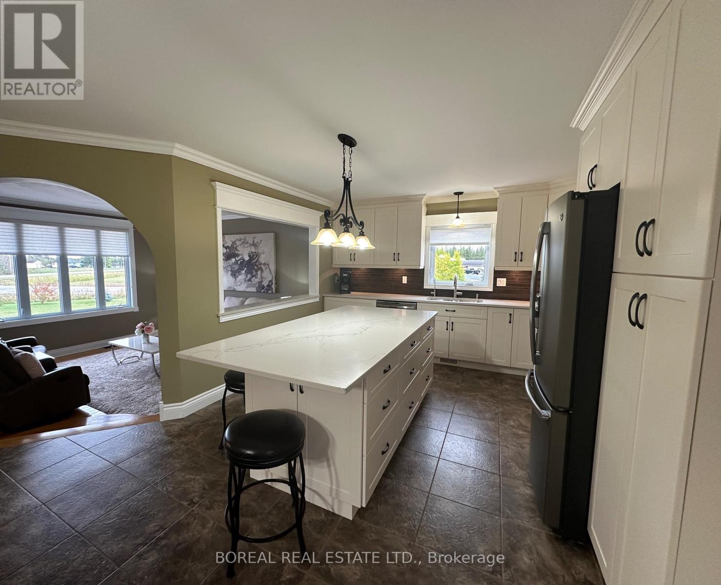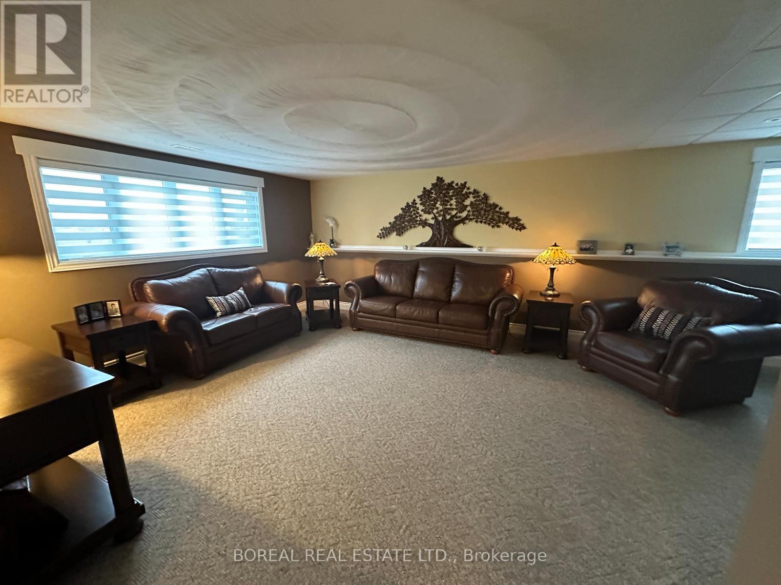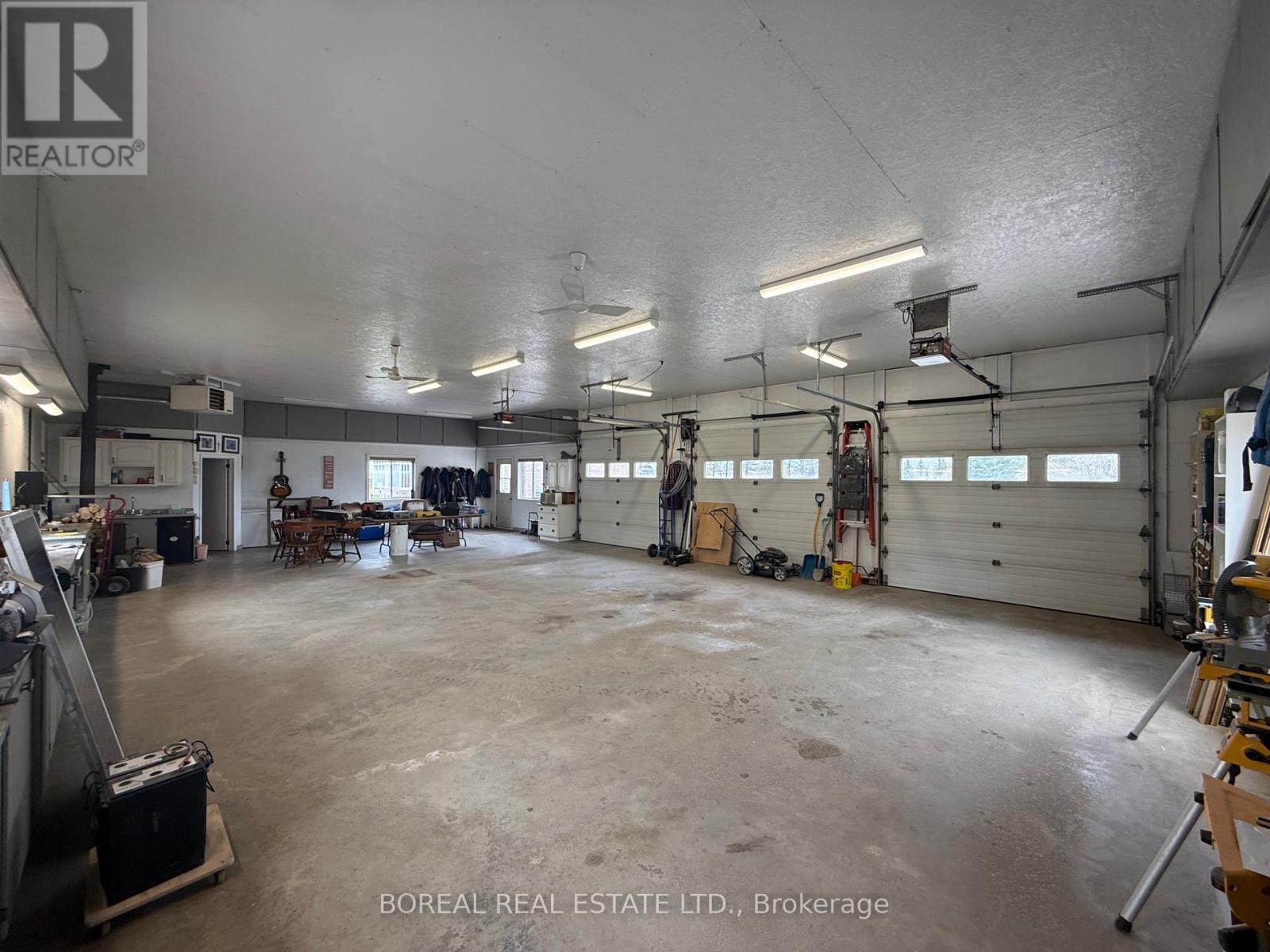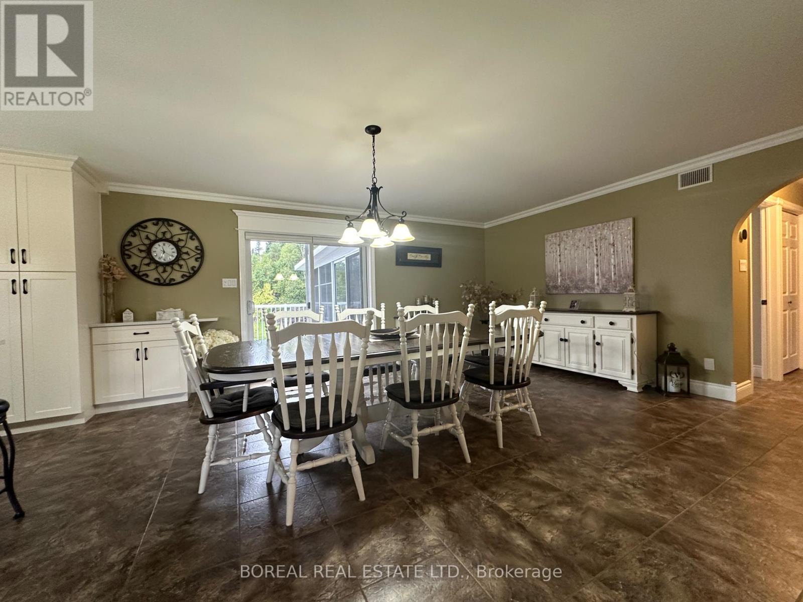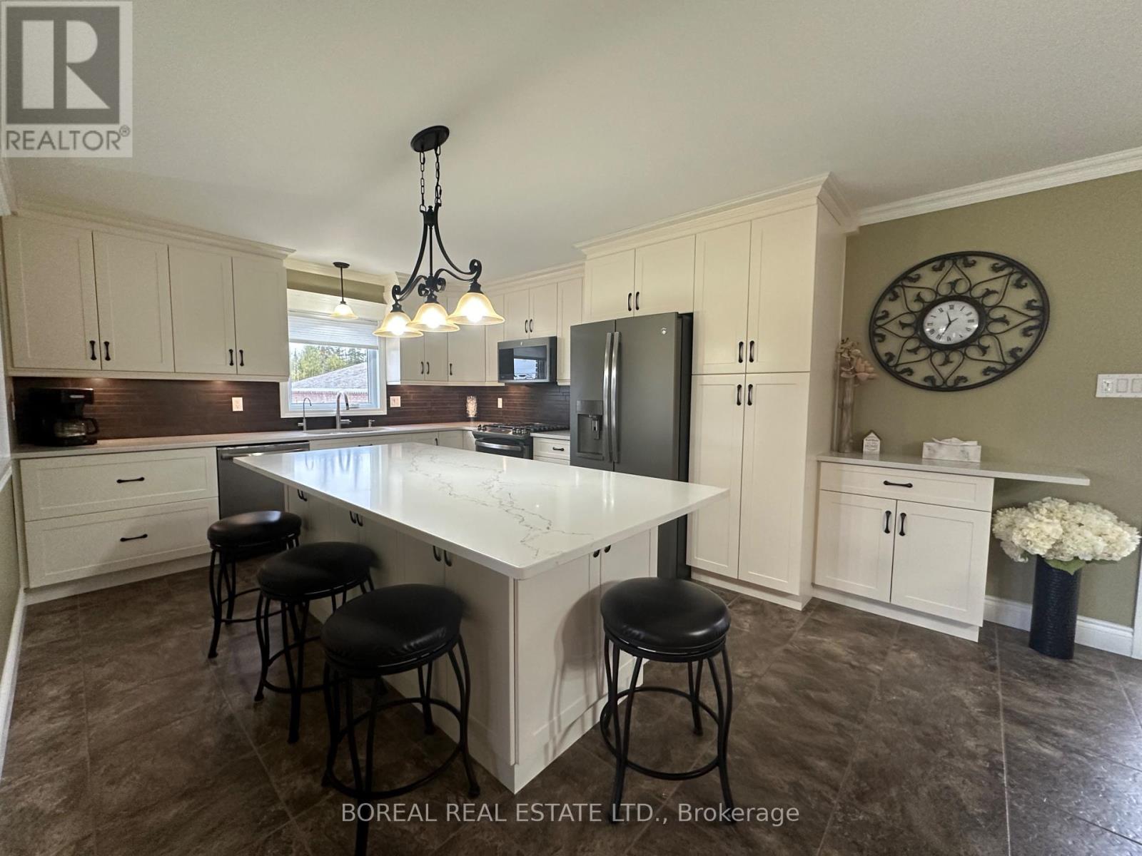 This fully bricked raised bungalow, built in 1990, offers approximately 1,400 sq.ft. of living space and sits on a beautiful 8.14-acre lot just 1.4 km from Tim Horton Events Centre. The main floor features a spacious entrance, three bedrooms, an updated 5-piece bathroom (2012), a sunken living room with crown moulding, and a bright open-concept kitchen renovated in 2018 with new cupboards, countertops, sink, taps, and appliances. The dining area leads to a rear deck and a three-season sunroom (installed 2017). The fully finished basement includes a large rec room with a natural gas fireplace (2006), two additional bedrooms, a second 4-piece bathroom, laundry room (updated in 2018), storage, and a utility room. A detached heated 3-bay garage (30x50, built in 1999) features a 2-piece bathroom, built-in cupboards, a natural gas heater (2003), wood stove (2017), and dehumidifier, with roof shingles replaced in 2019 and repainted cupboards/doors in 2020. A second cold storage garage (24x32) was added in 2018. Notable updates include a natural gas furnace (2005), hot water tank (2003), water softener and sulfur guard (2010), lockstone driveway and flower beds (2010), new shingles on the home (2012), upstairs windows and doors (2019), Aero seal ducts (2015), Generac generator (2017), replaced air exchanger (2023), and new basement windows (2024). The home has been meticulously maintained and updated, offering the perfect blend of space, functionality, and country charm just minutes from town amenities. (id:64974)