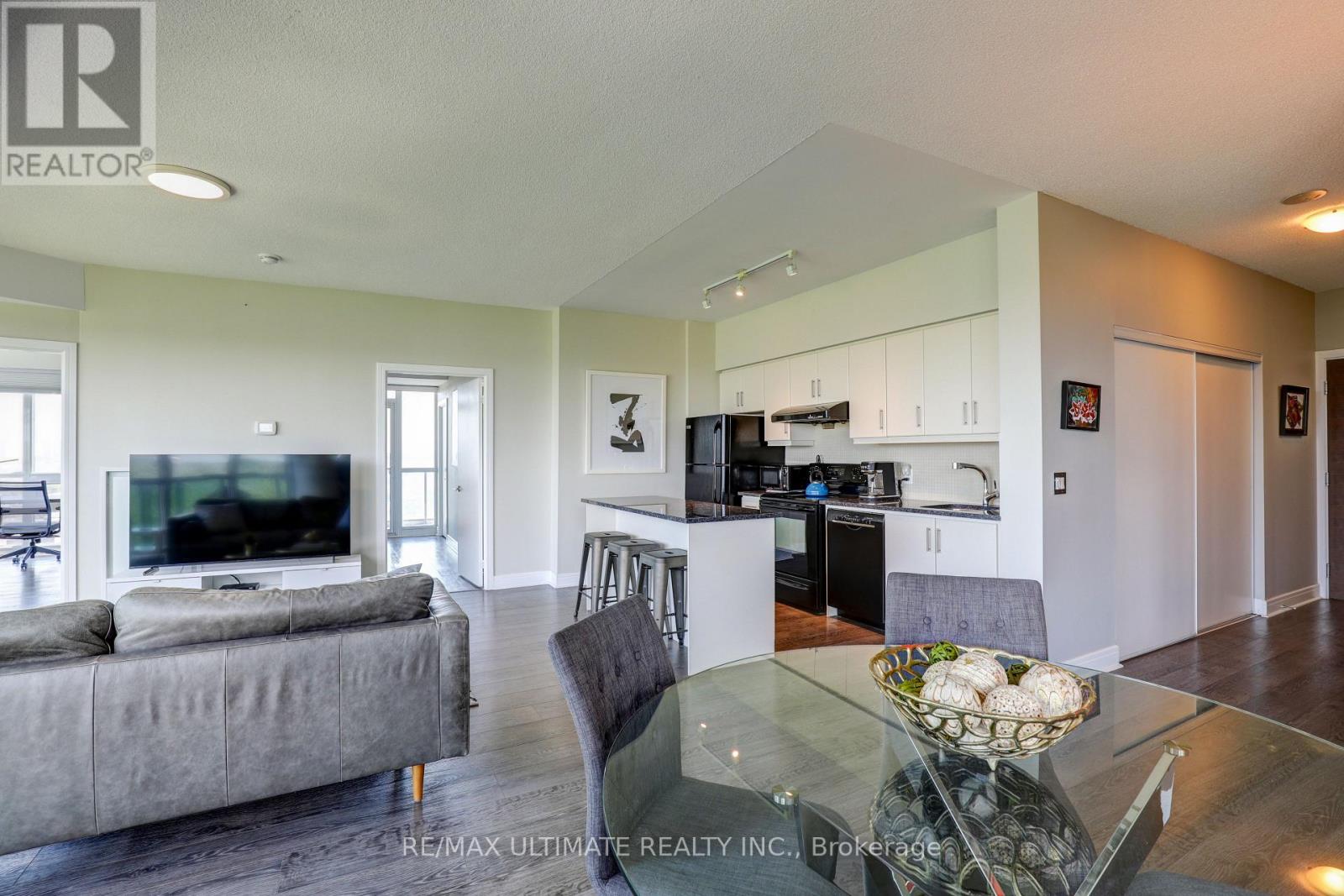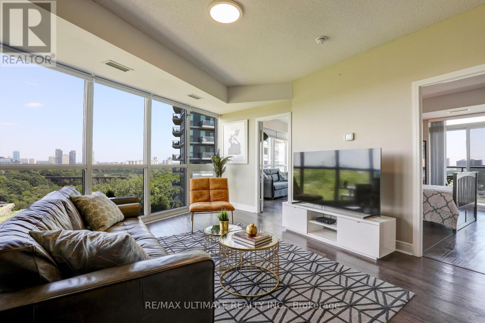 Scenic On Eglinton! Exceptionally spacious 1,341 sq ft corner unit. 2 bedrooms plus large separate den, 2 full baths. 2 parking spaces, 2 lockers. This contemporary suite offers a generous open concept plan with floor-to-ceiling windows and two balconies. Unit entry has hallway, with double closet, that provides privacy before leading to impressive principal areas and spectacular view. Large living and dining room is perfect for entertaining, with a walkout to 1st balcony. Kitchen features granite counter & island with breakfast bar. Oversize, bright corner den has floor-to-ceiling windows on 2 sides. Primary bedroom has modern 3-pc ensuite bath, walk-in closet and walkout to private 2nd balcony! Split bedroom plan features 2nd bedroom with a walk-in closet and a walkout to the main balcony. 4-pc bath and laundry. Enjoy an unobstructed expansive view of natural greenery and nearby ravine. Great amenities include 24-hour concierge, gym, indoor pool, party/meeting room and more! Terrific Leaside location, easy access to Hwy 404 & 401, new Eglinton LRT. Wilket Creek & Sunnybrook Parks, Sunnybrook Hospital, short drive to Shops At Don Mills. Don't miss this rare, fabulous suite. (id:64974)
