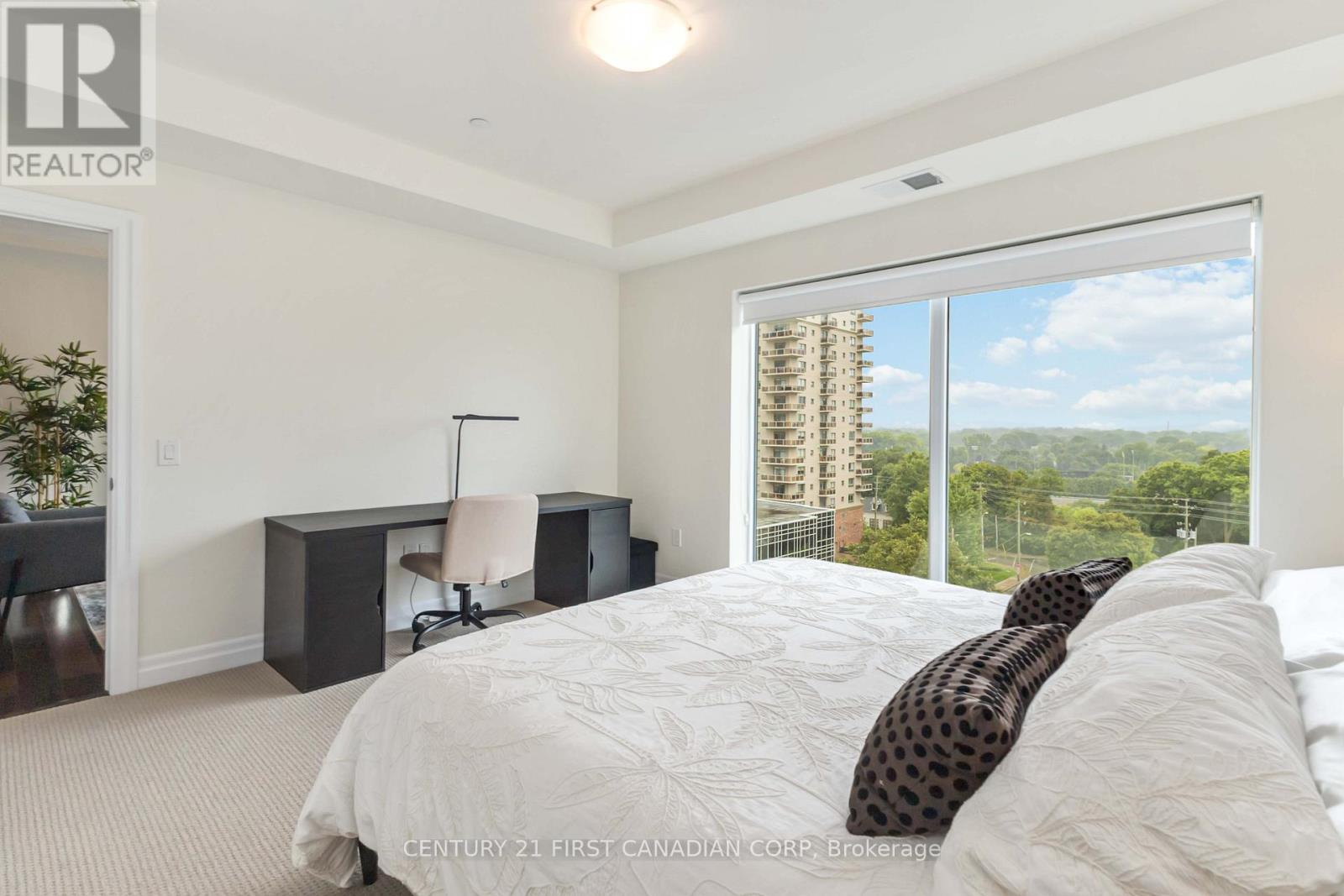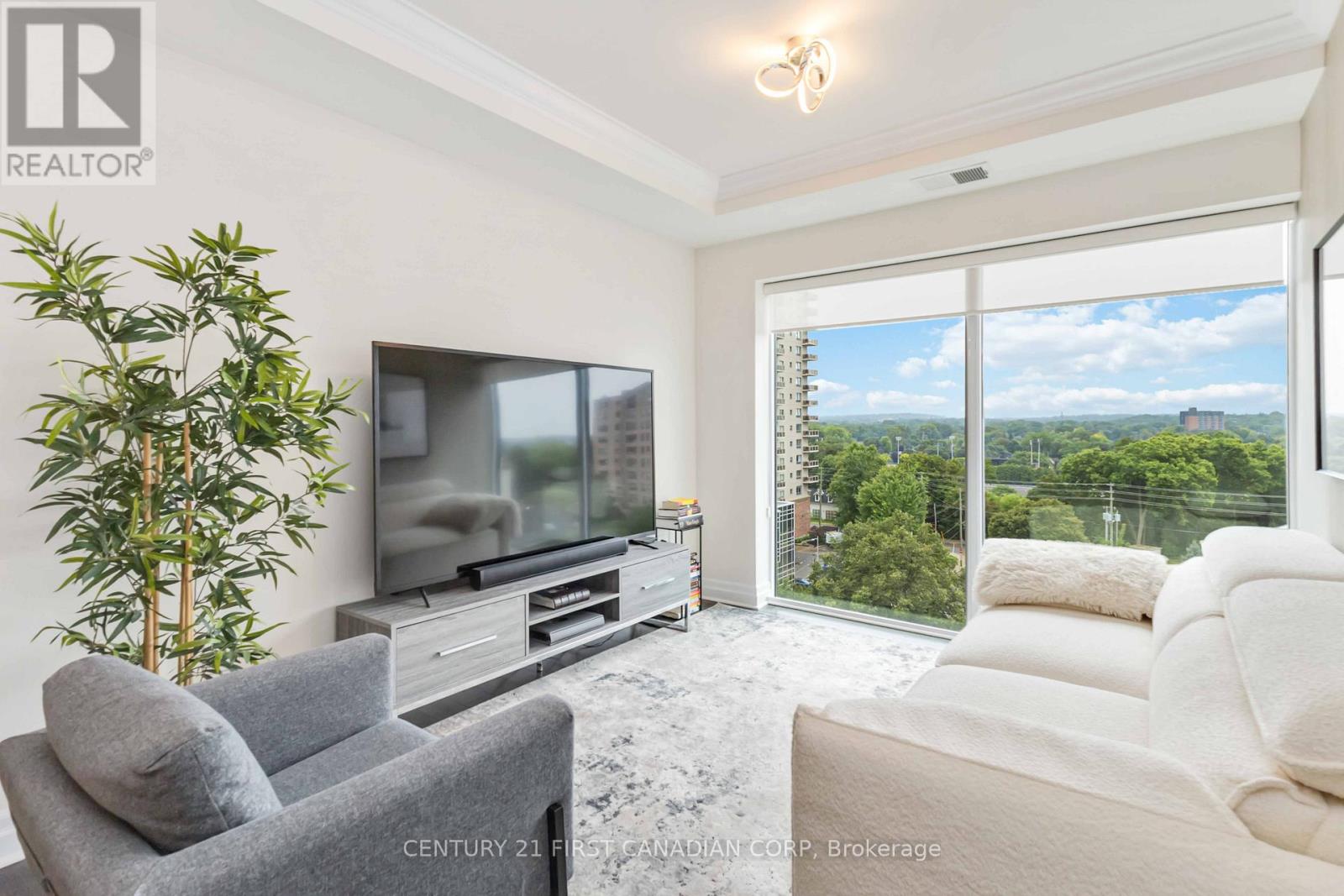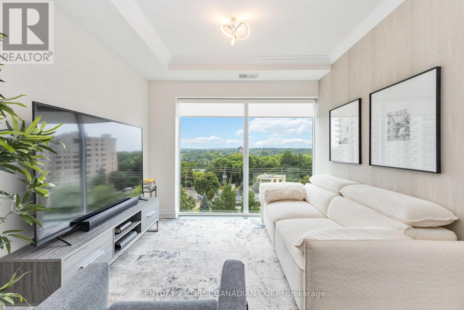 Welcome to elevated living at the Azure Condominiums situated in the heart of Downtown London. This spacious northwest-facing 2-bedroom + den corner suite offers 1,615 sq ft of open-concept living, with Floor-to-ceiling windows span the corner layout, flooding the home with natural light while offering sweeping views of the river and vibrant evening sunsets. Step out onto the large balcony, which easily accommodates a full patio set for outdoor dining and entertaining.The thoughtfully designed kitchen features a modern backsplash, a large quartz island, and generous space between the island and countertops perfect for entertaining, allowing guests to move comfortably and enjoy casual meals without feeling crowded. The open layout flows seamlessly into the living and dining areas, while the spacious den offers a private room ideal for a home office, guest room, or personal retreat. A built-in vertical wall bed in the den adds both functionality and flexibility, and it will remain with the home as part of the purchase. Residents enjoy exclusive access to luxurious rooftop amenities including a Library, Lounge, Golf Simulator, Private Dining Room, and a fitness centre. The rooftop terrace offers breathtaking city views, complete with BBQs, gas fire pits, and plenty of seating perfect for relaxing or hosting gatherings. Enjoy the rare downtown perk of an extra-wide end parking spot registered as one space, but spacious enough to fit two vehicles. (id:64974)