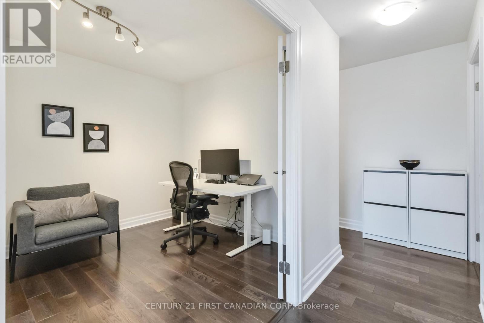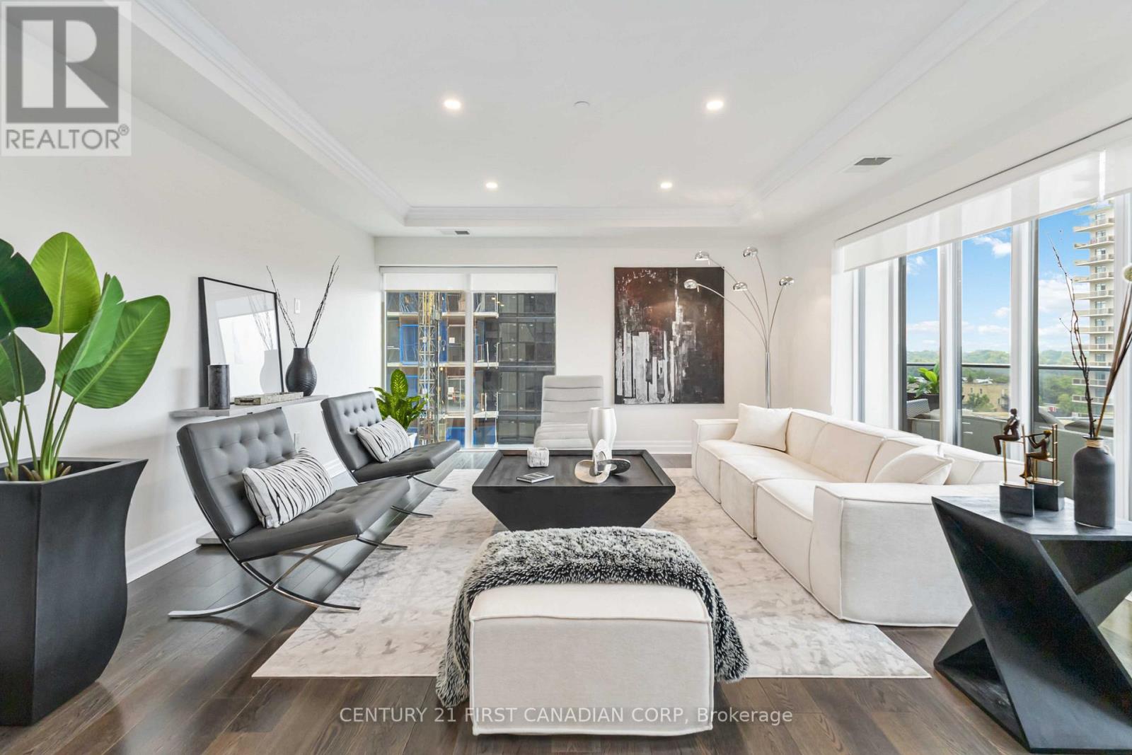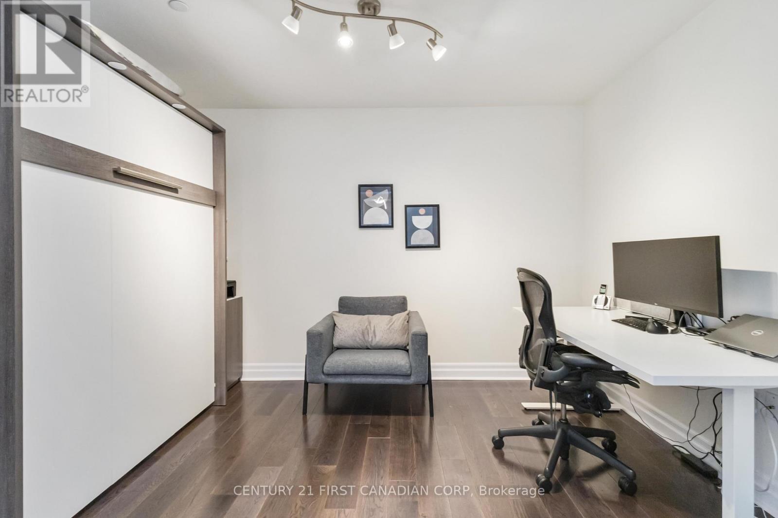 Welcome to elevated living at the Azure Condominiums situated in the heart of Downtown London. This spacious northwest-facing 2-bedroom + den corner suite offers 1,615 sq ft of open-concept living, with Floor-to-ceiling windows span the corner layout, flooding the home with natural light while offering sweeping views of the river and vibrant evening sunsets. Step out onto the large balcony, which easily accommodates a full patio set for outdoor dining and entertaining.The thoughtfully designed kitchen features a modern backsplash, a large quartz island, and generous space between the island and countertops perfect for entertaining, allowing guests to move comfortably and enjoy casual meals without feeling crowded. The open layout flows seamlessly into the living and dining areas, while the spacious den offers a private room ideal for a home office, guest room, or personal retreat. A built-in vertical wall bed in the den adds both functionality and flexibility, and it will remain with the home as part of the purchase. Residents enjoy exclusive access to luxurious rooftop amenities including a Library, Lounge, Golf Simulator, Private Dining Room, and a fitness centre. The rooftop terrace offers breathtaking city views, complete with BBQs, gas fire pits, and plenty of seating perfect for relaxing or hosting gatherings. Enjoy the rare downtown perk of an extra-wide end parking spot registered as one space, but spacious enough to fit two vehicles. (id:64974)