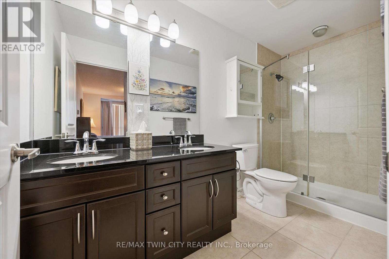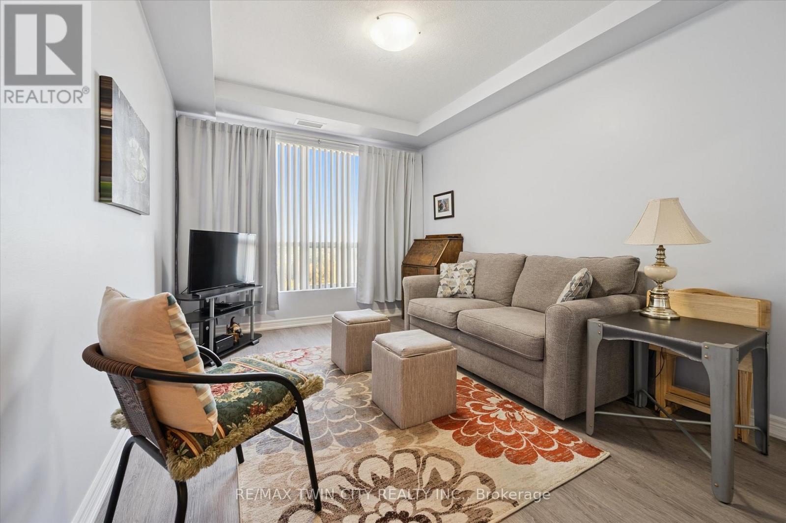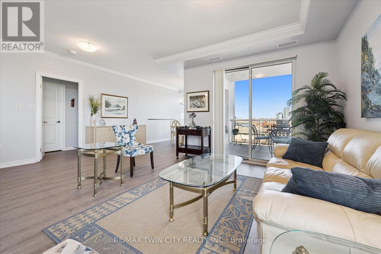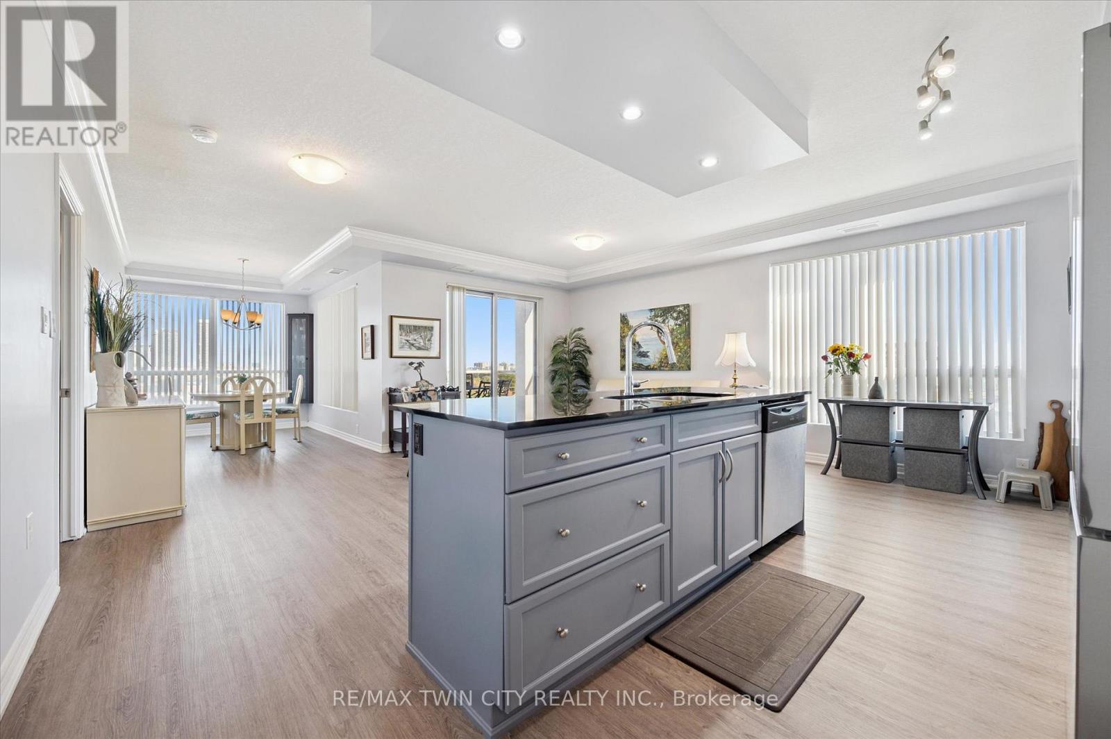 Come and experience care-free living in Belmont Village Condominiums, a beautiful and very well-kept building. Unit 809 offers a spacious, open-concept kitchen/dining room/living room layout with updated luxury wide-plank flooring in the main living space as well as both bedrooms. Step inside the unit and appreciate the built-in cabinetry and large coat closet as well as ceramic tile flooring in the entryway, laundry room and both bathrooms. Freshly painted throughout, this unit shows so well and is truly move-in ready. The laundry room has a newer stackable washer/dryer set (2024) plus room for a second fridge and storage space. The white kitchen has newer stainless fridge, stove and microwave, granite counters, an island with extra prep space, and plenty of storage. This corner unit is bright with lots of natural light and 180 degree views of the city. The balcony is east-facing providing a view of the morning sunrise, as well as covered afternoon shade - perfect for relaxing anytime of day. The large primary bedroom has a walk-in closet and ensuite bathroom with double sinks and walk-in shower. A second bedroom doubles as a den and guest space. One underground parking space that is close to the building entrance plus lots of visitor parking outside. Building amenities include: party/games room, media room, exercise room, guest suite, community BBQ on the patio. Condo fees include: heat, air conditioning, and water. Centrally located and walkable to all the shops and restaurants in Belmont Village, the Iron Horse Trail, and quick access to Uptown Waterloo or Downtown Kitchener. (id:64974)